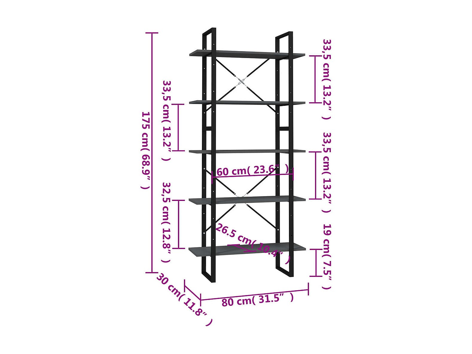 Edith Boekenkast met 5 schappen 80x30x175 cm bewerkt hout grijs