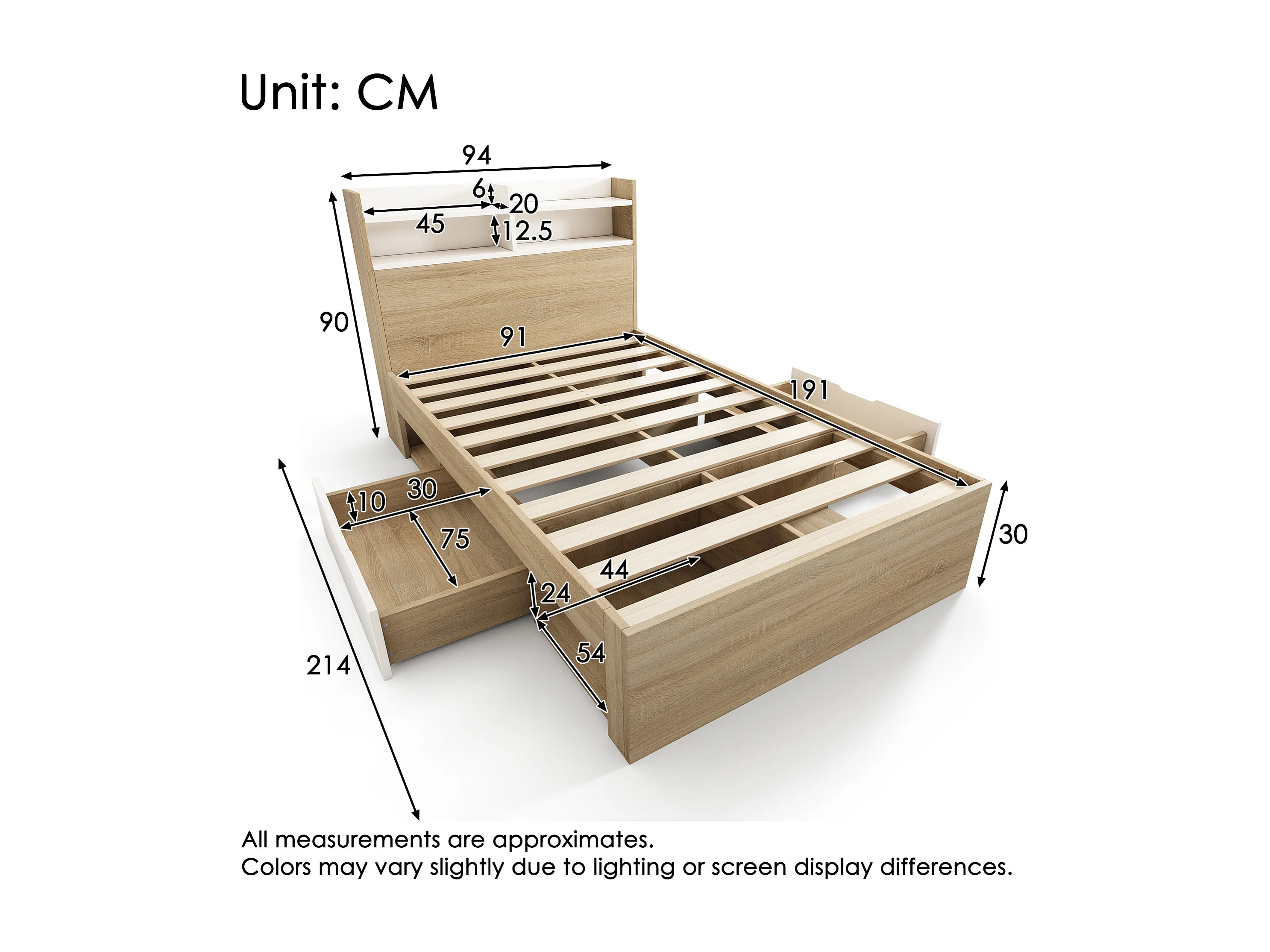 Eenpersoons houten bed - 90 x 190 cm - met opbergbaar hoofdeinde + 2 lades + open opbergruimte - hout - naturel + wit