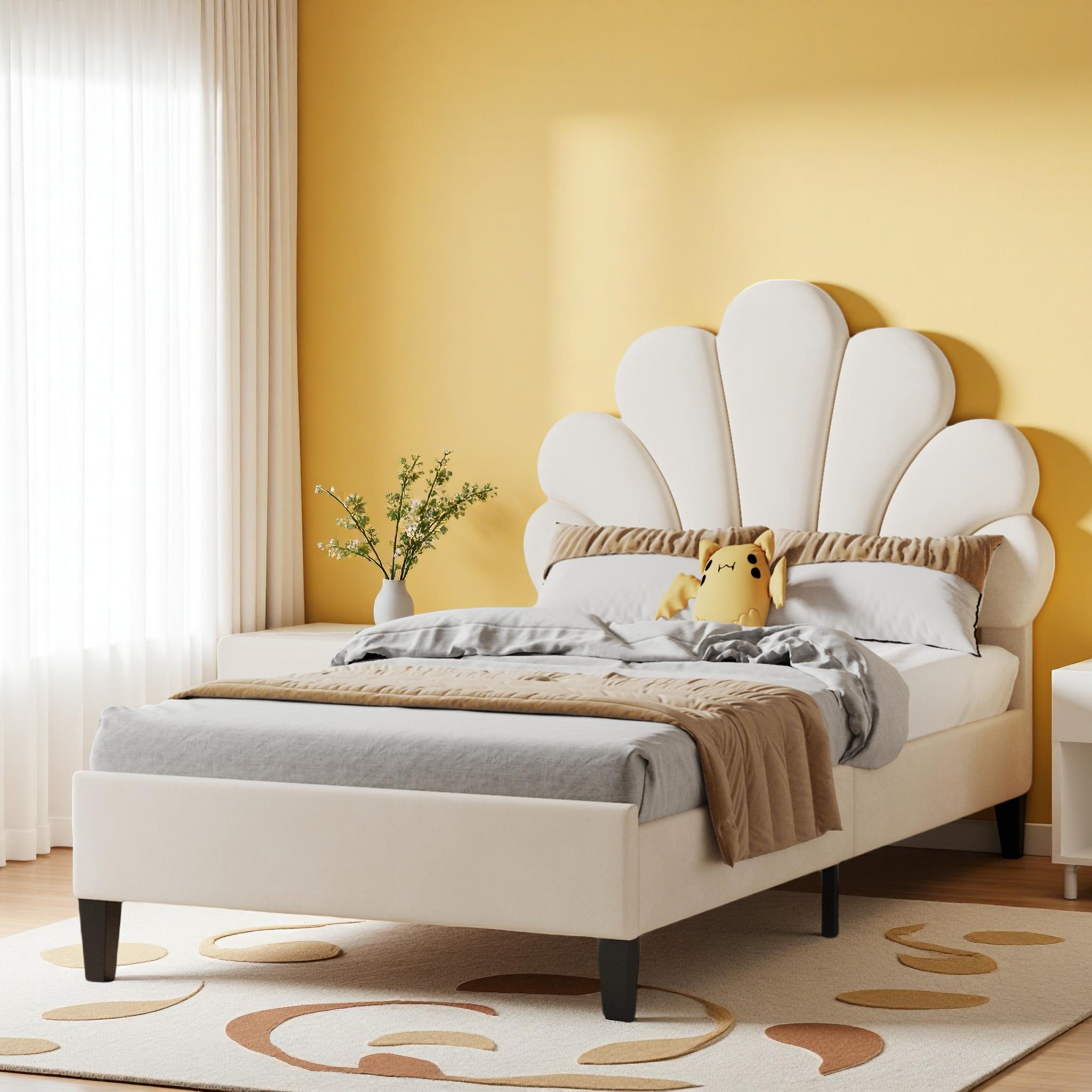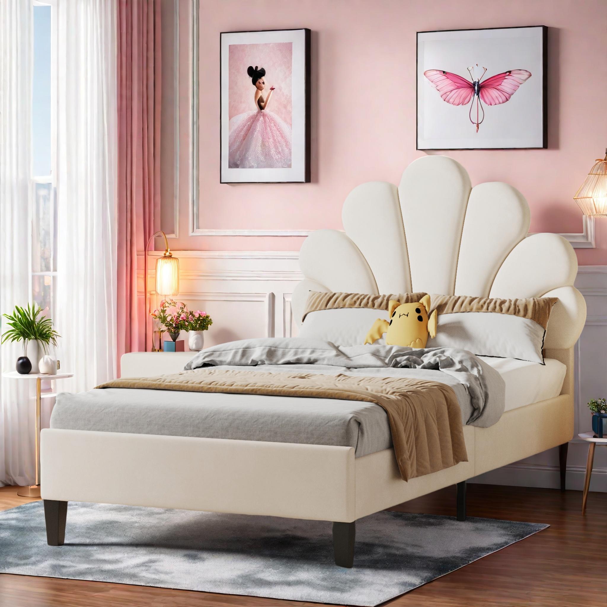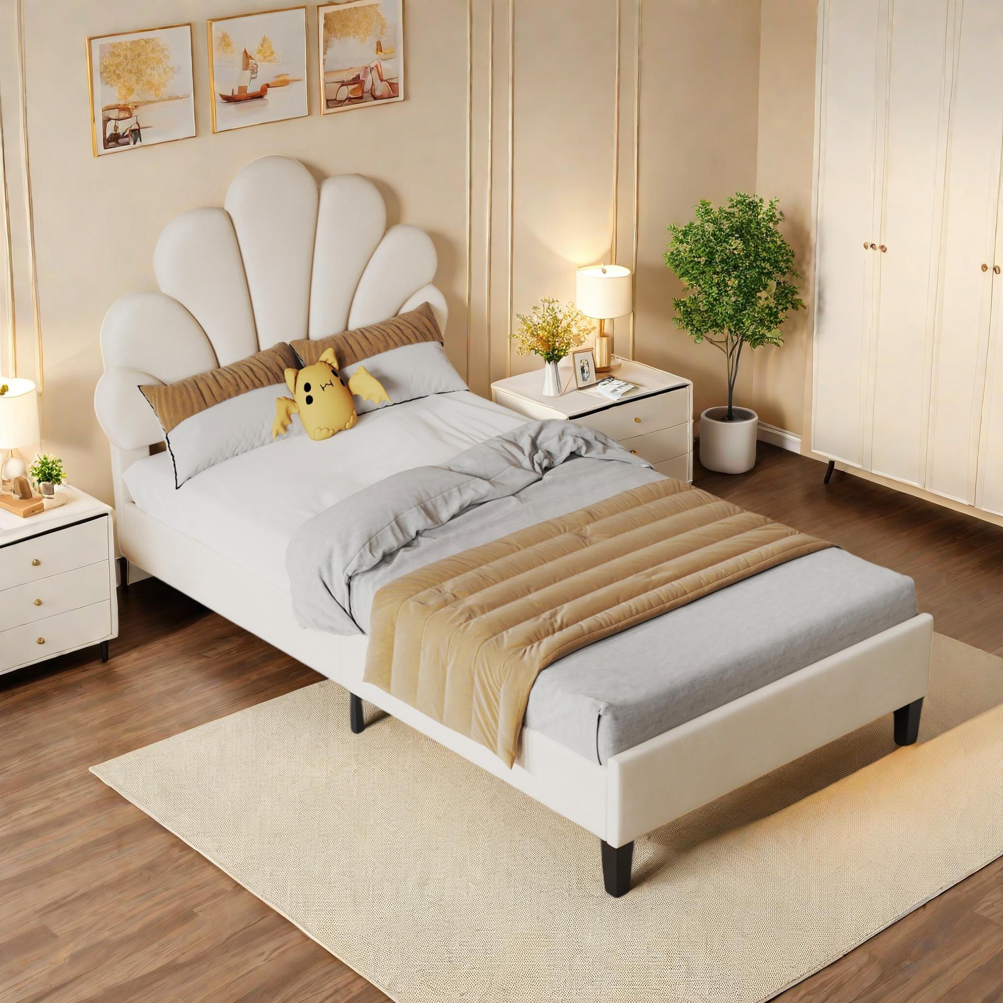 Eenpersoonsbed 90 x 200 cm, gestoffeerd, met bloemvormig hoofdbord en lattenbodem, stabiel bedframe, kinderbed, huidvriendelijk fluwelen bed, Beige