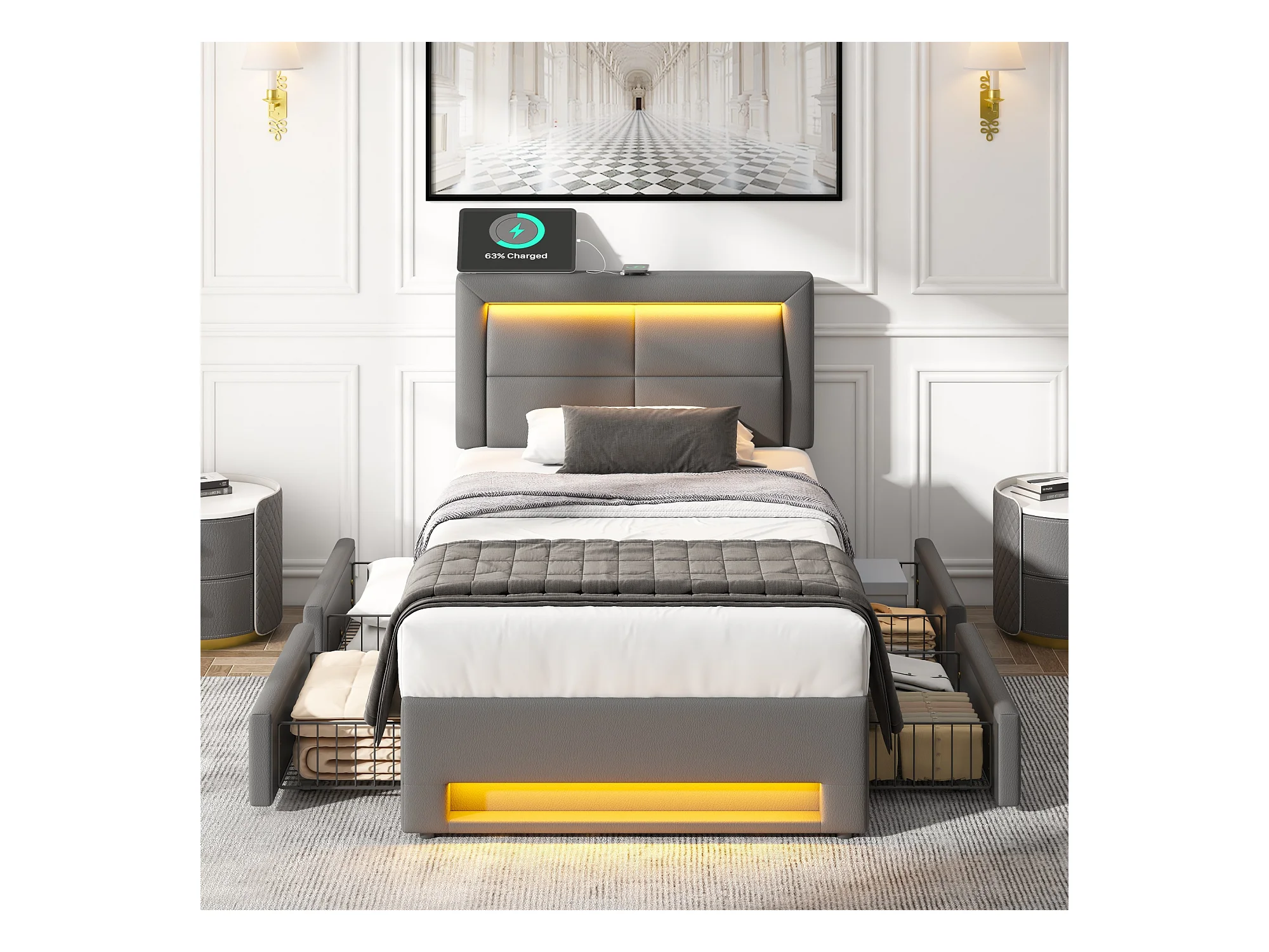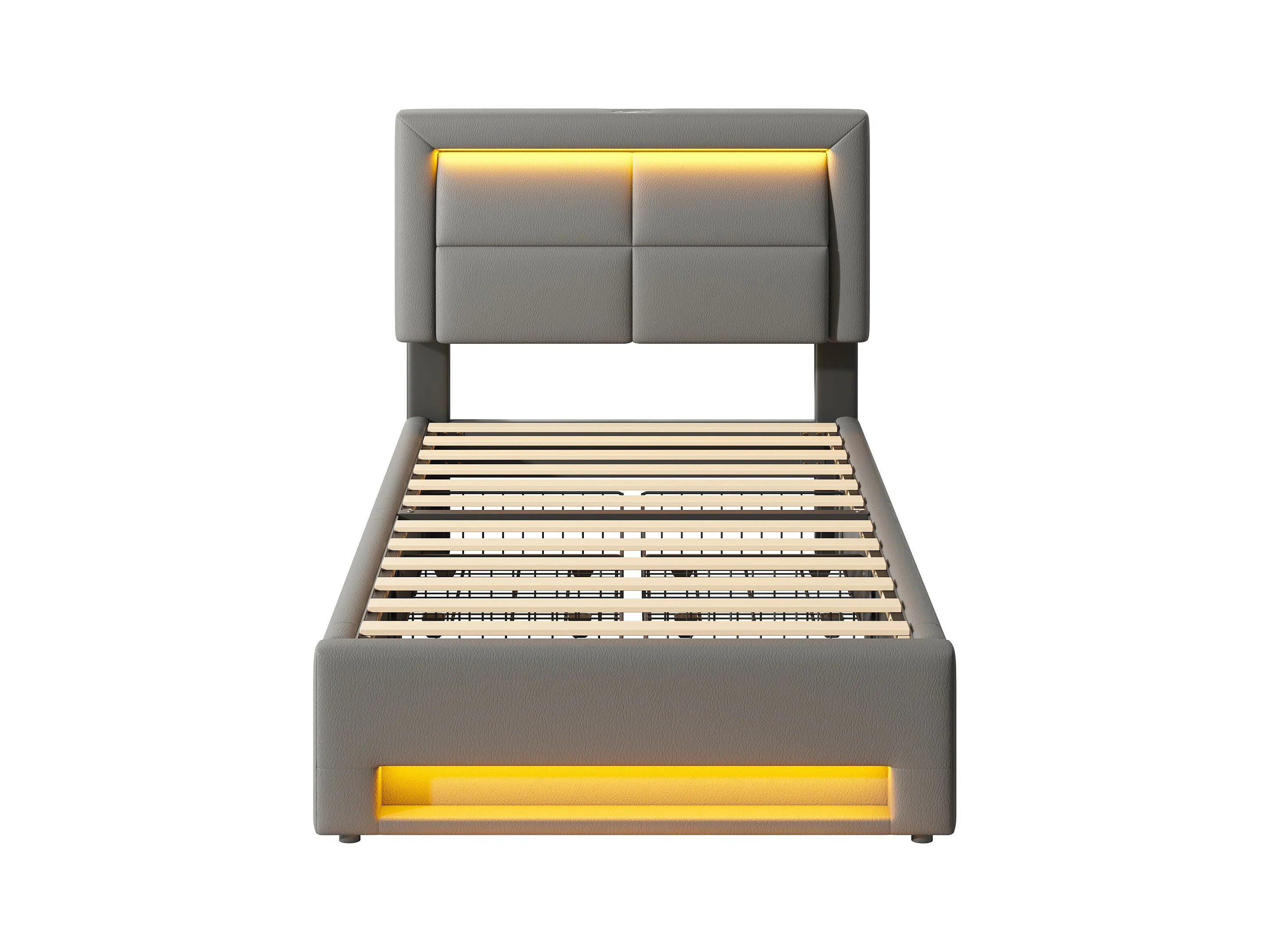 Eenpersoonsbed 90x200 cm met 4 lades - met USB en LED - grijs PU (zonder matras)