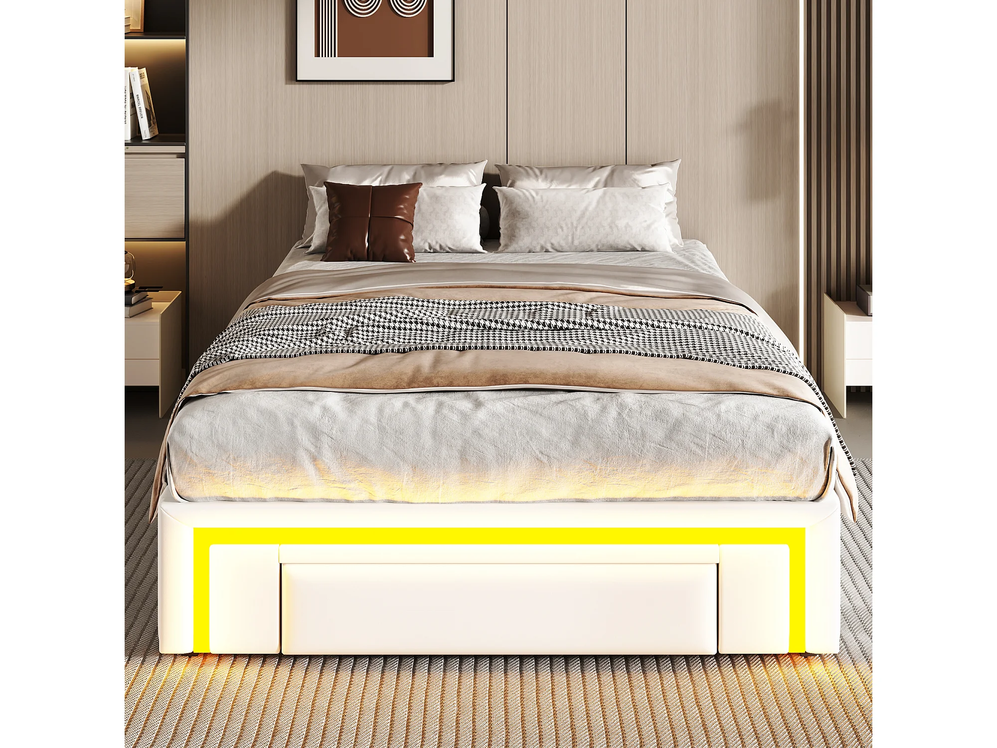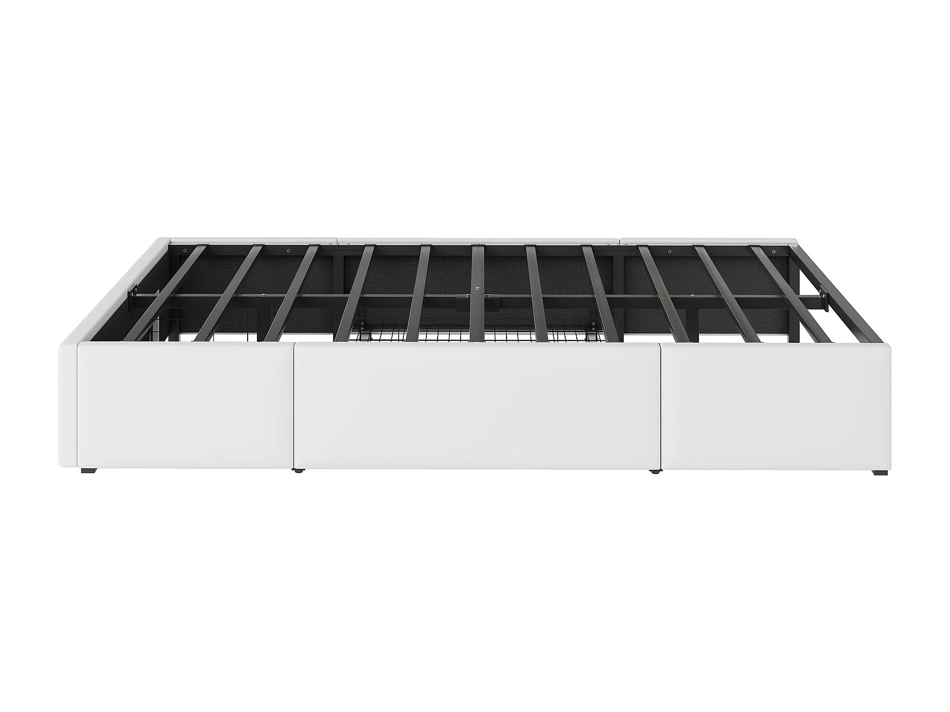 Eenpersoonsbed 90x200cm met 2 lades en ledverlichting - Witte PU-bekleding zonder hoofdbord - Metalen lattenbodem