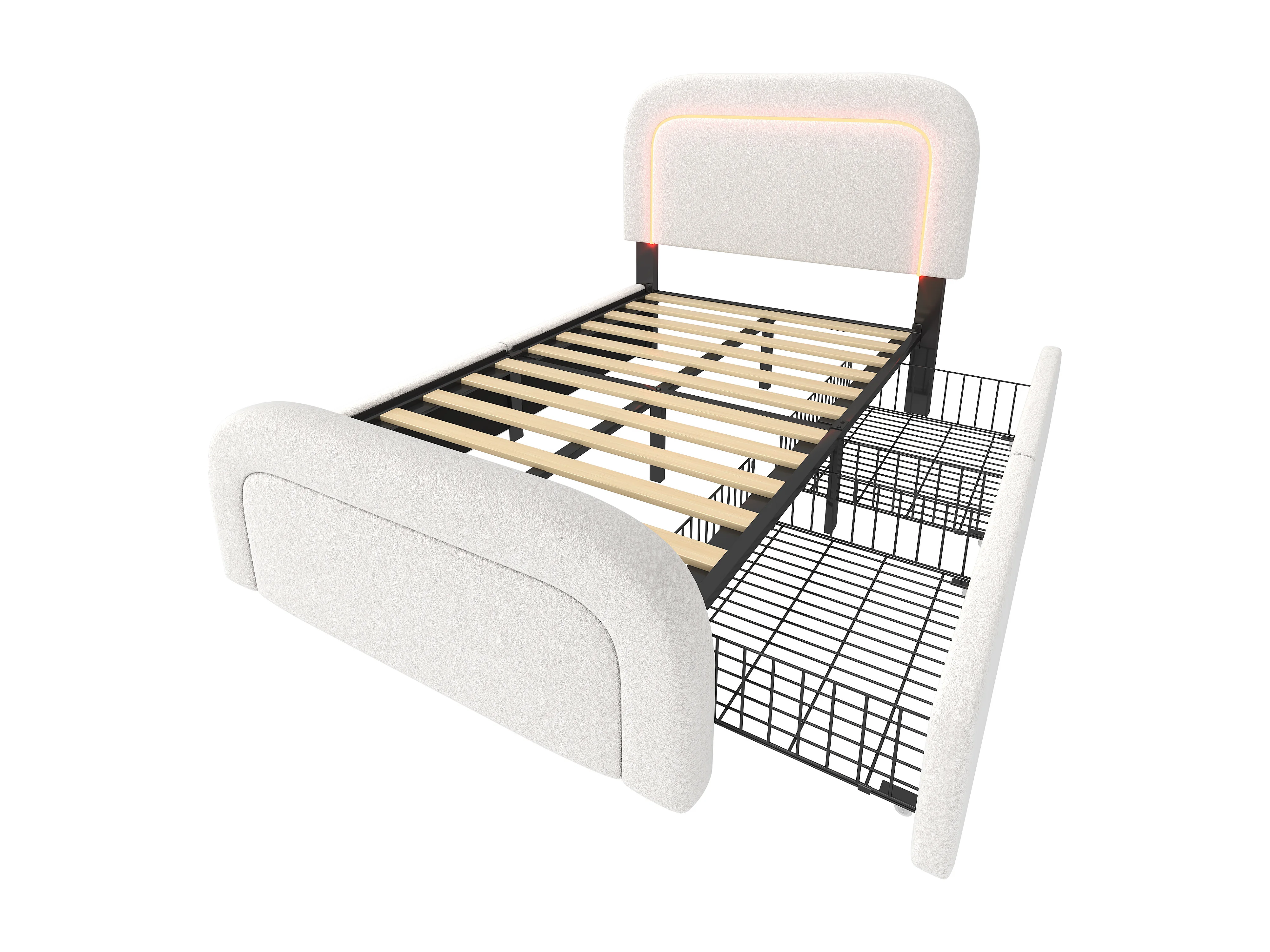 Eenpersoonsbed kinderbed 90x200cm met lattenbodem en 2 lades - verstelbaar hoofdeinde met USB en LED - sherpa - wit (zonder matras)