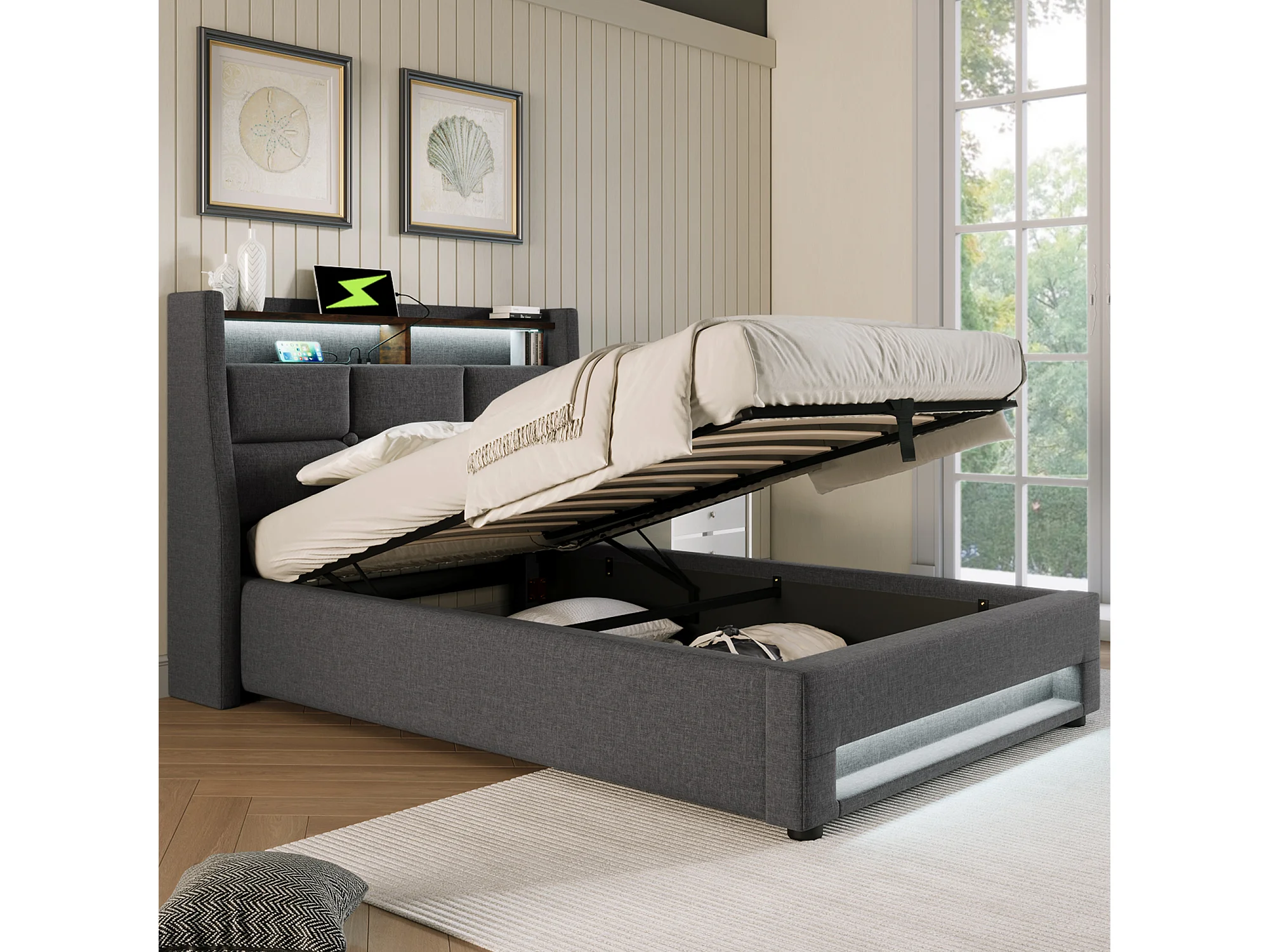 Gestoffeerd bed met hydraulische opbergruimte, op afstand bedienbare ledverlichting, USB/Type-C-aansluitingen, grijs linnen (222x166x111 cm)