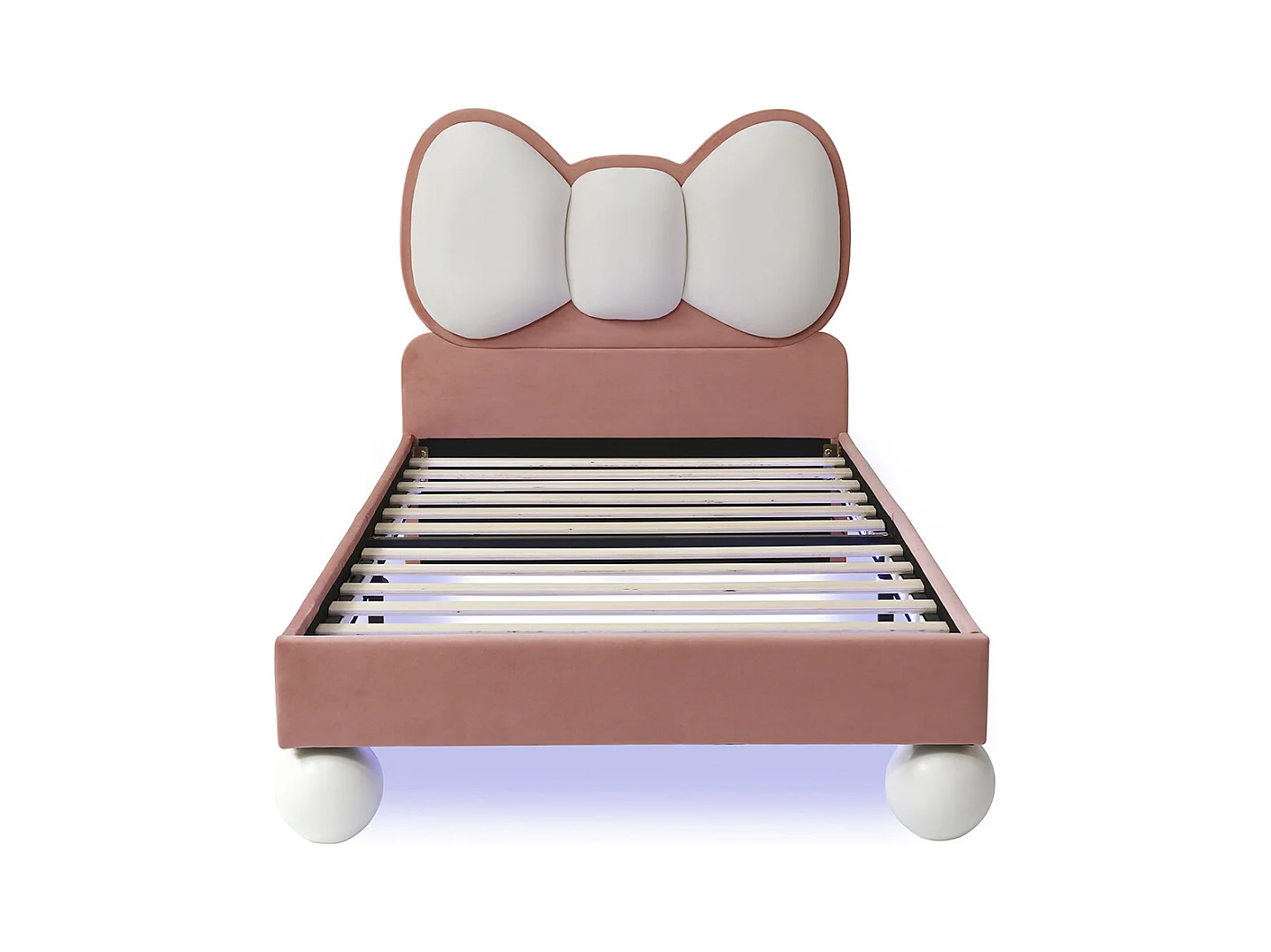 Eenpersoonsbed voor kinderen 90 x 200 cm, hoofdeinde in de vorm van een vlinder, ledstrip onder het bed met instelbare kleur, fluweel, beige + roze