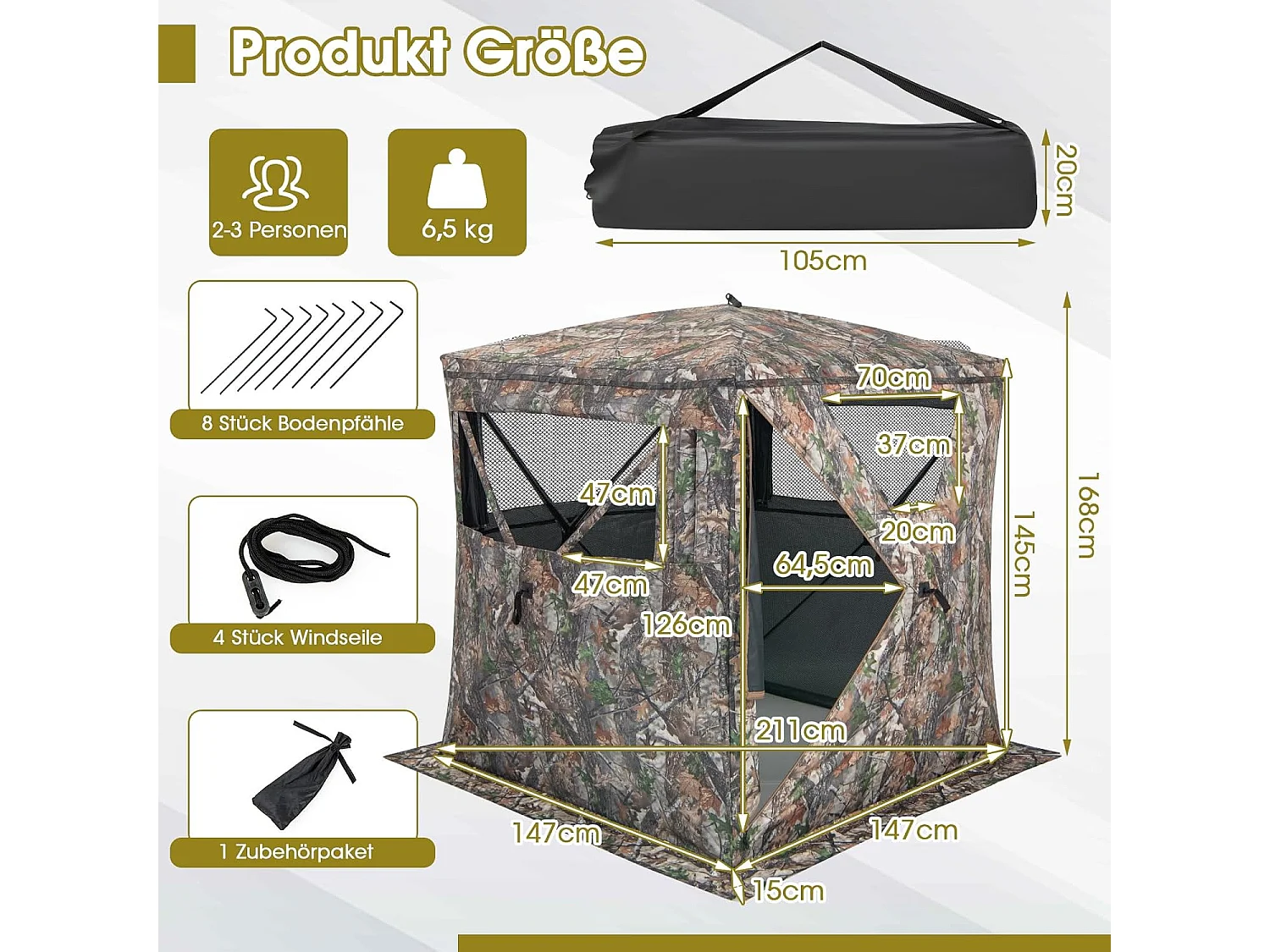 Eenzijdig doorzichtige 270° jachttent, pop-up schuilplaats voor 2-3 personen, jachtverstopplaats voor de jacht op herten en kalkoen, camouflage