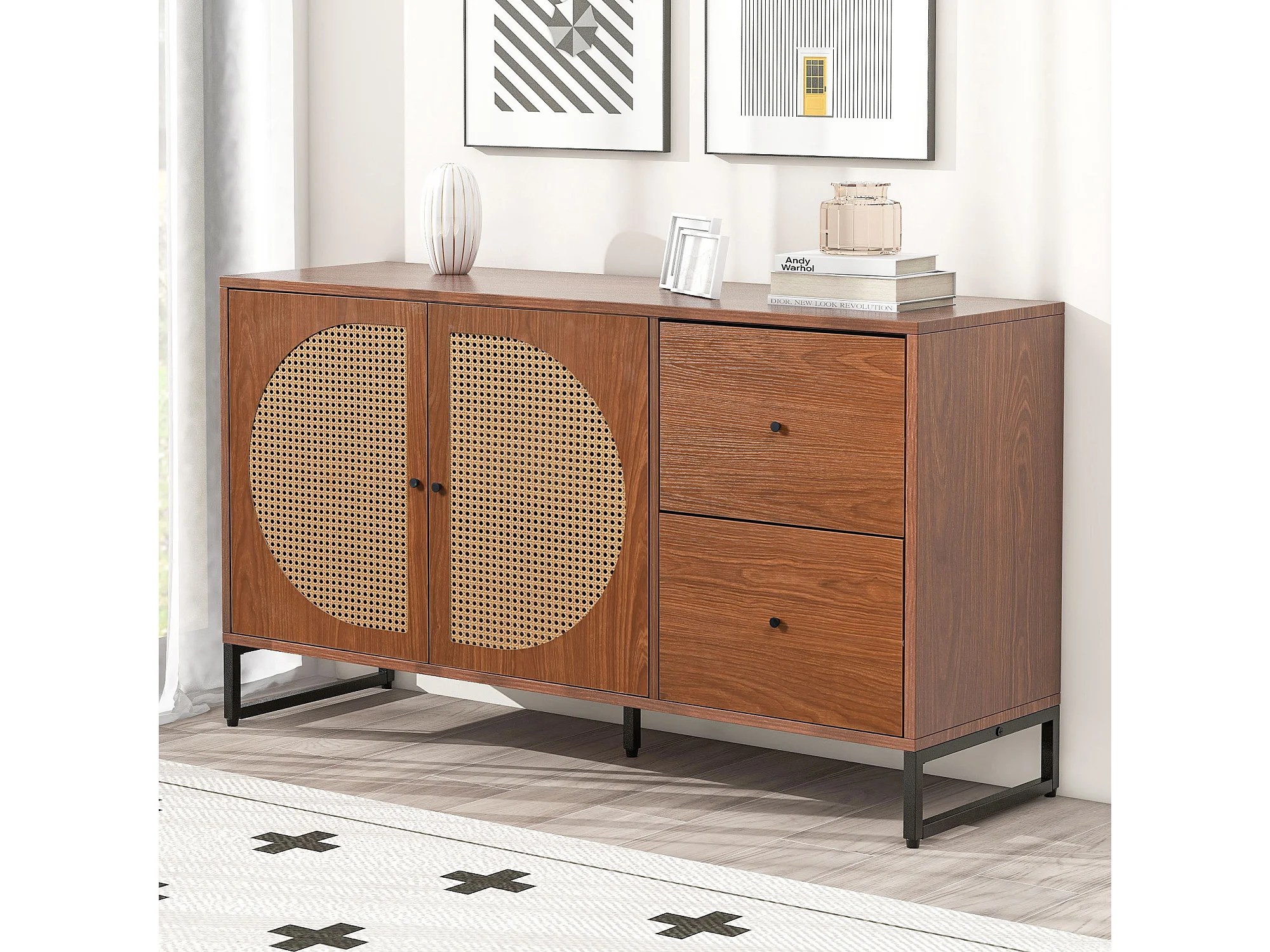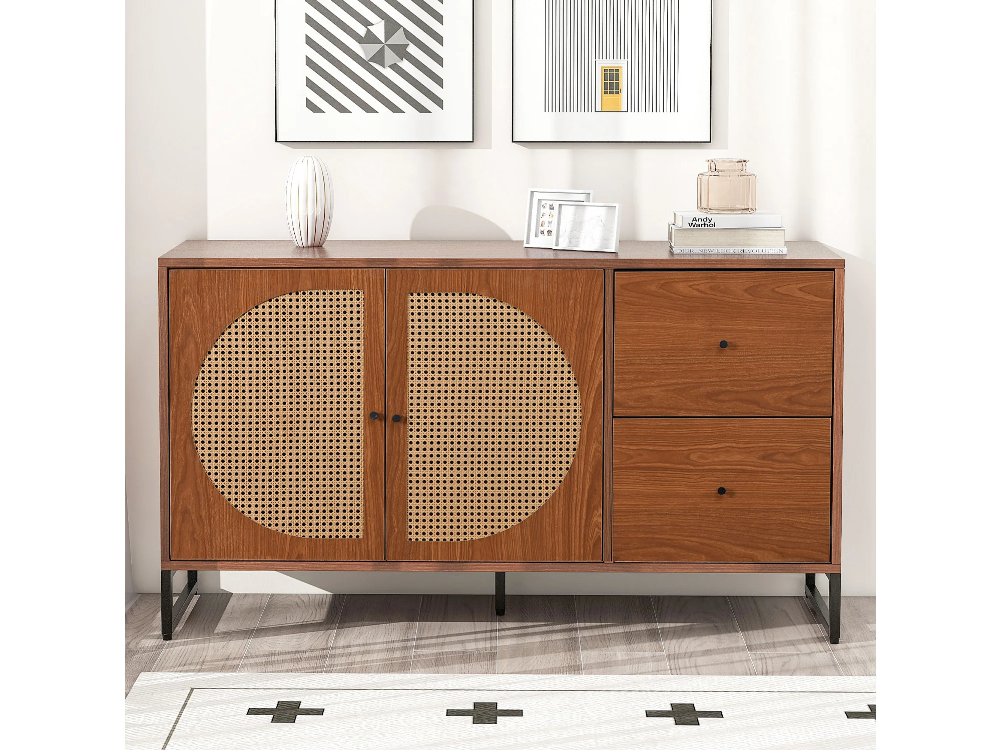 Eetkamerdressoir van hout met 2 rotandeuren en 2 opberglades - metalen handgrepen en poten - walnoot (130x40x75 cm)