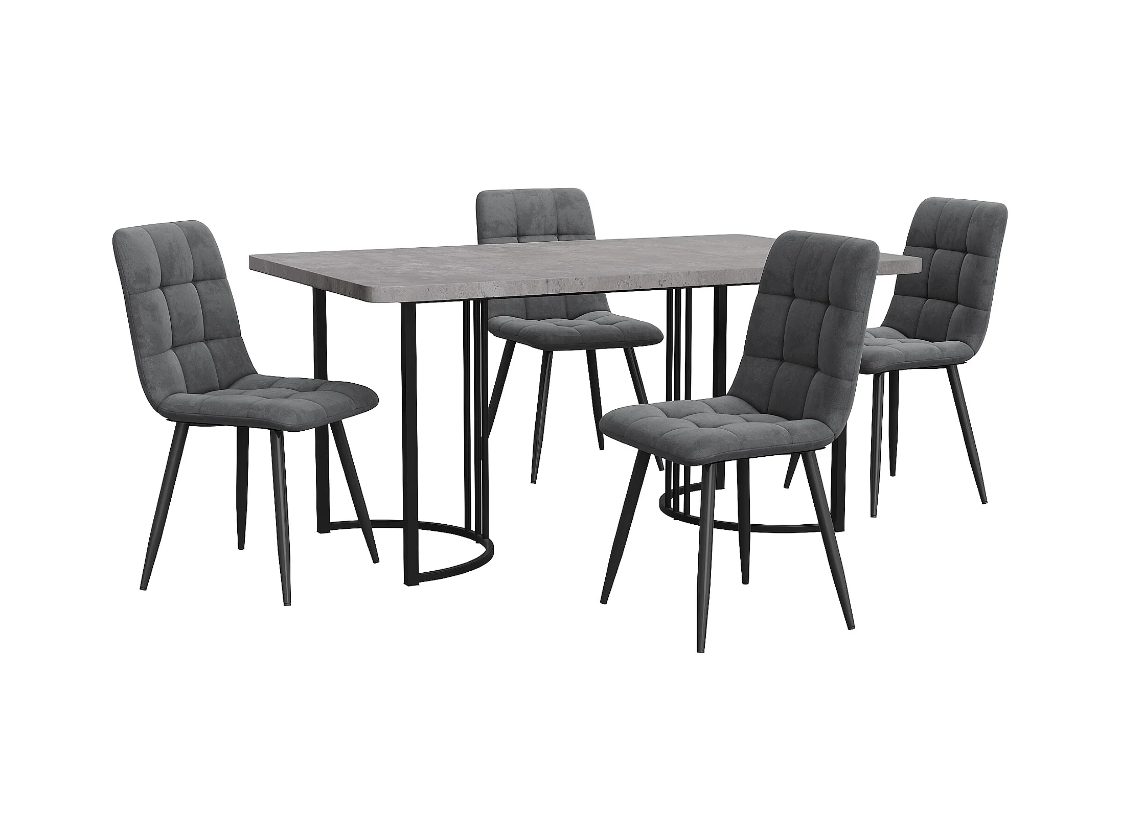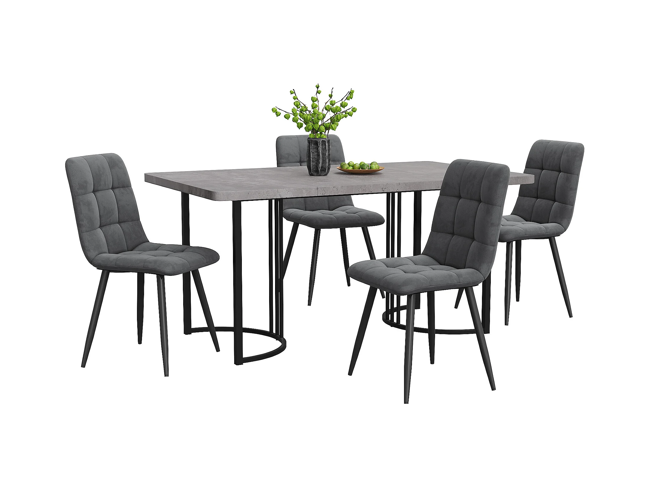 Eetkamerset van 5 stuks, tafel 140x80x75 cm in grijs MDF met zwarte metalen poten, 4 zwarte fluwelen stoelen met ruitpatroon