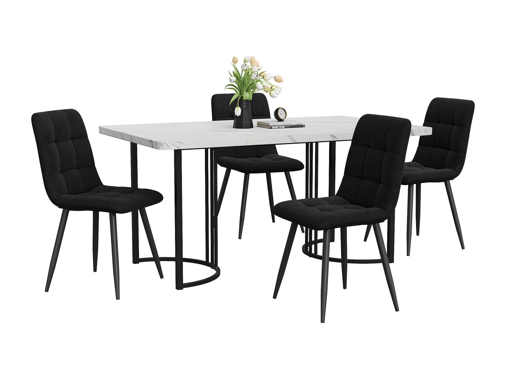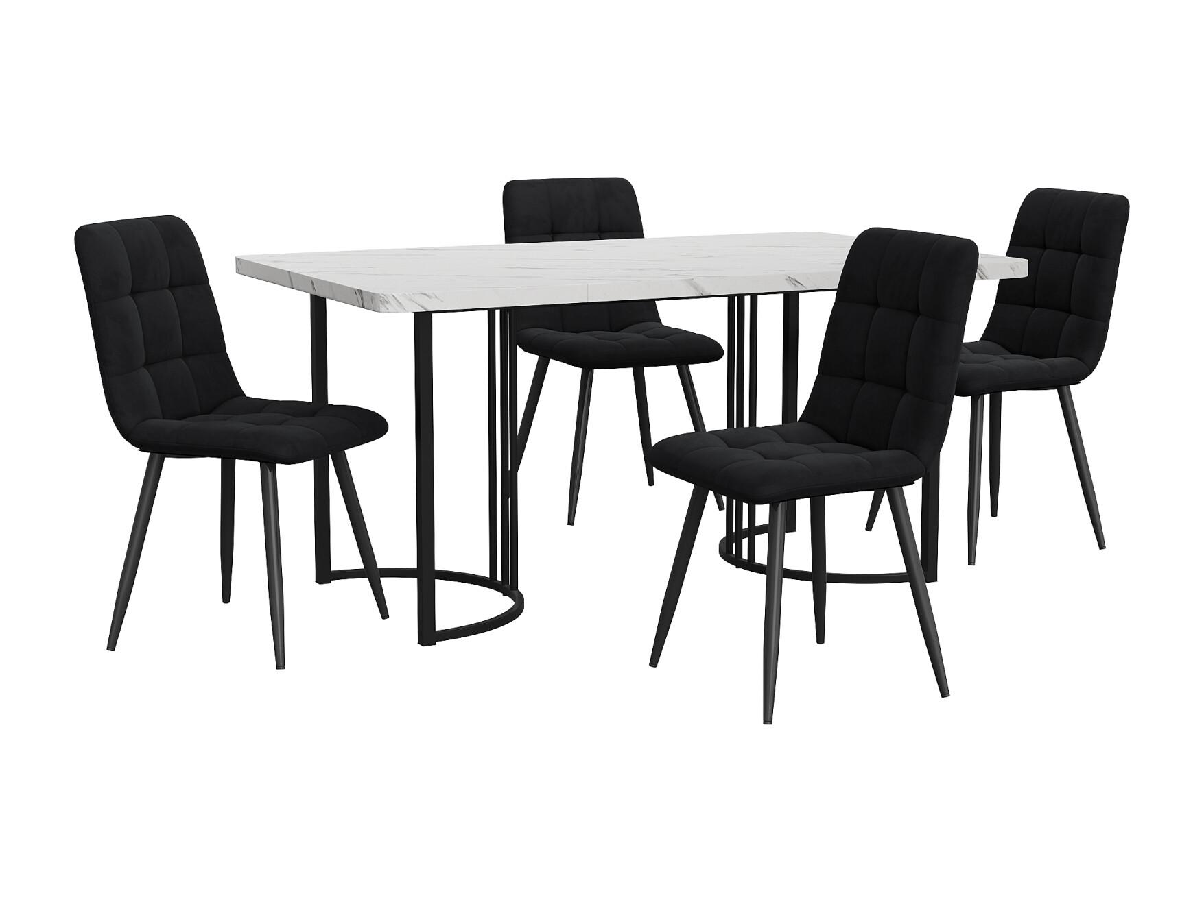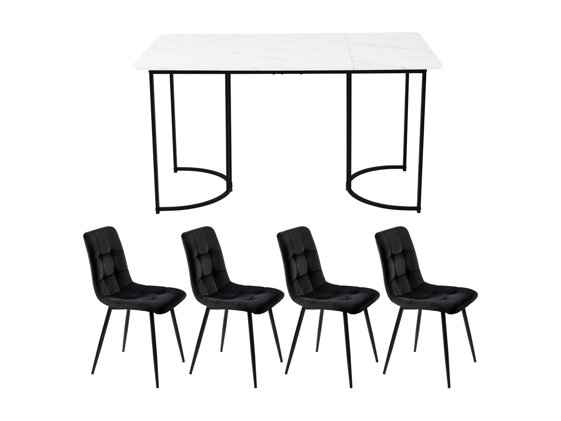 Eetkamerset van 5 stuks – tafel 140×80 cm, wit MDF-blad met zwarte metalen poten + 4 zwarte fluwelen stoelen, modern design