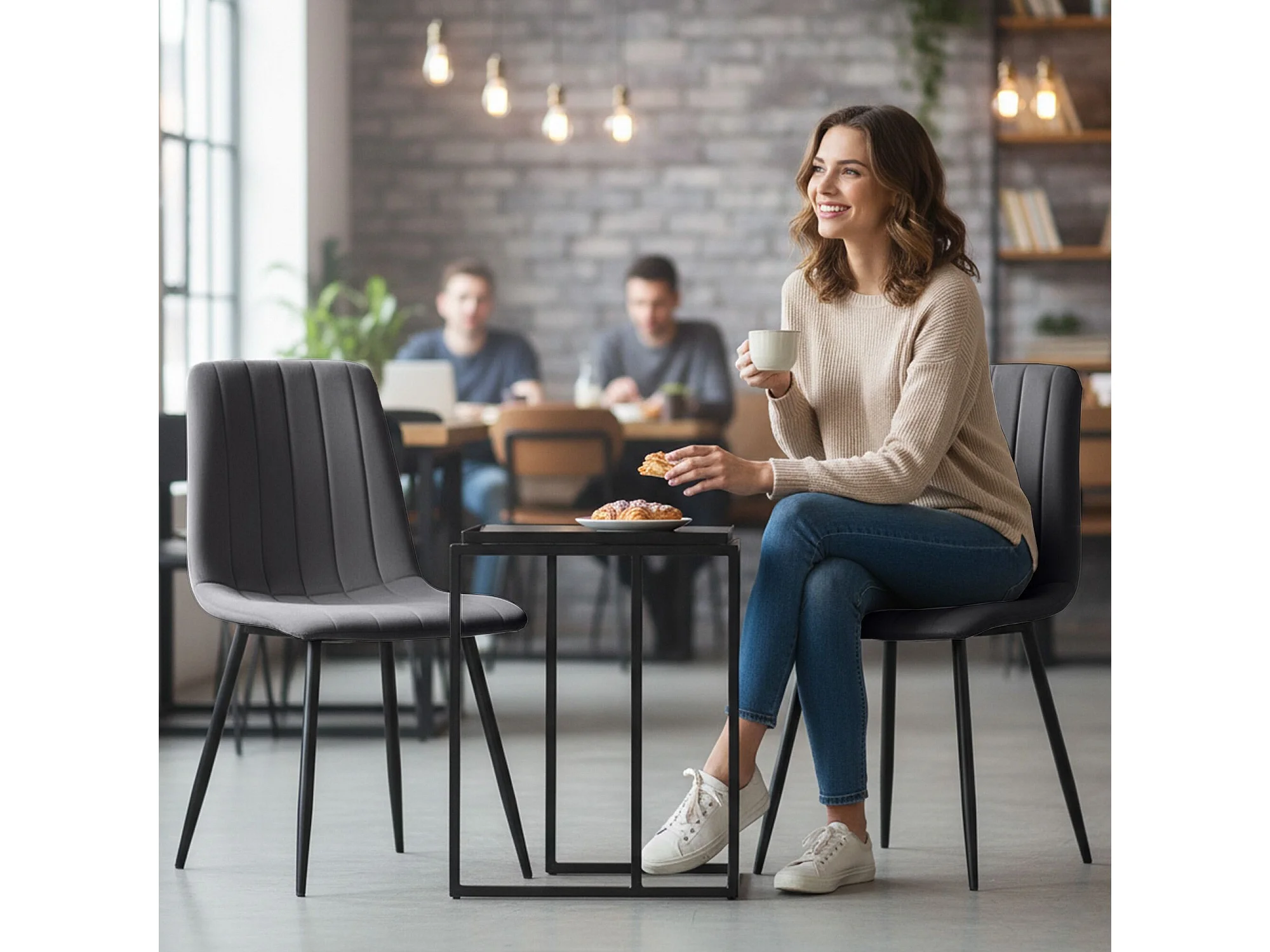 Eetkamerstoel LIVO / Gestoffeerde Stoelen / Fluwelen Stoelen en Metalen Poten / Antraciet met zwarte benen
