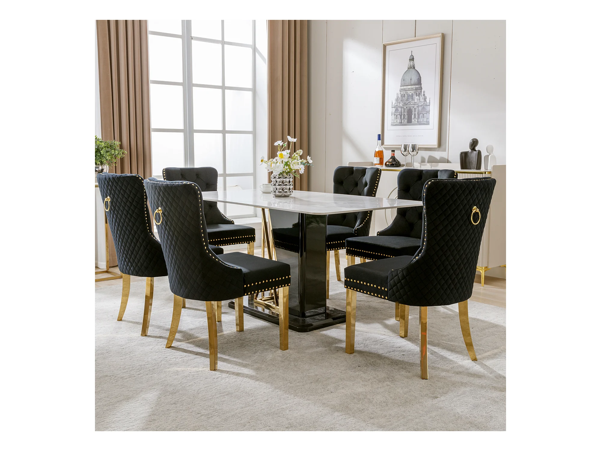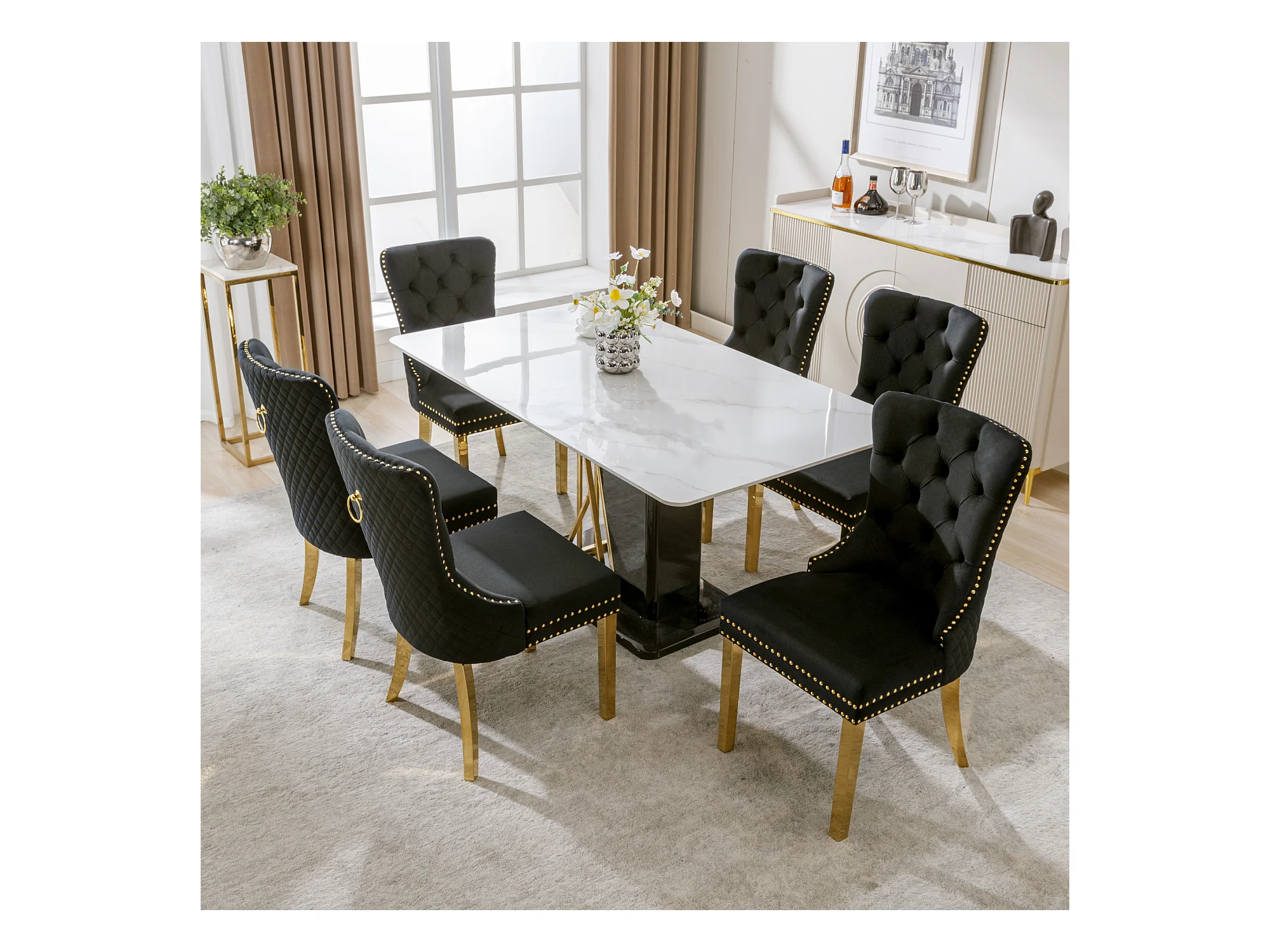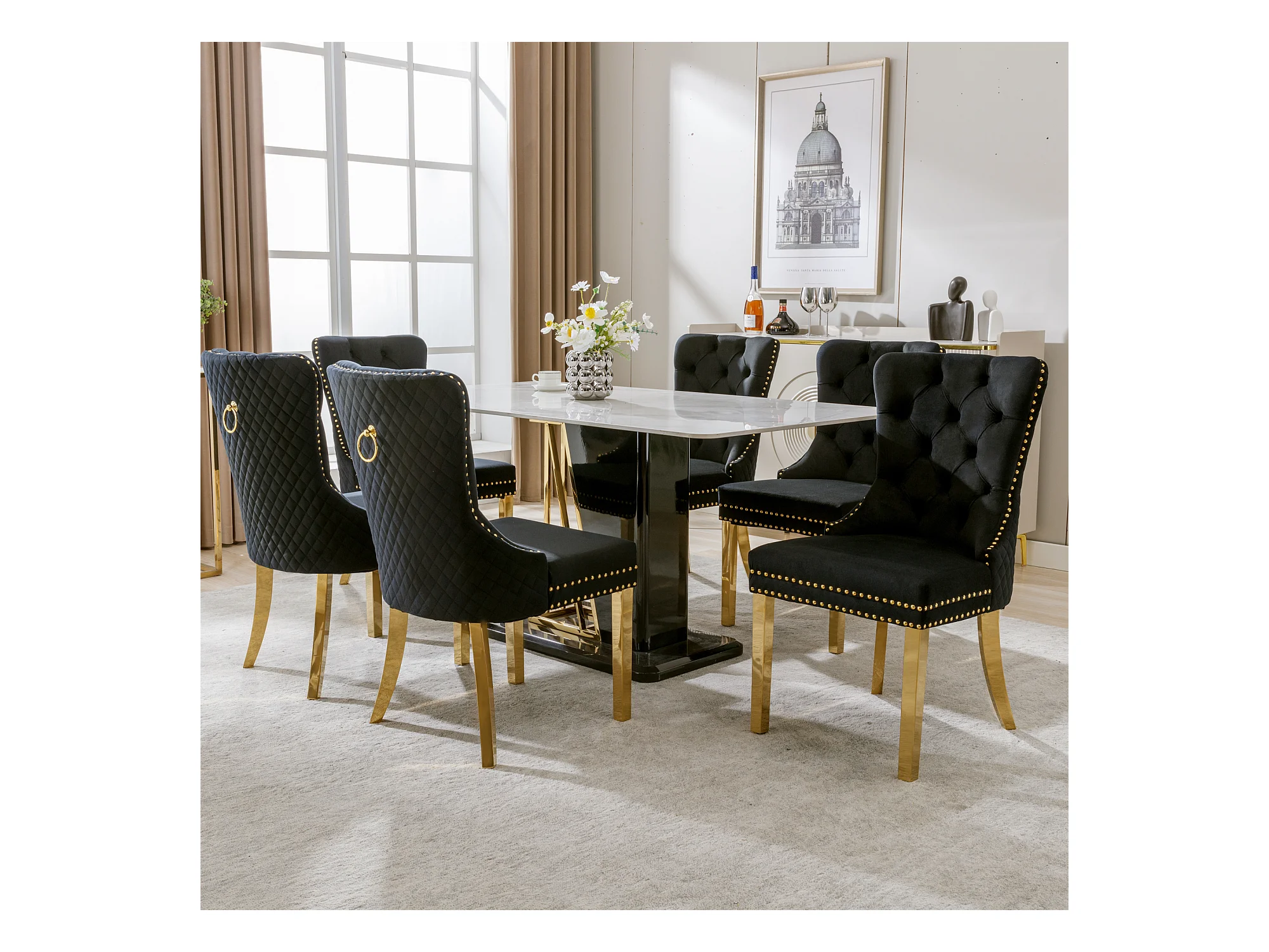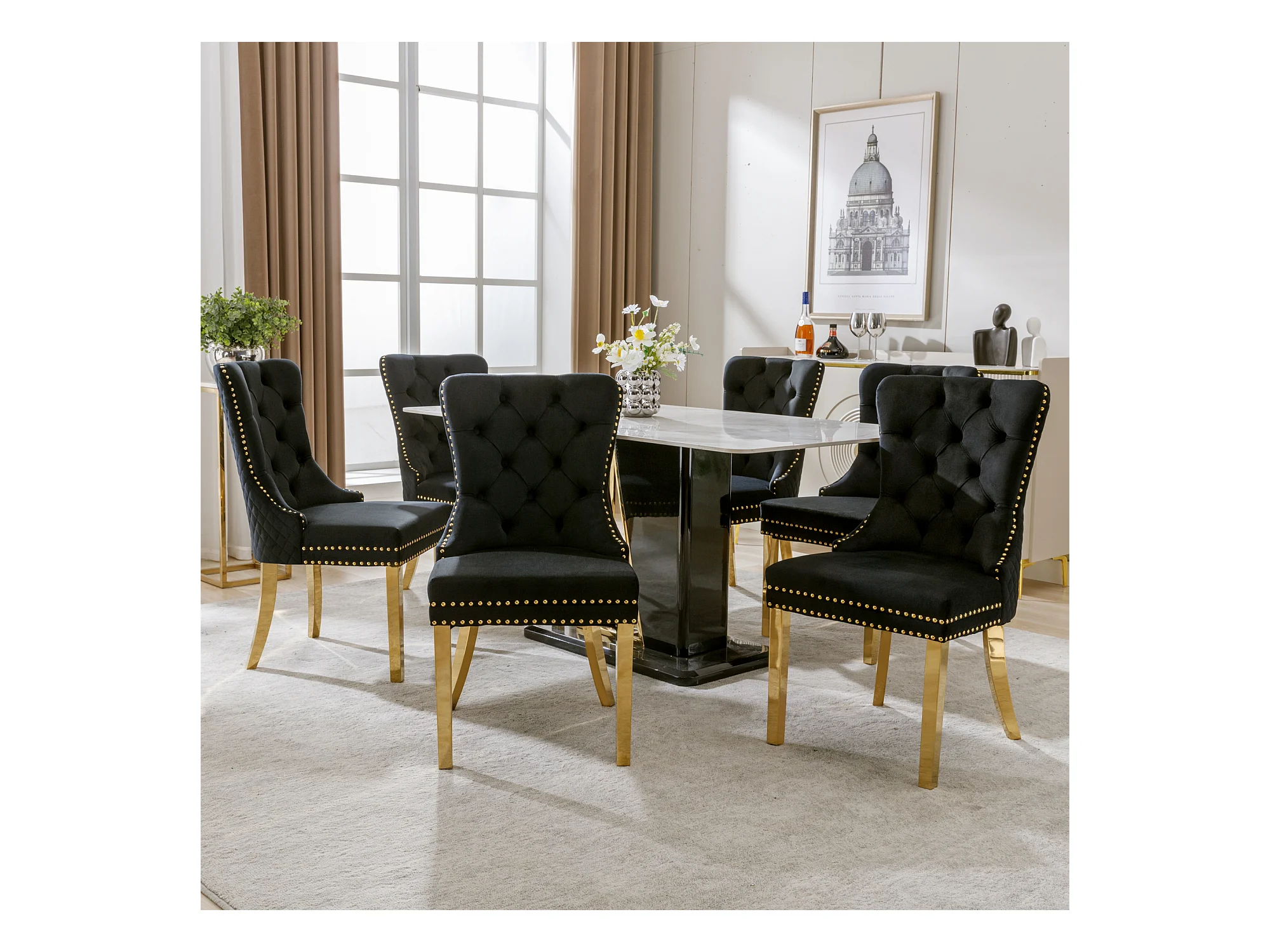 Eetkamerstoelset van 6, gestoffeerde stoel met spijkerkopafwerking, steunpoten van verguld roestvrij staal, fluweel, zwart/goud, met ronde trekringen