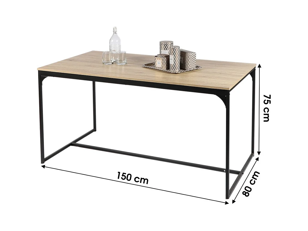 Eettafel in industriële stijl, collectie RANONG. Licht eikenkleur met zwart metalen poten, afmetingen 150x80xH75cm.