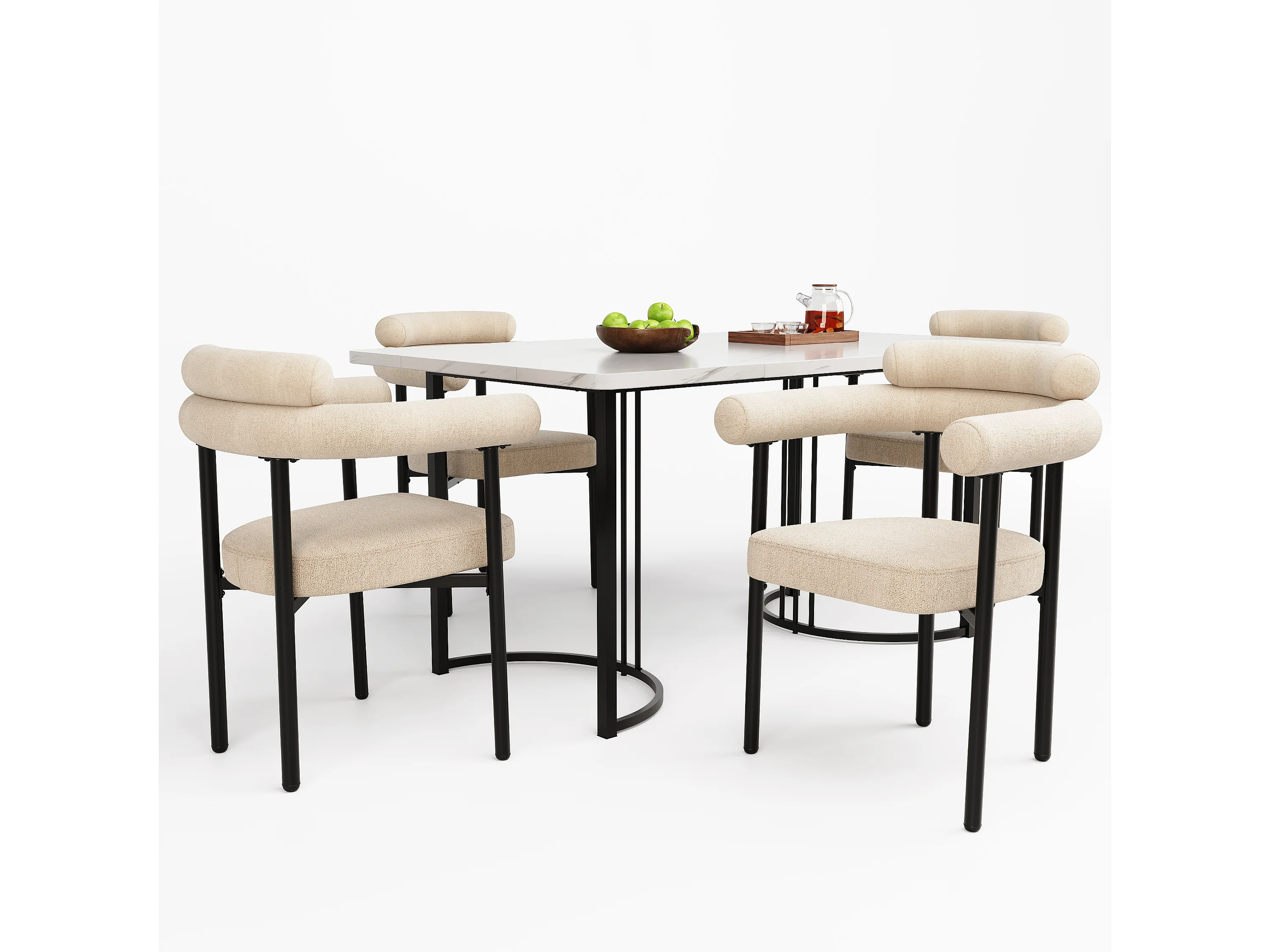 Eettafelset (140x80x75 cm) + 4 beige fluwelen fauteuils - zwarte metalen poten