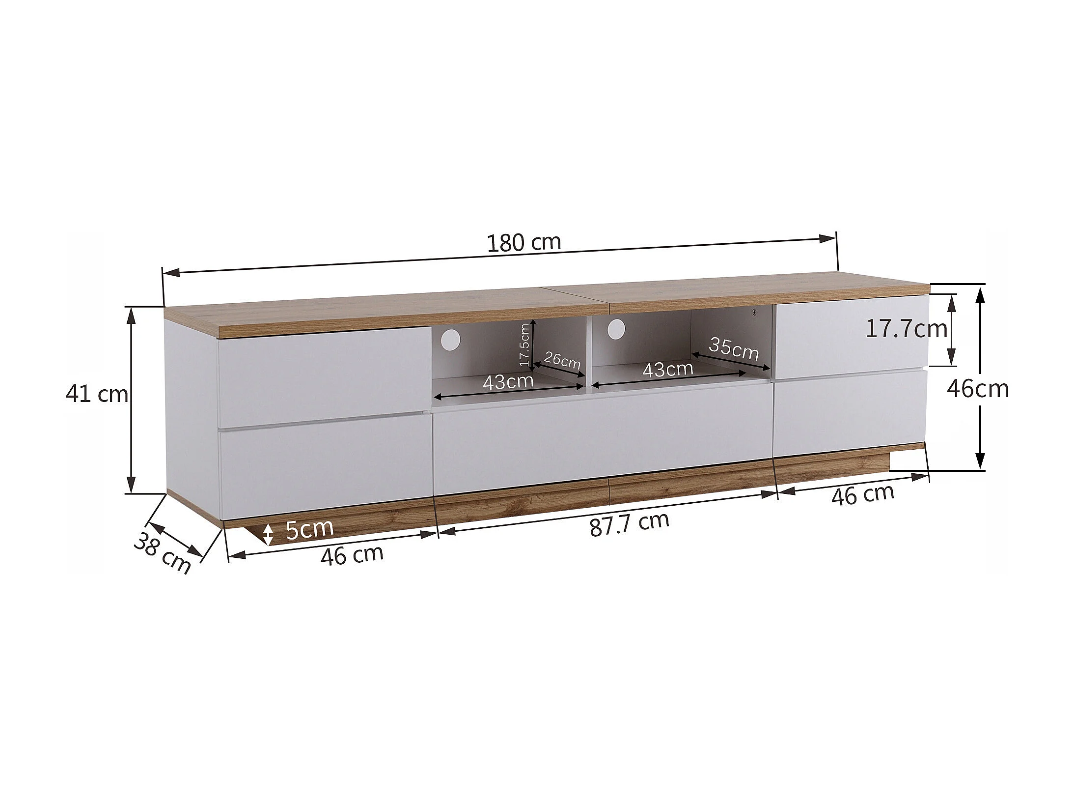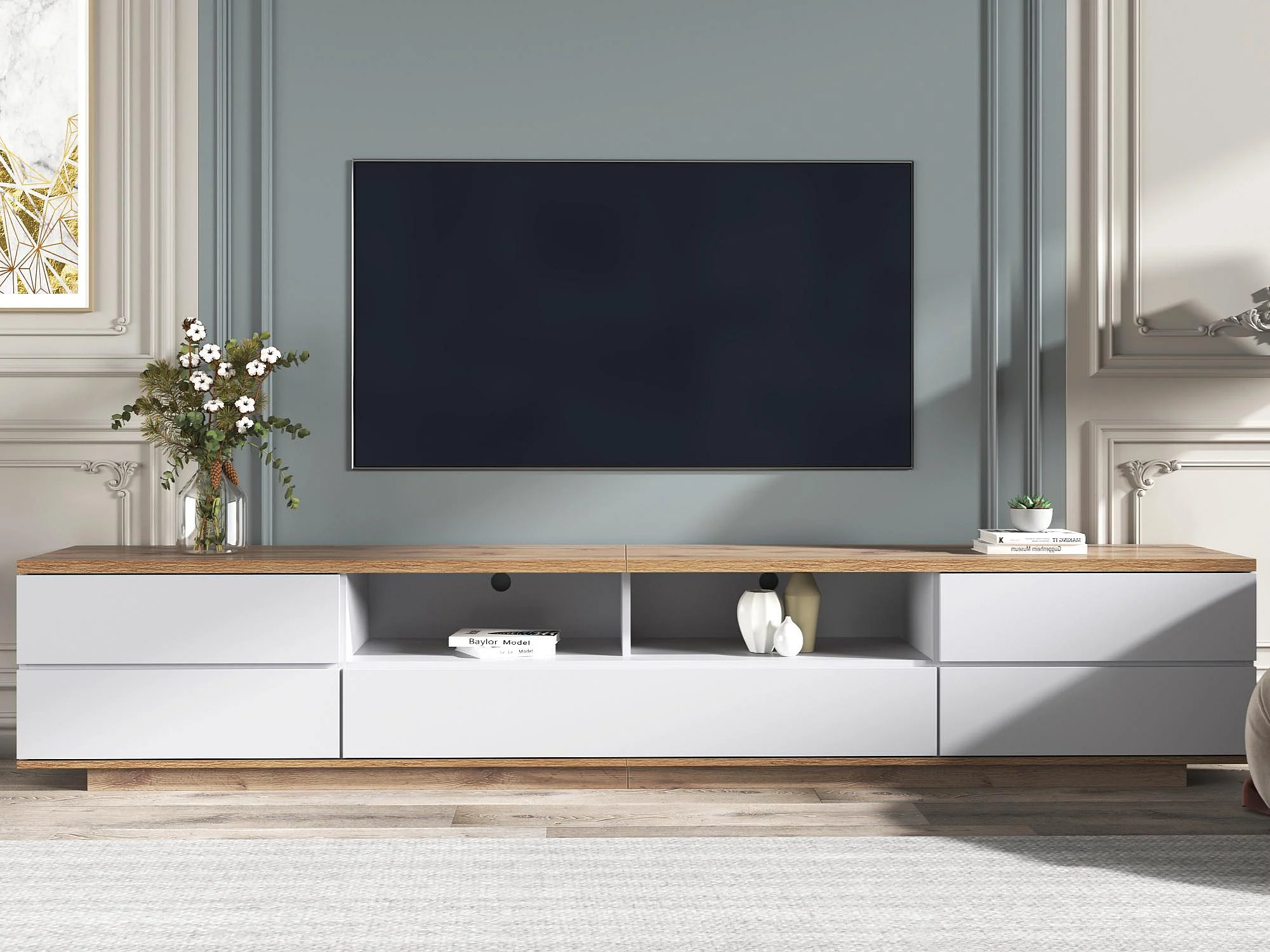 Eigentijds Scandinavisch TV-meubel 180cm in hout - 5 deuren + 8 vakken - Naturel & Wit