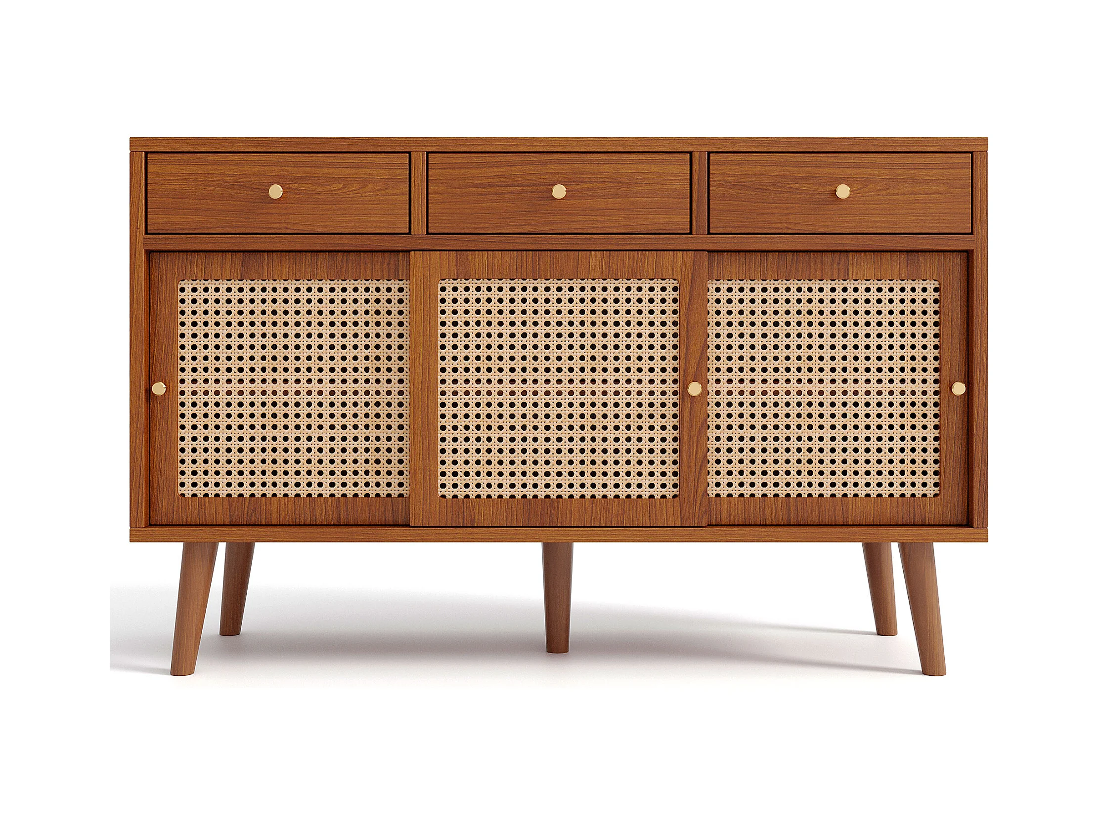 Eikenhouten dressoir met 3 lades en 3 rotan deuren, gouden handgrepen, houten poten - voor woonkamer of slaapkamer