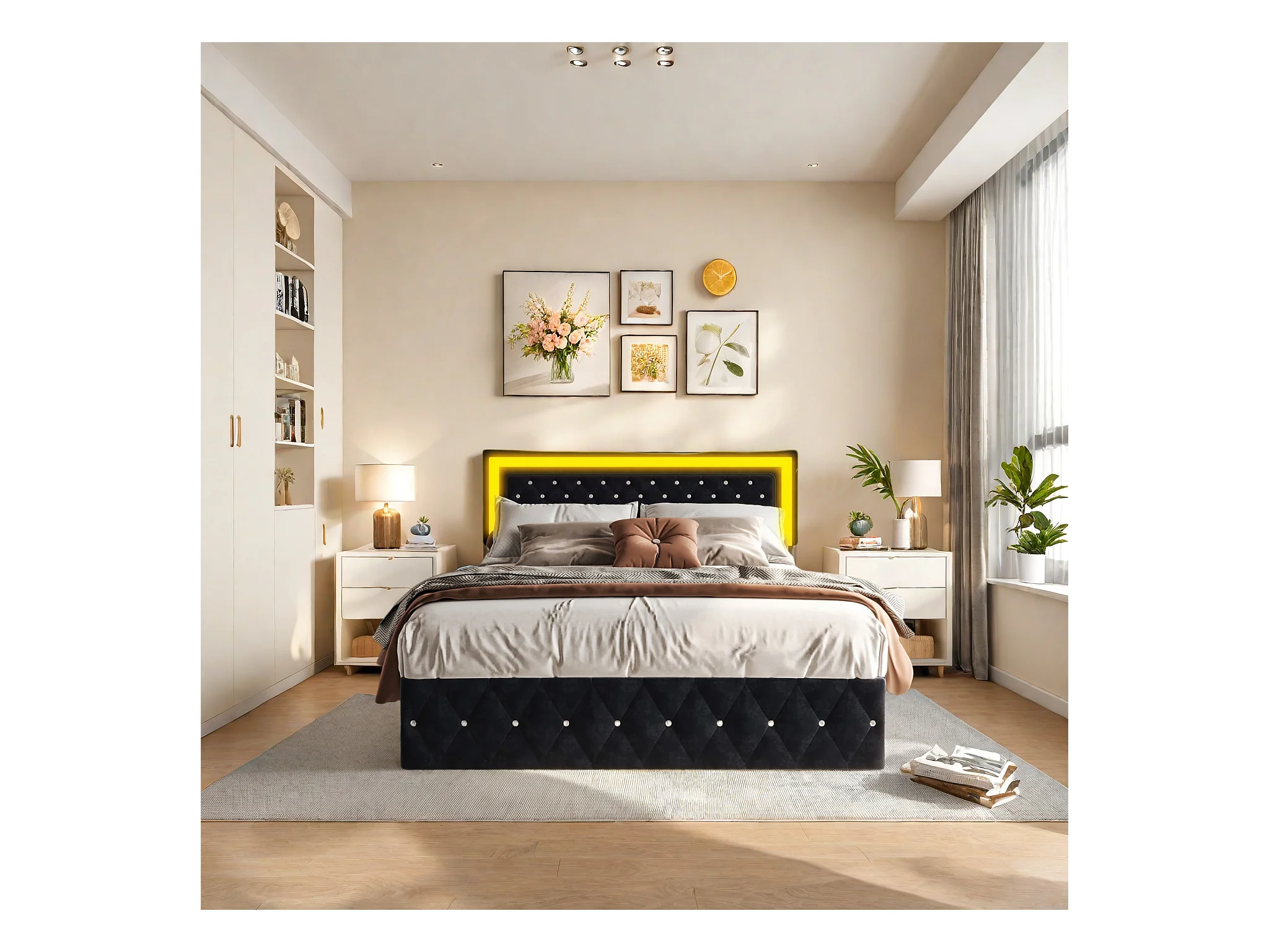 Elegant gestoffeerd bed 160x200 met groot opklapbaar hoofdeinde, fluwelen bed met LED-verlichting, hydraulisch opbergsysteem, klassiek zwart bed