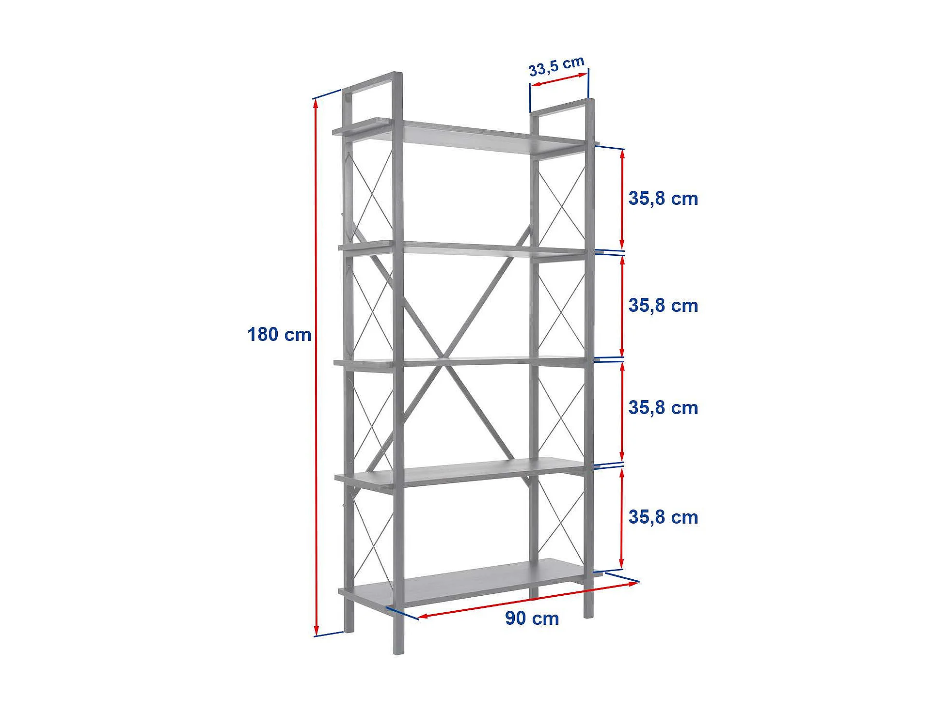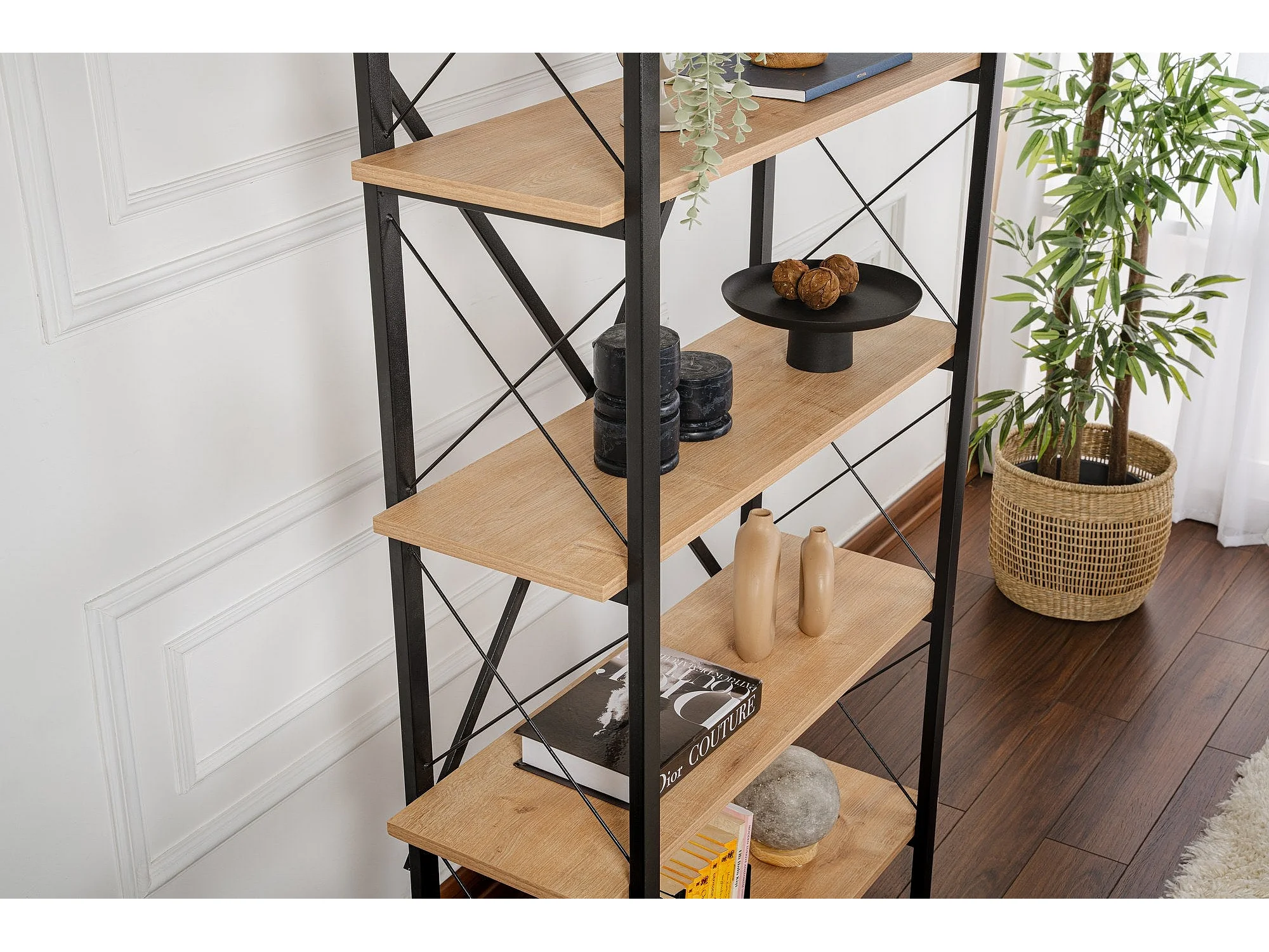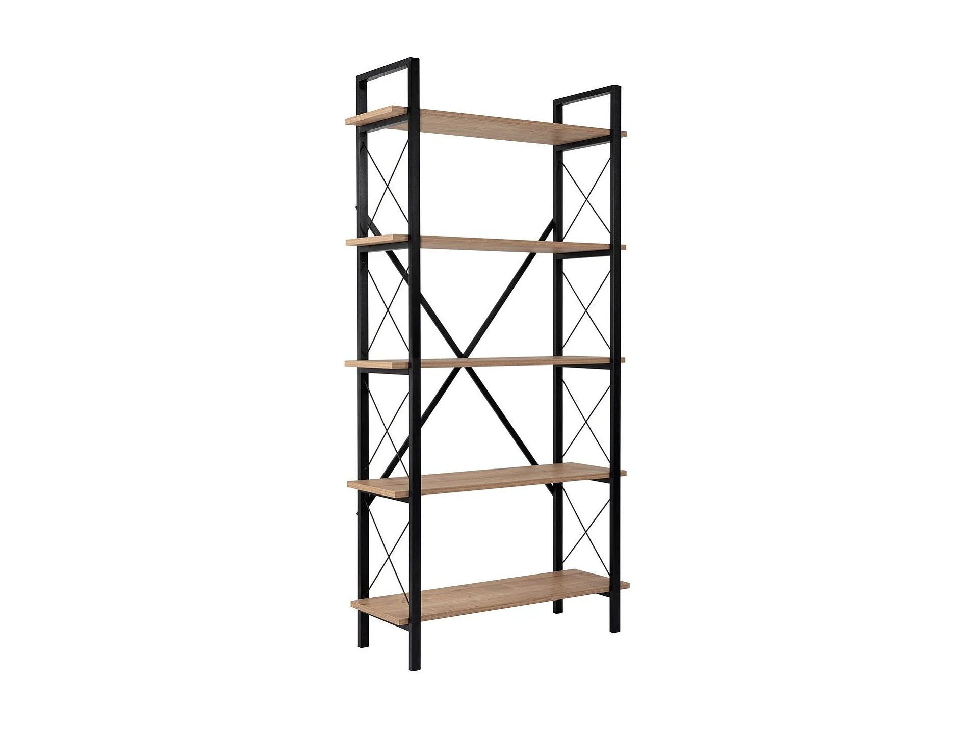 Elegante boekenkast van eikenhout en zwart, 90 x 180 x 33,5 cm | 100% melamine-gecoat spaanplaat, metalen frame | Wandmontage, meerdere plan
