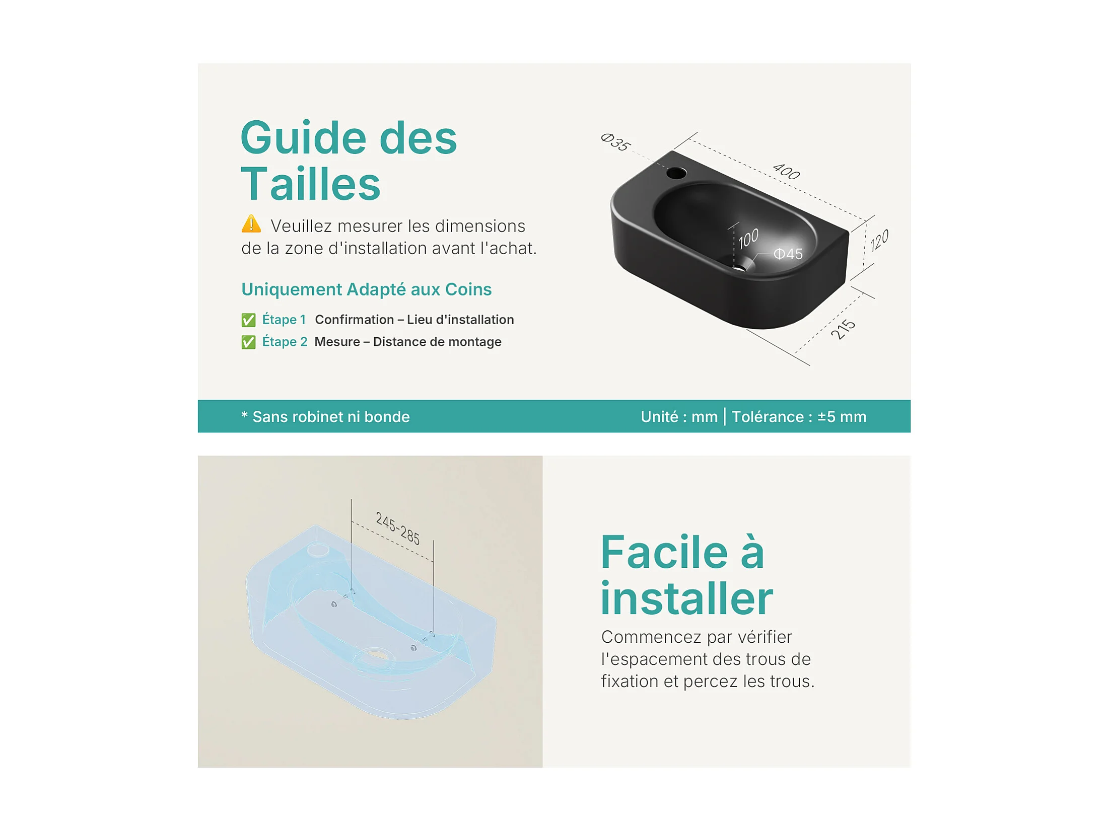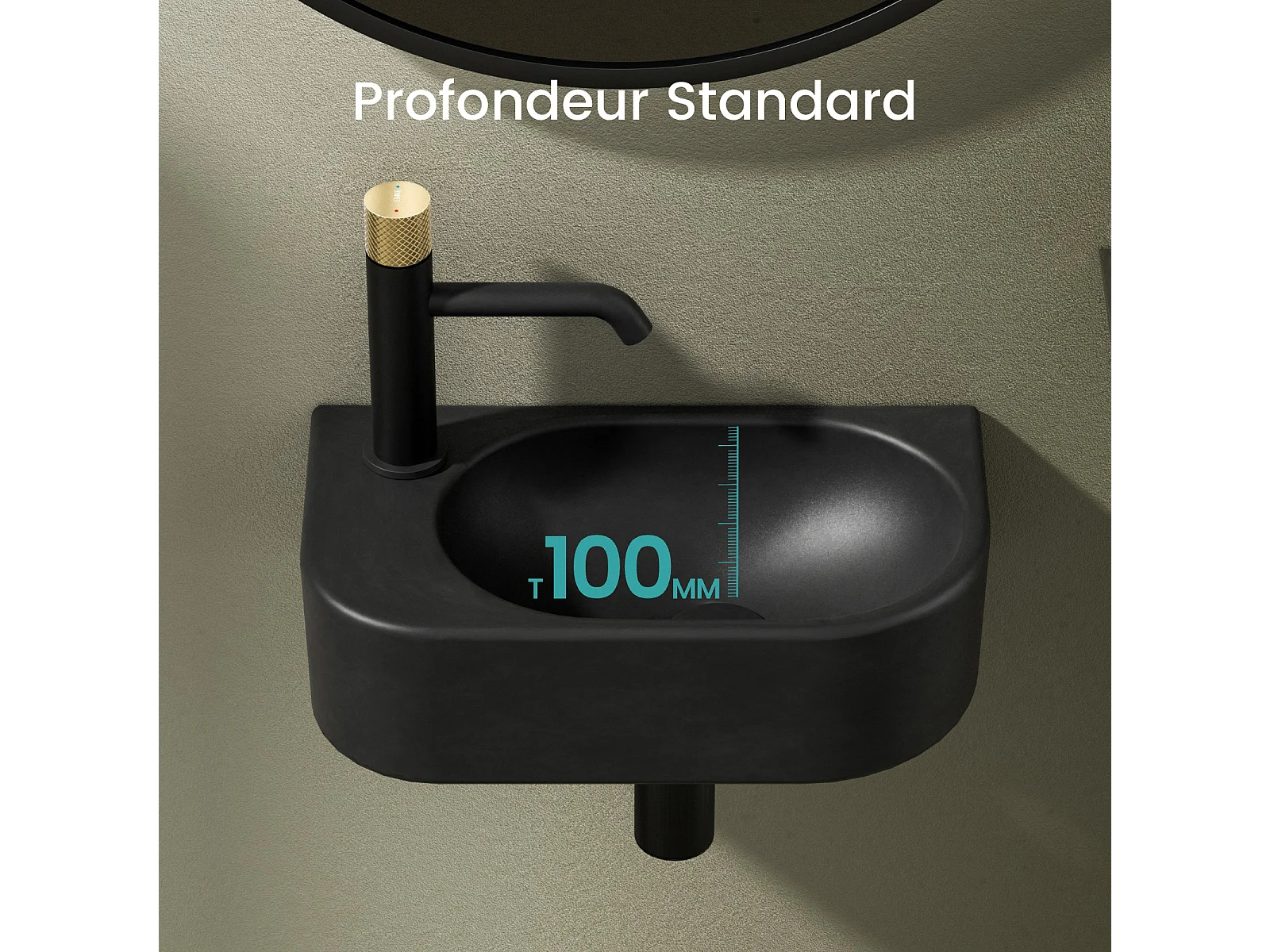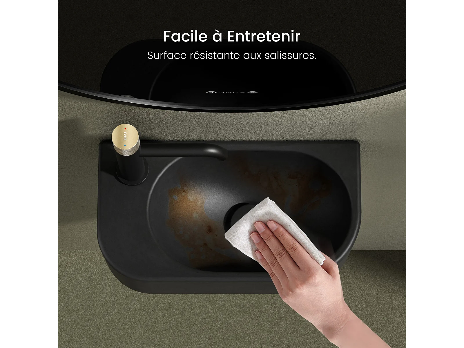 EMKE Badkamerwastafel 400 x 215 x 120 mm, Keramische wastafel met afgeronde hoeken, Kraangat rechts, Mat zwart
