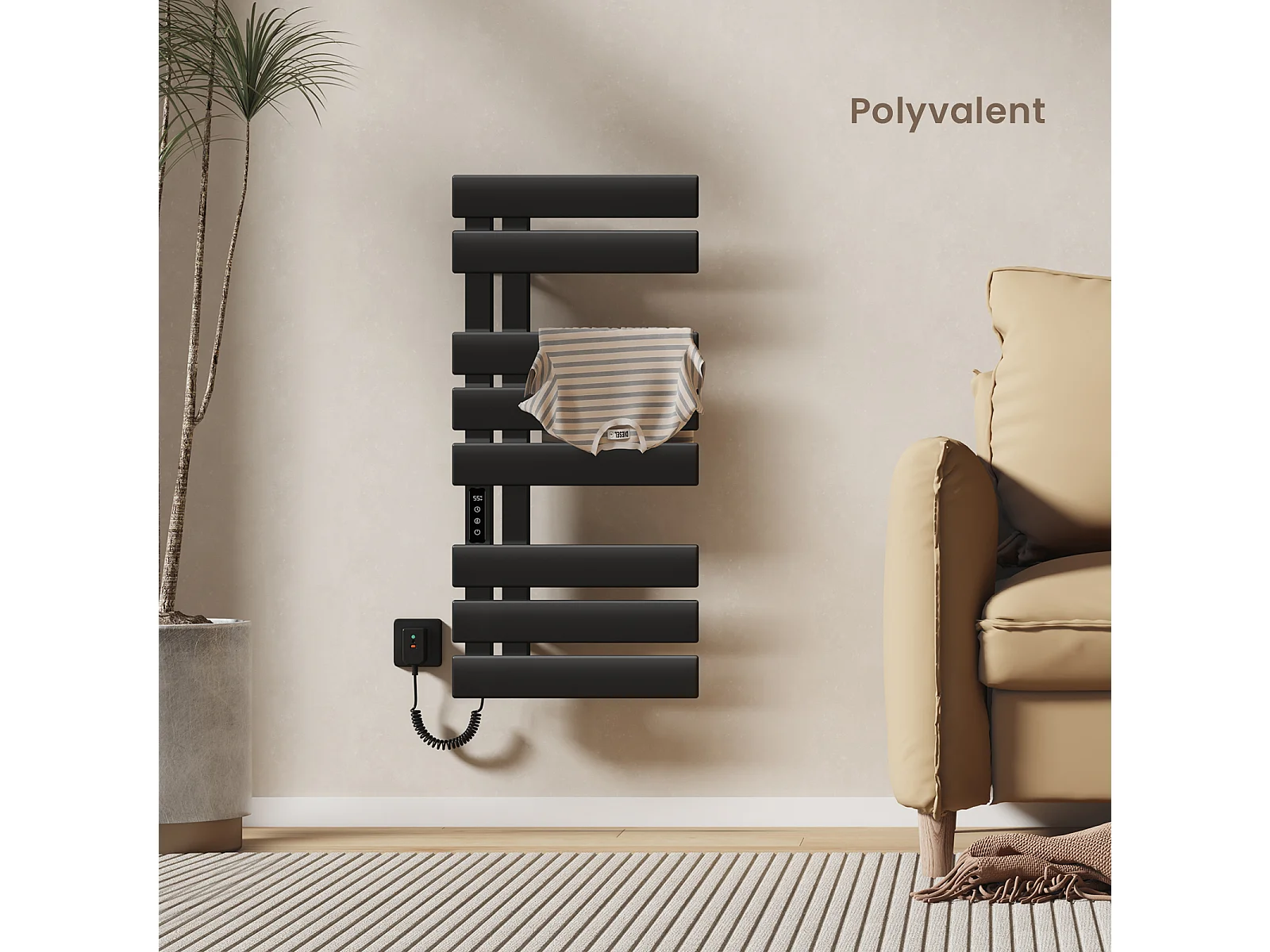 EMKE Elektrische handdoekradiator zwart WiFi 85x40cm 230W carbon LCD-scherm app-bediening asymmetrisch
