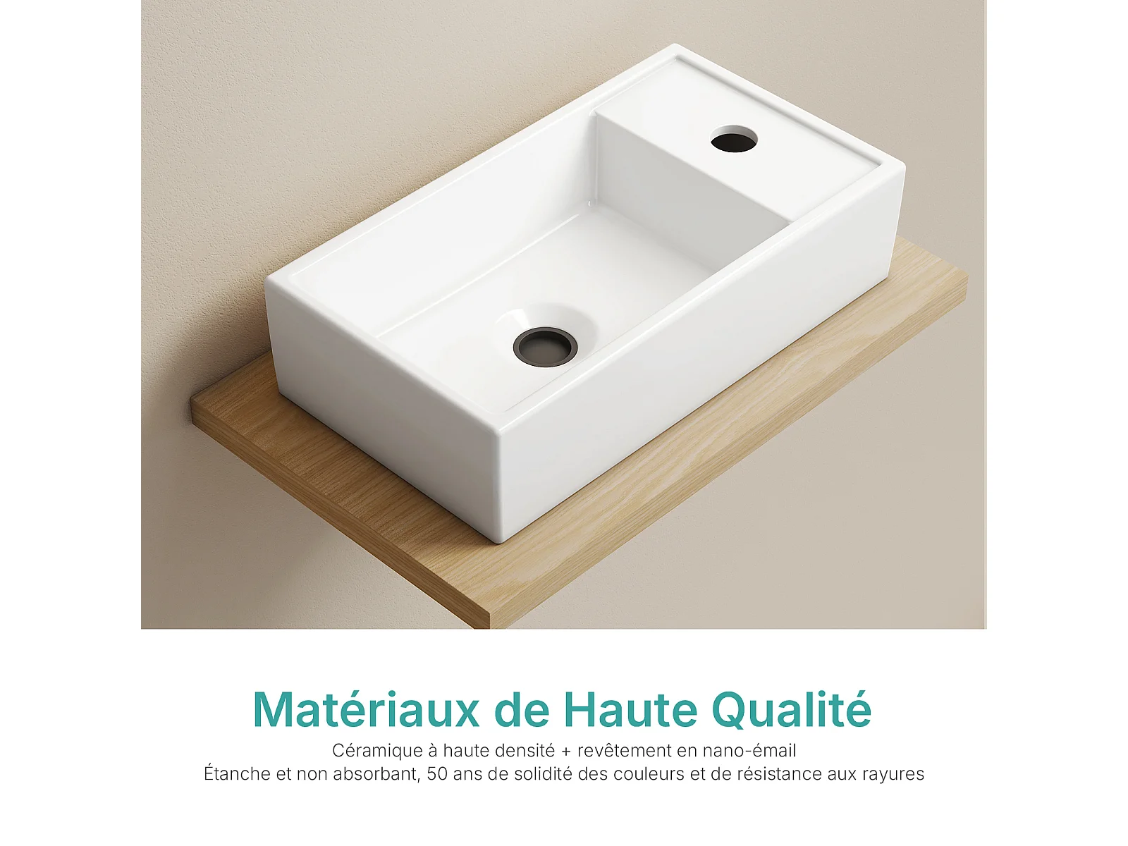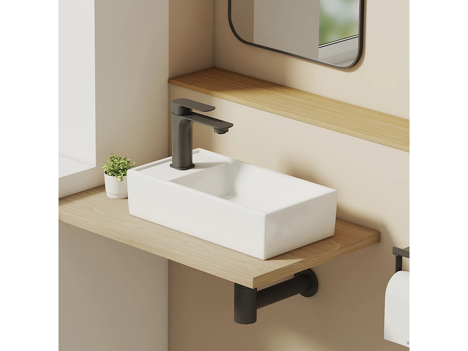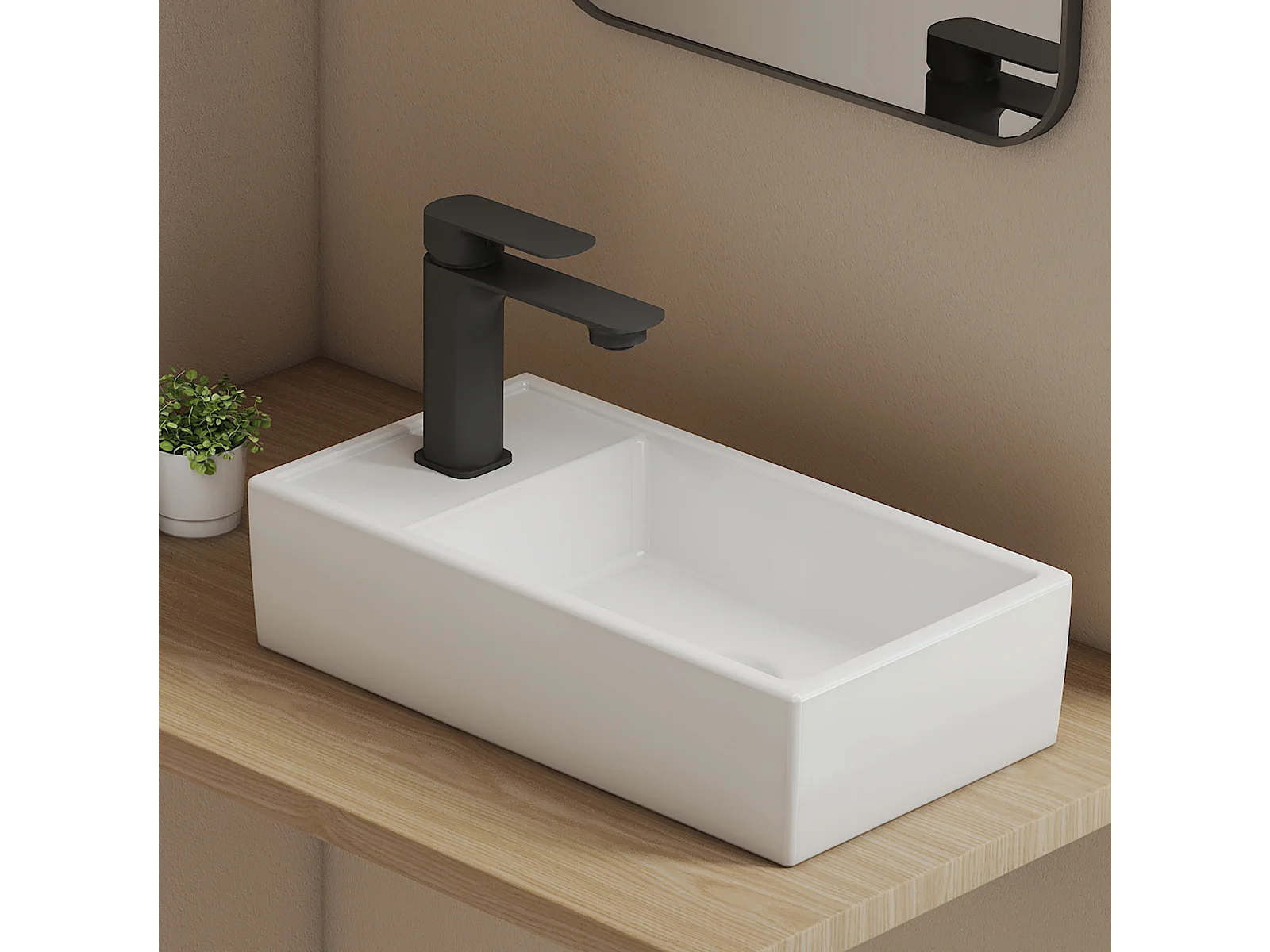 EMKE keramische wastafel 41 x 22 x 10 cm, glanzend wit, vierkante wastafel voor op het aanrecht of aan de muur met kraangat