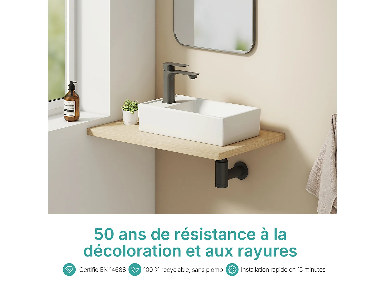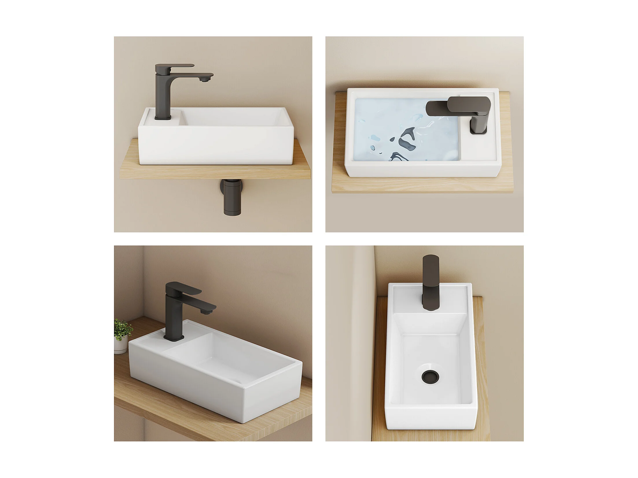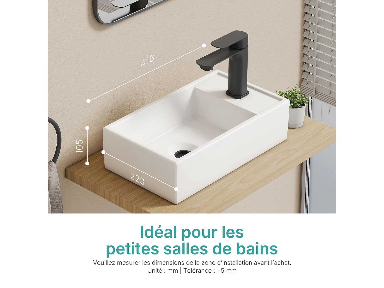 EMKE keramische wastafel 41 x 22 x 10 cm, glanzend wit, vierkante wastafel voor op het aanrecht of aan de muur met kraangat