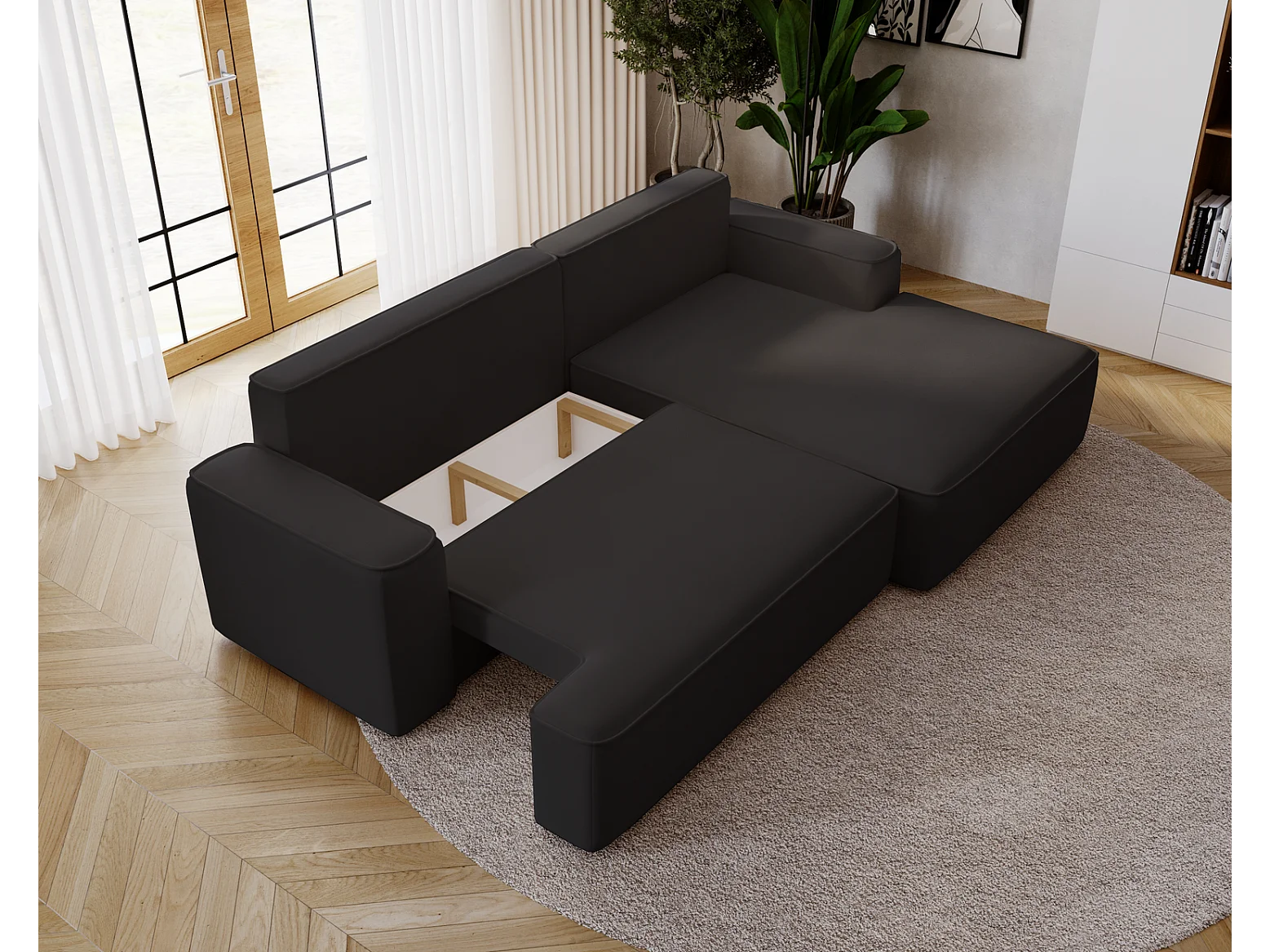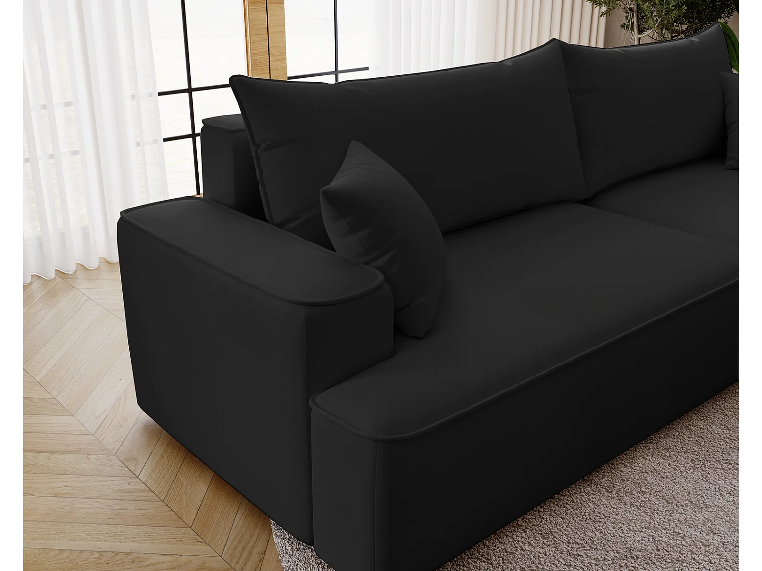 Emporius Dallas Hoekbank L-Vorm - slaapfunctie en bedlade, rechts - Sofa 250 cm, fluweel zwart (Komodo 23)