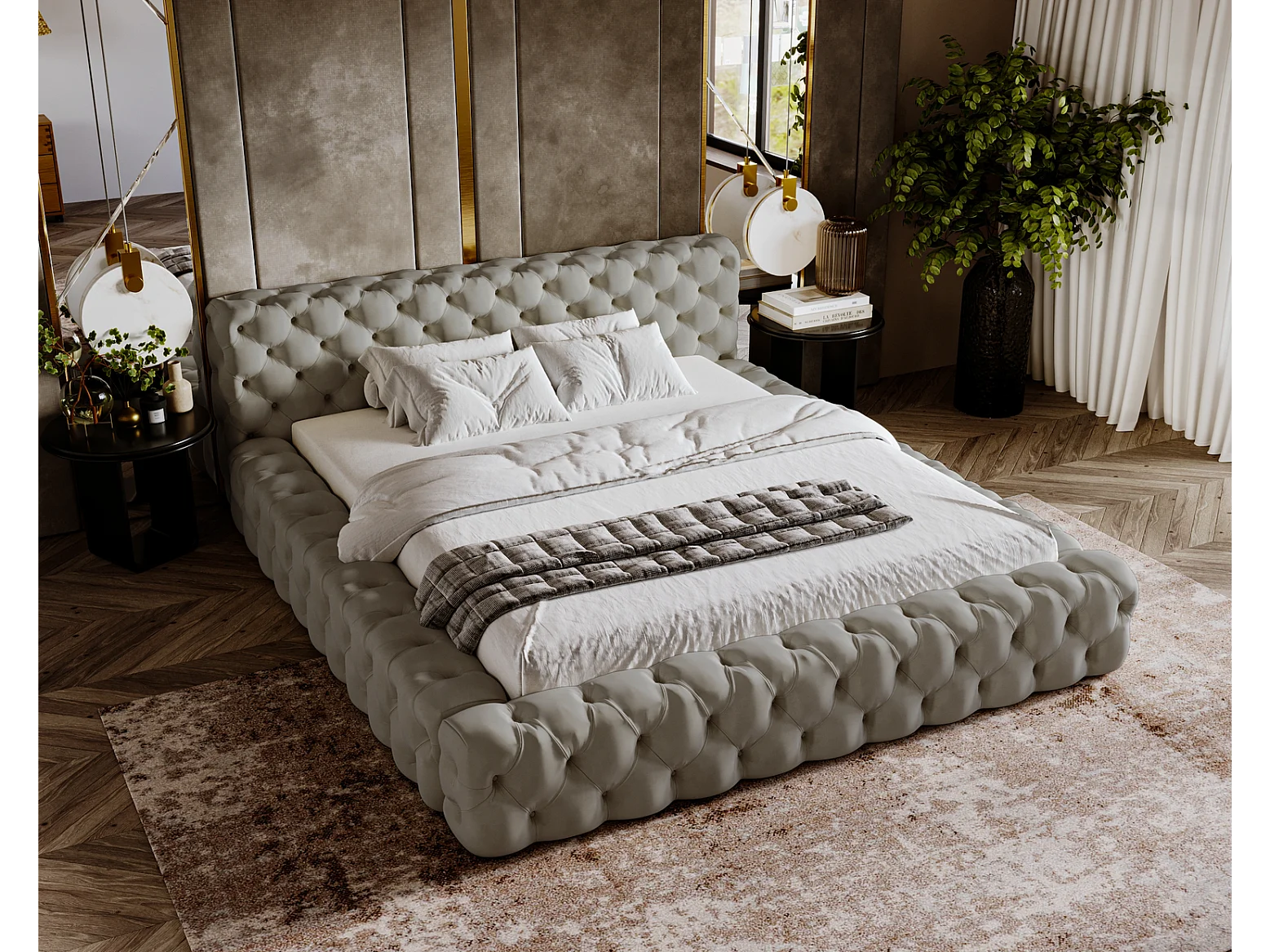Emporius gestoffeerd bed 140x200 Vigo, bed met lattenbodem - tweepersoonsbed 140x200 cm, groot hoofdeinde - fluwelen Lichtgrijs (Amor Velvet 4318)