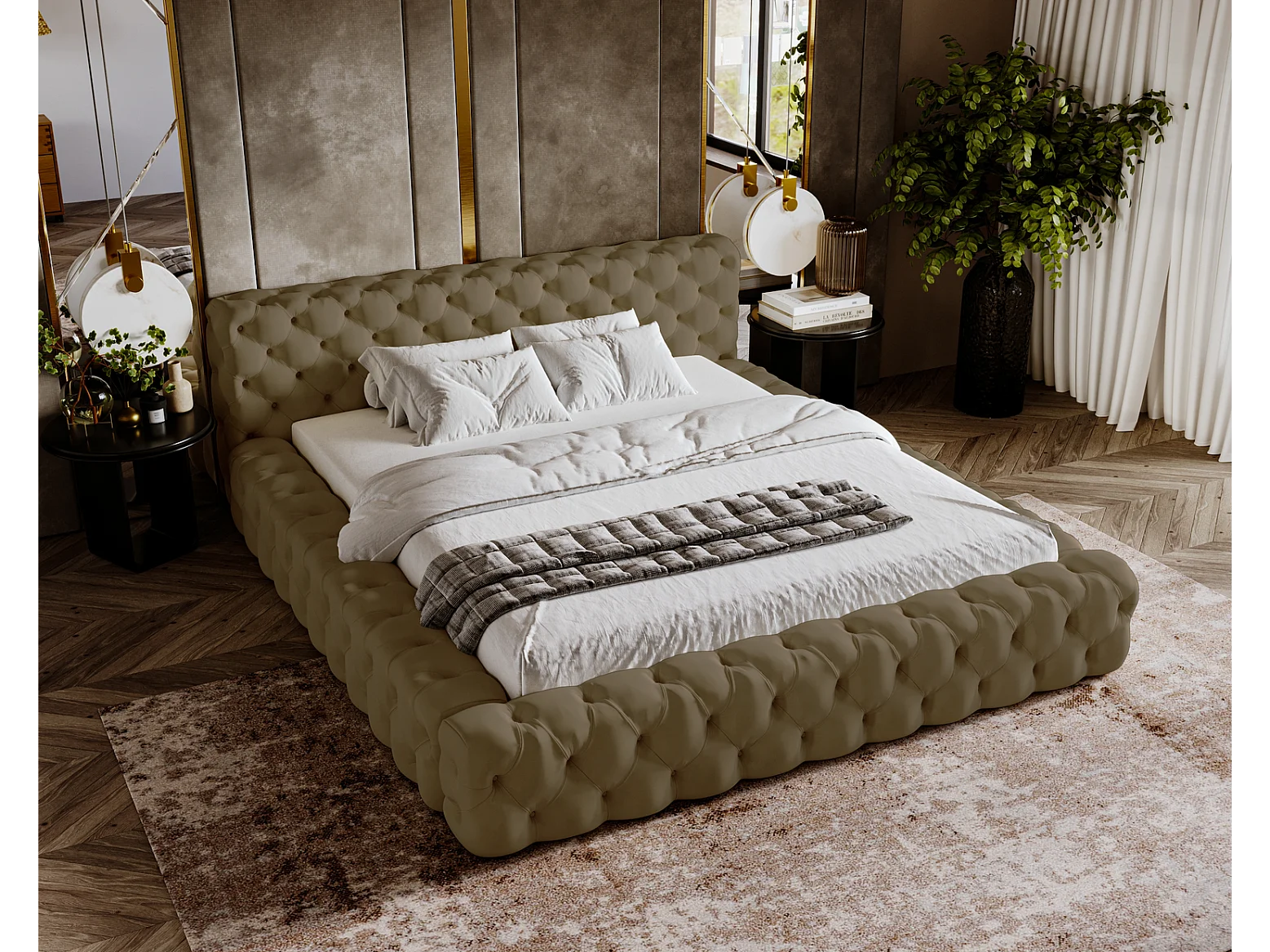 Emporius gestoffeerd bed 160x200 Vigo, bed met lattenbodem - tweepersoonsbed 160x200 cm, groot hoofdeinde - fluwelen Beige (Amor Velvet 4302)