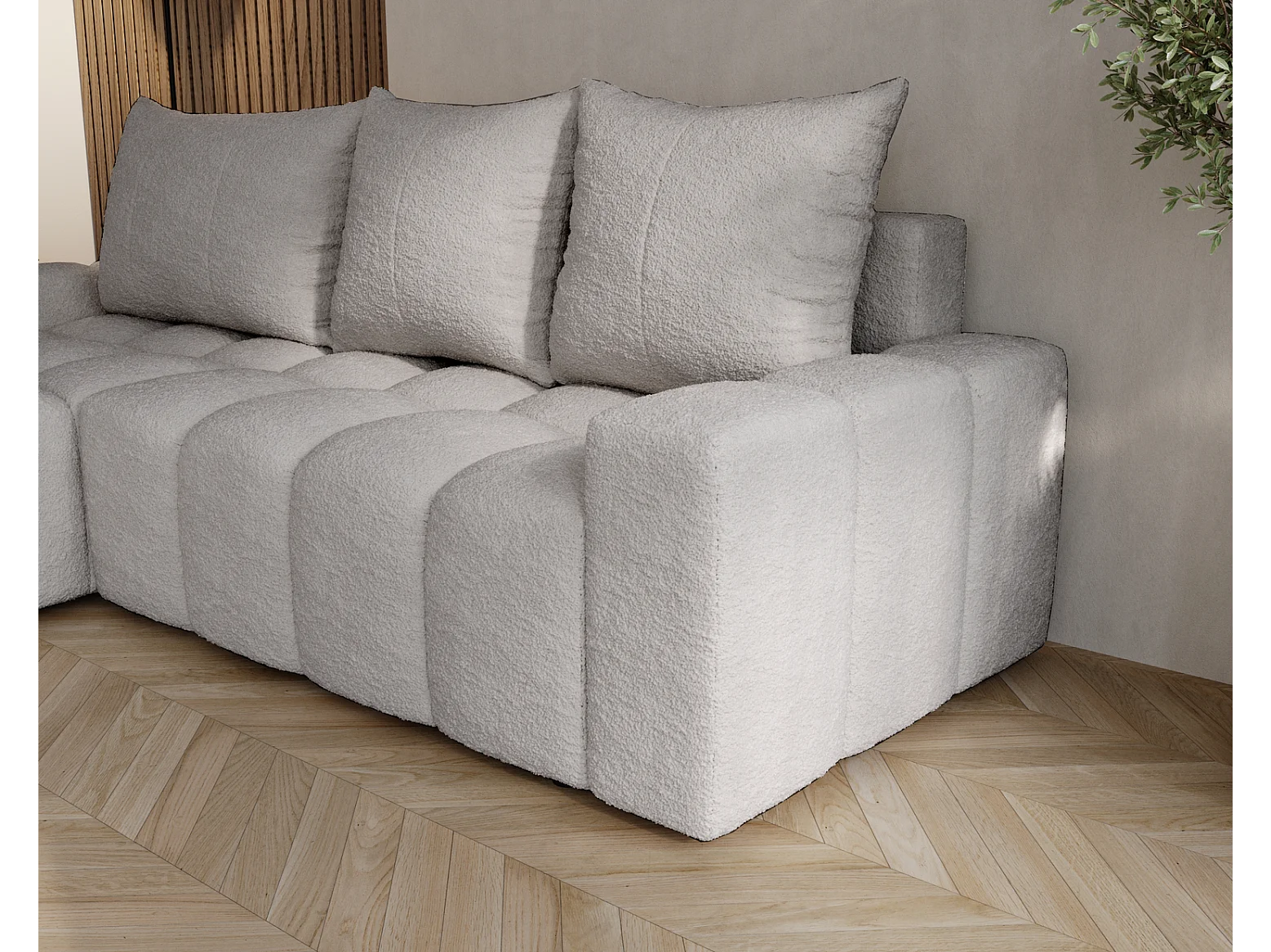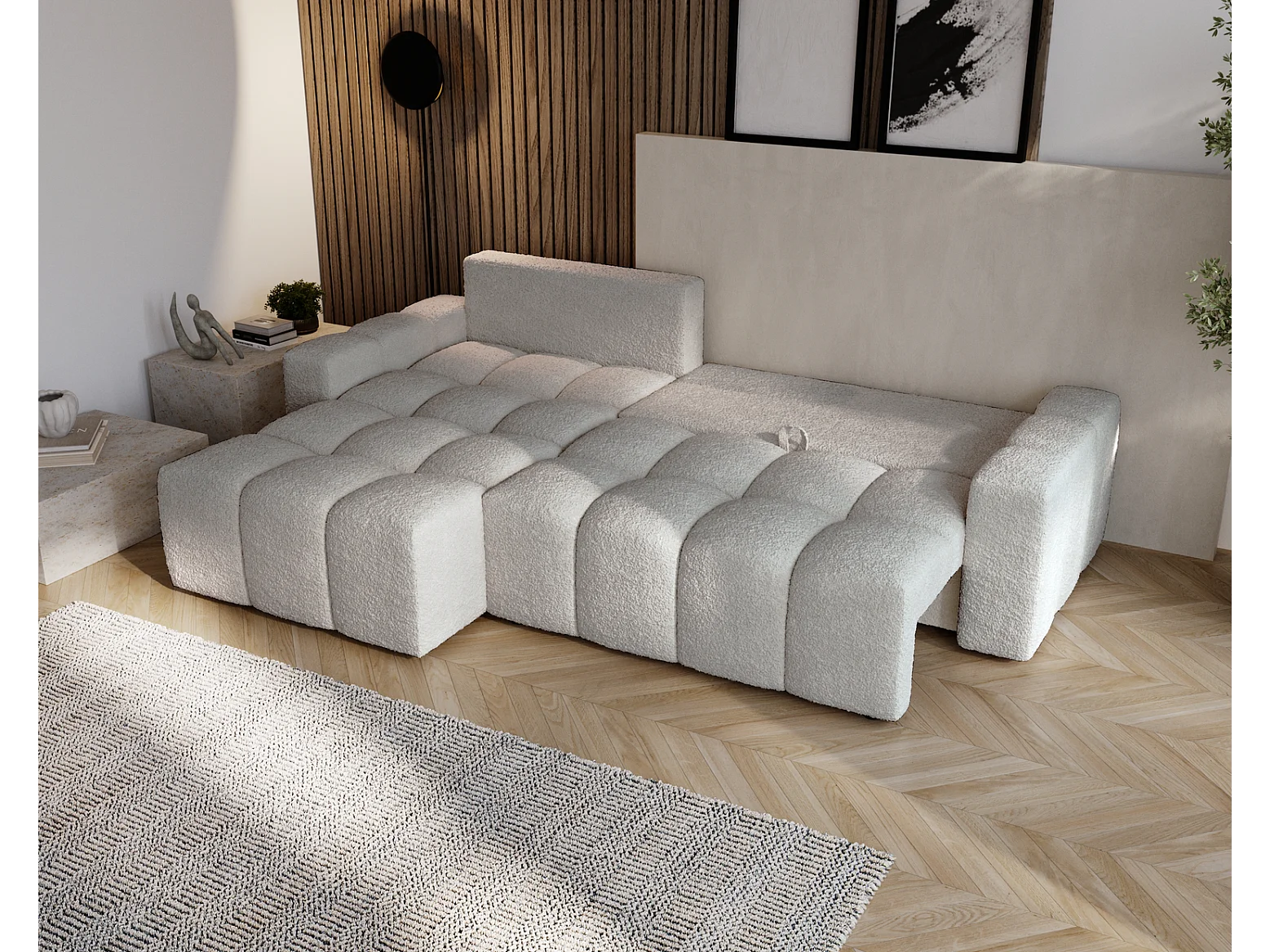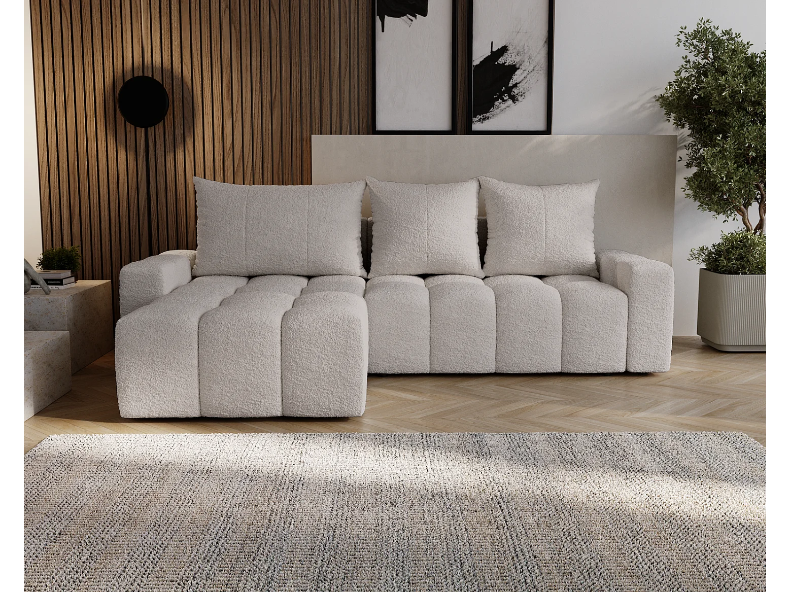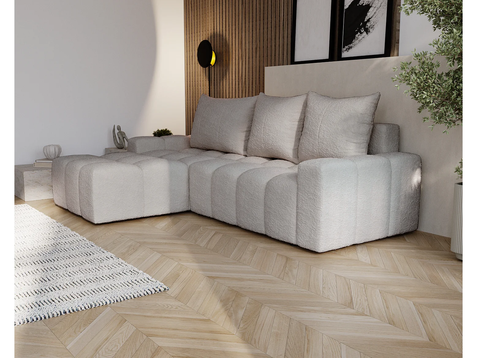 Emporius Wilson Hoekbank met slaapfunctie - slaapbank met bedlade, links, bouclé lichtgrijs (Anthology 15)