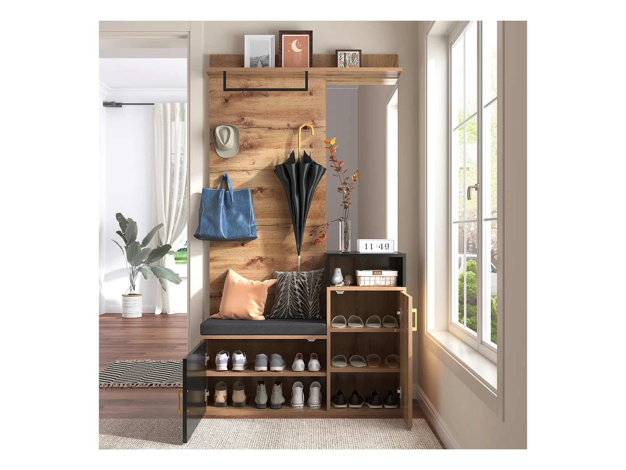 Halkastset met 5 haken, spiegel, schoenenrek en bank, MDF, zwart en naturel (100x38x191cm)