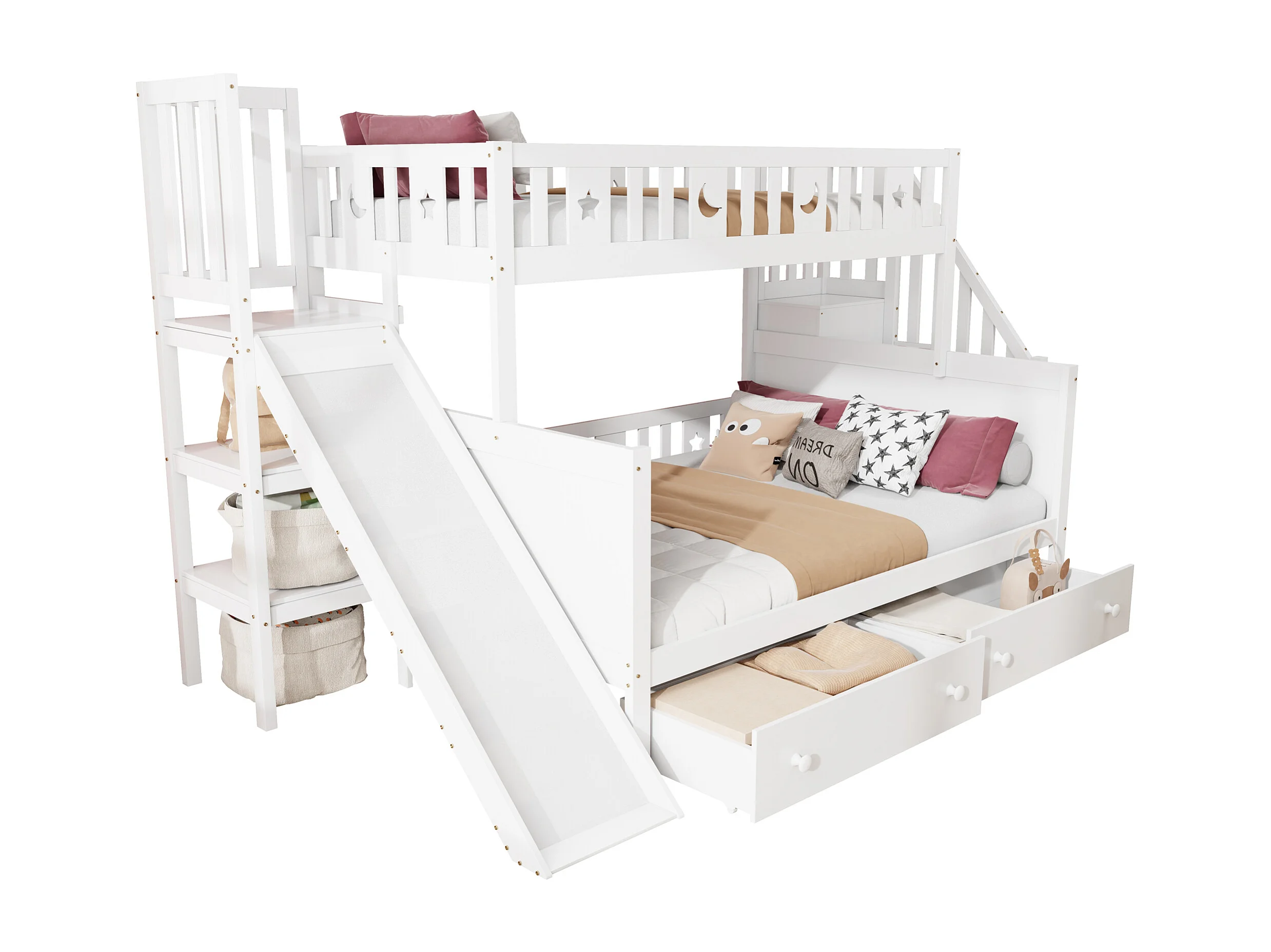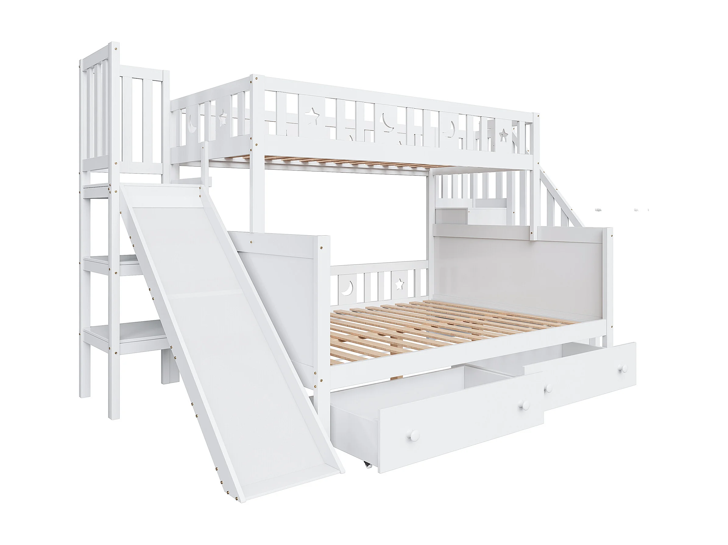 Etagebed 90x200/140x200 cm - Veiligheidsglijbaan & Veiligheidsladder - Lattenbodem en 2 Laden - Kinderkamer - Massief Hout - Wit Zonder matras