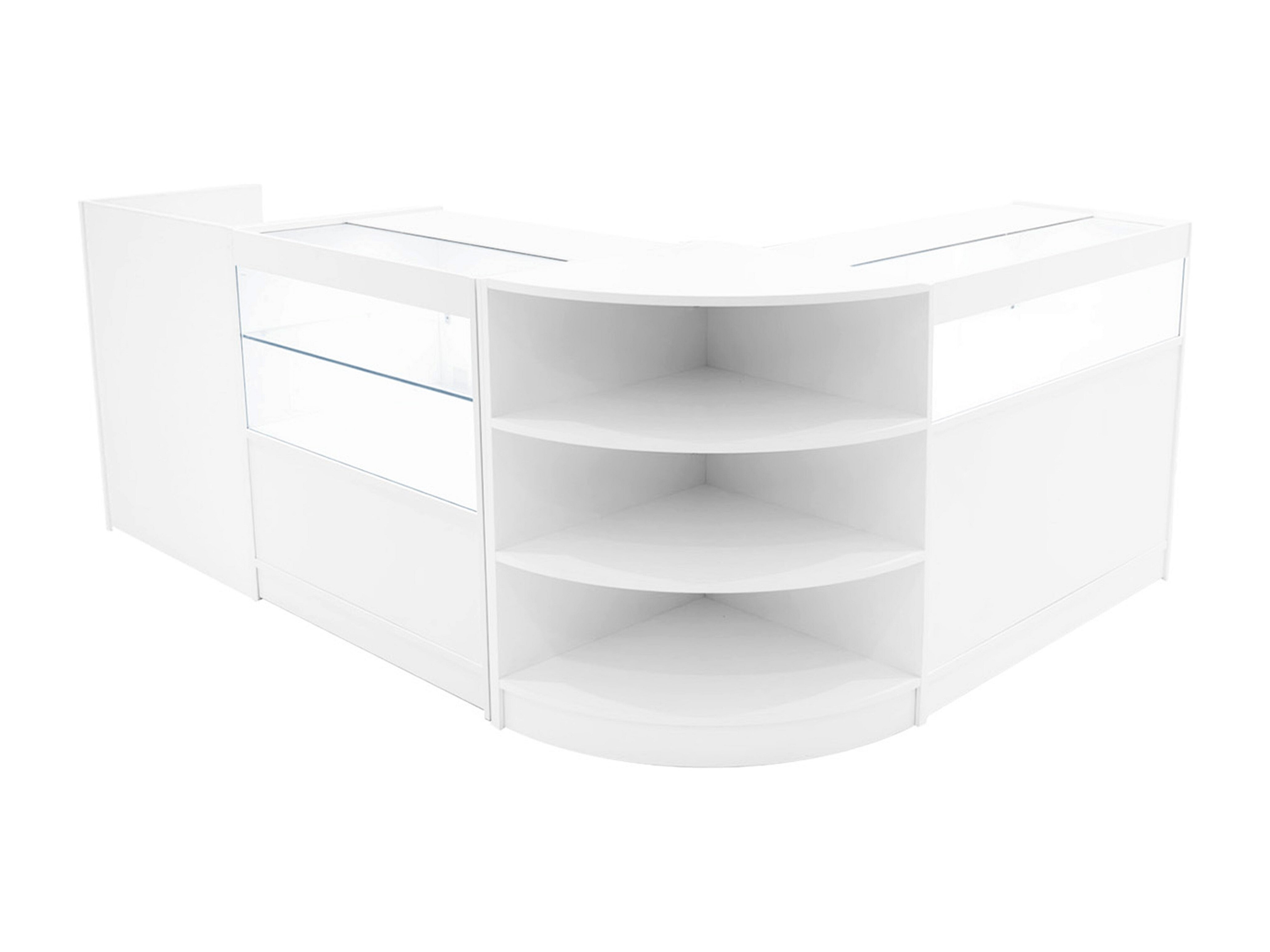De LM60 gebogen hoektoonbank biedt ruimtebesparende functionaliteit en zorgt voor een vloeiende indeling. Het compacte, gebogen ontwerp maakt het mogelijk om hem netjes in een hoek te plaatsen of te koppelen aan rechte toonbanken voor een naadloos countersysteem. Drie open schappen aan de klantzijde maximaliseren de zichtbaarheid en toegankelijkheid van producten.