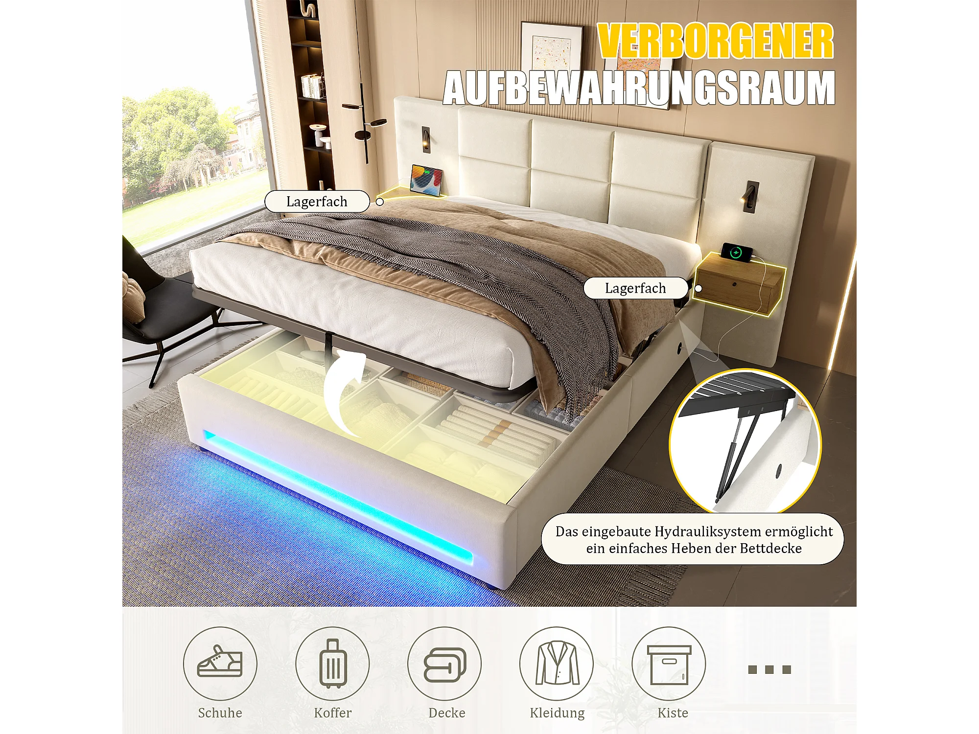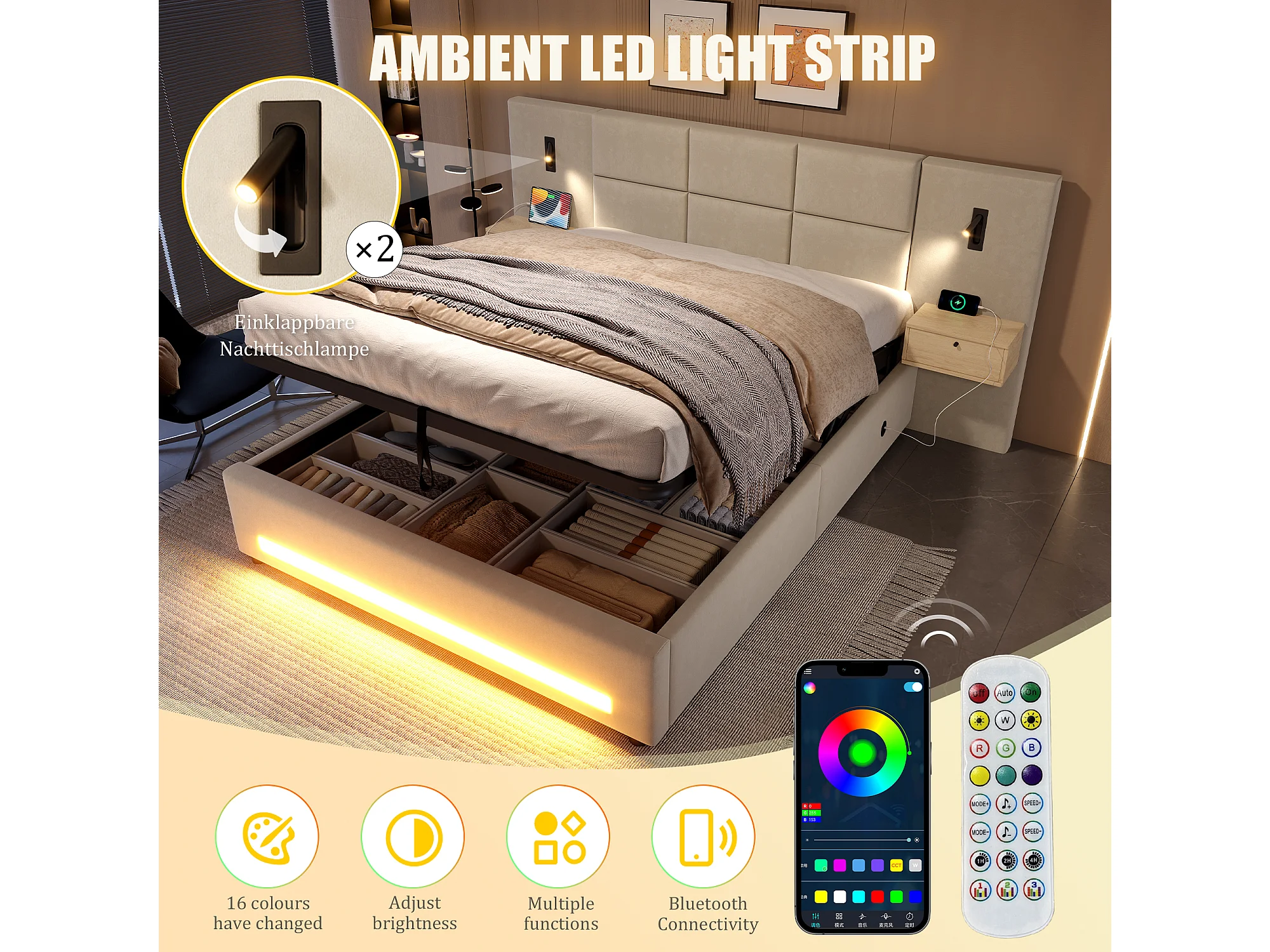 Hydraulisch opbergbed - 180 x 200 cm - verstelbaar hoofdeinde met opbergruimte - met LED's + USB/Type-C - fluweel - beige