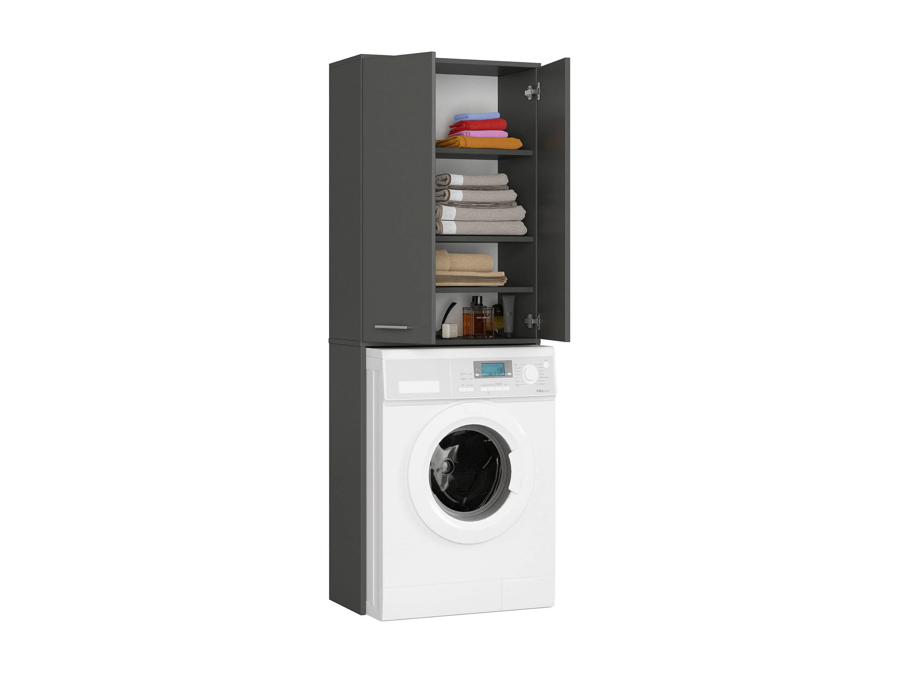 Badkamerkast voor Wasmachine FIN / Hoge Wasmachinekast met 2 Deuren / AKORD Furniture Factory / Grafietgrijs / 64 x 180 x 30 cm