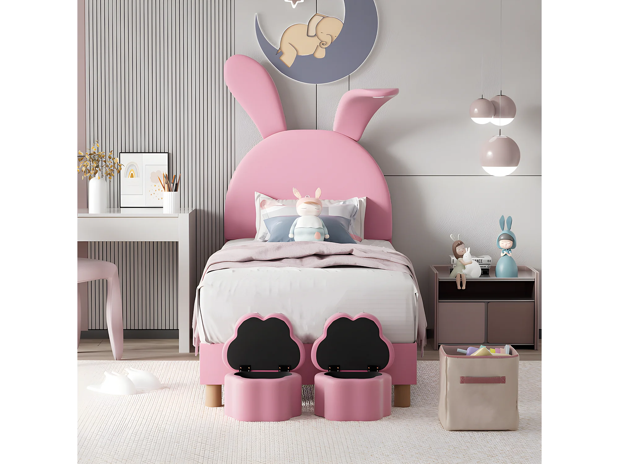 Fluwelen kinderbed - 90x200 cm - opvouwbare konijnenoren met LED - 2 opbergkrukjes - Roze