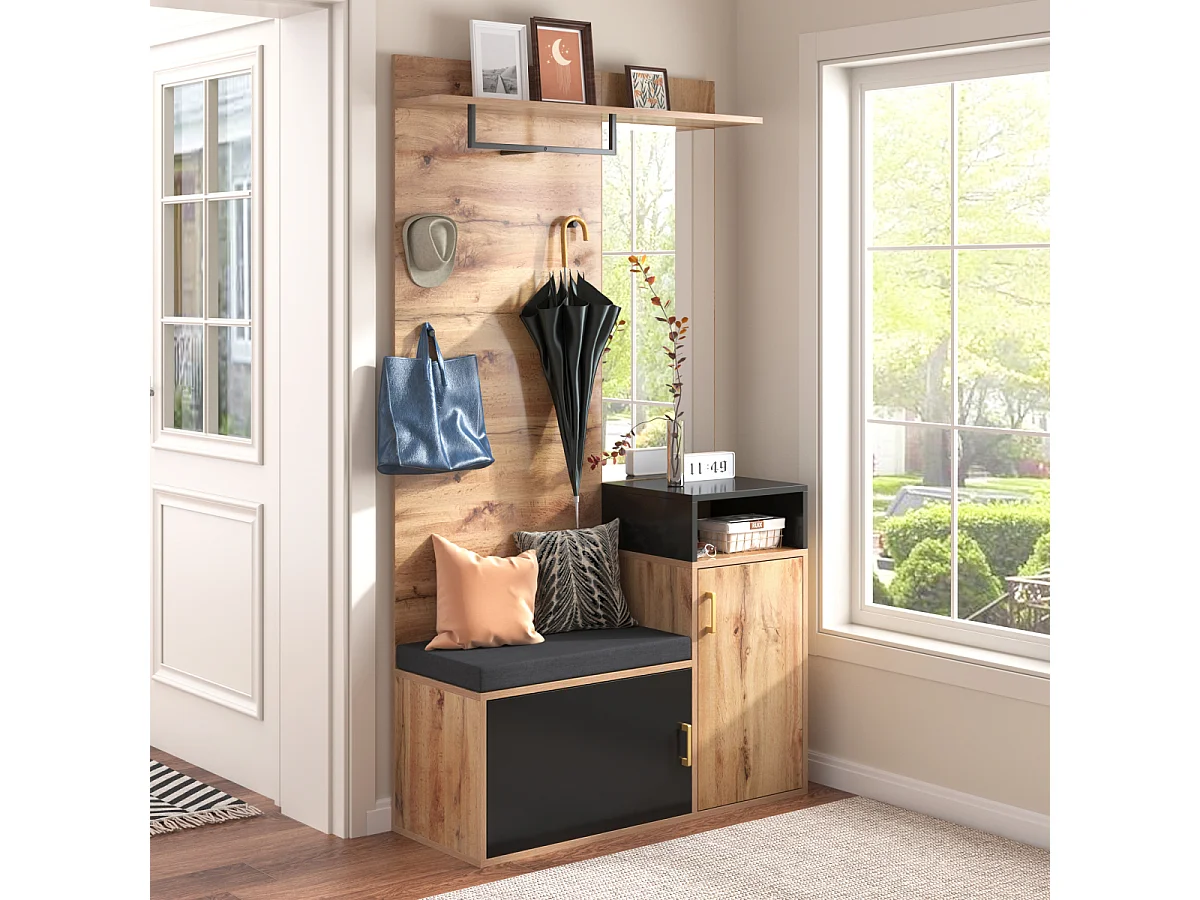 Garderobeset met 4 haken, spiegel, schoenenkast, wandrek, plank, bank. (Boren vereist)