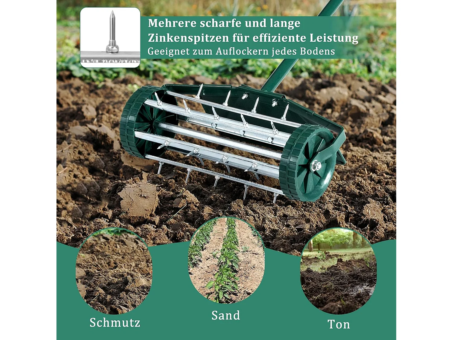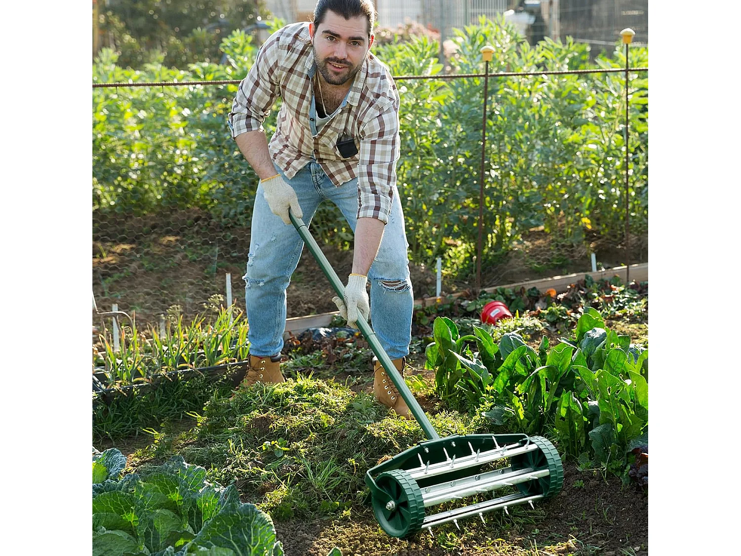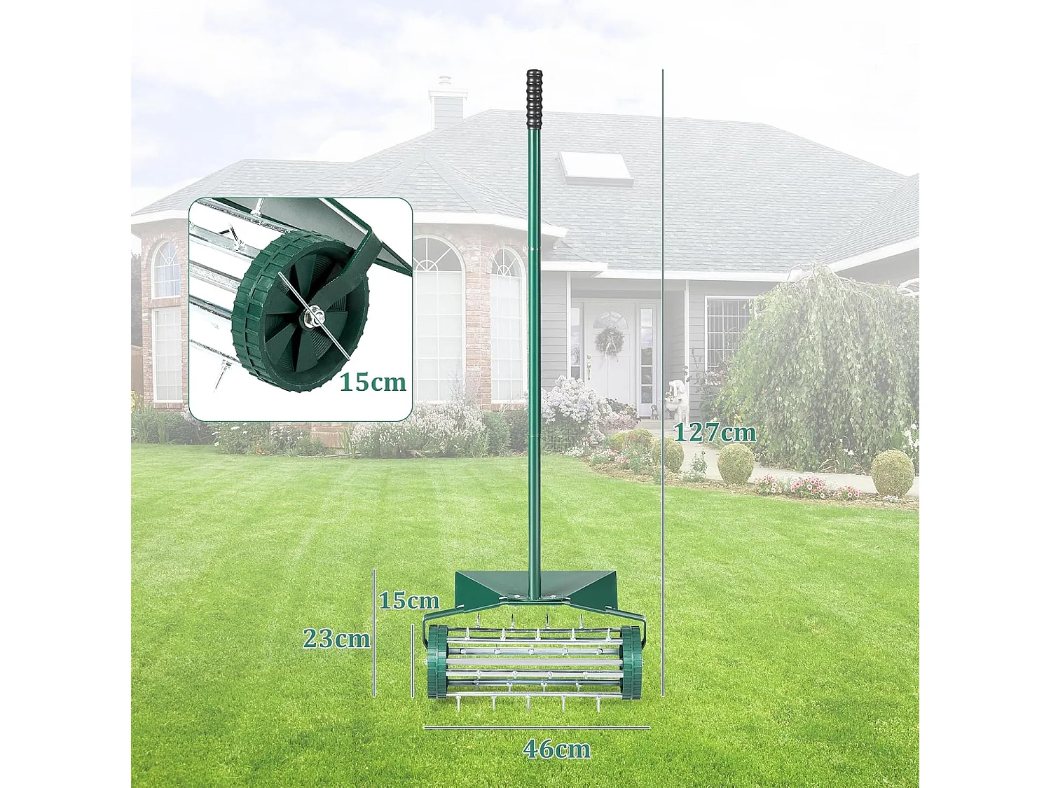 Gazonventilatorroller, gazonrol met steel, 3 cm spijkers en spatbescherming, handverticuteermachine rollend, gazonbeluchter handmatig, verticuteerder gazonwals voor