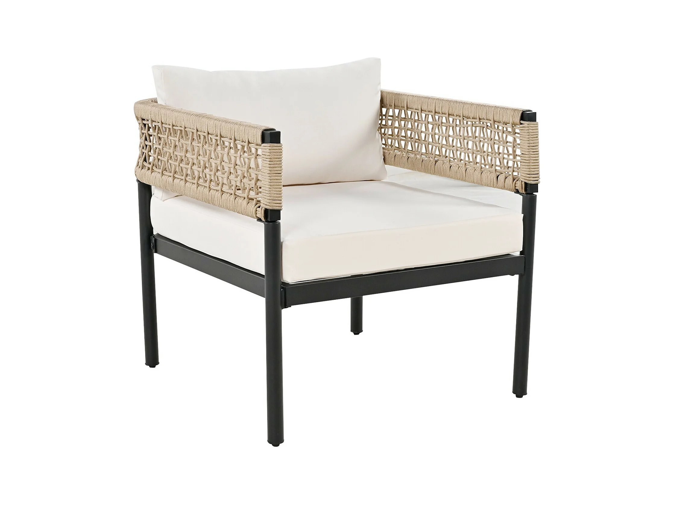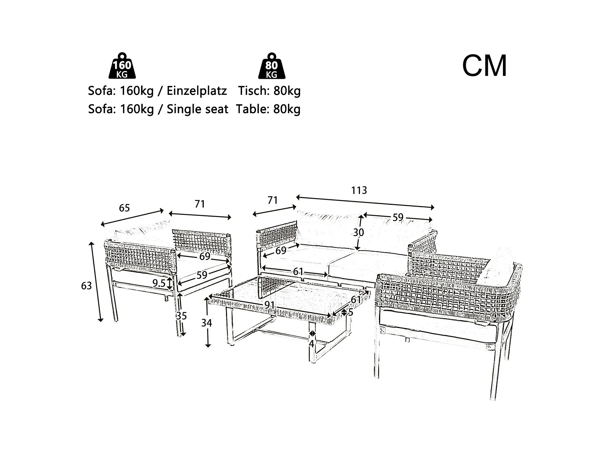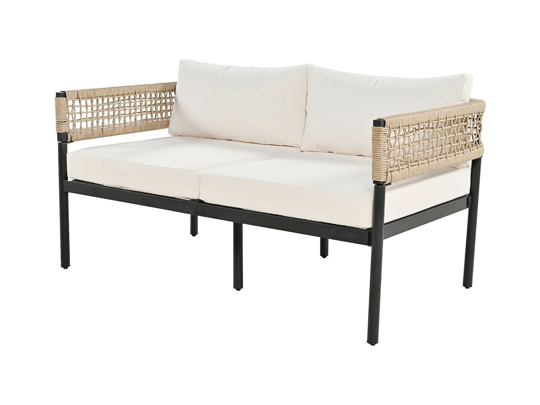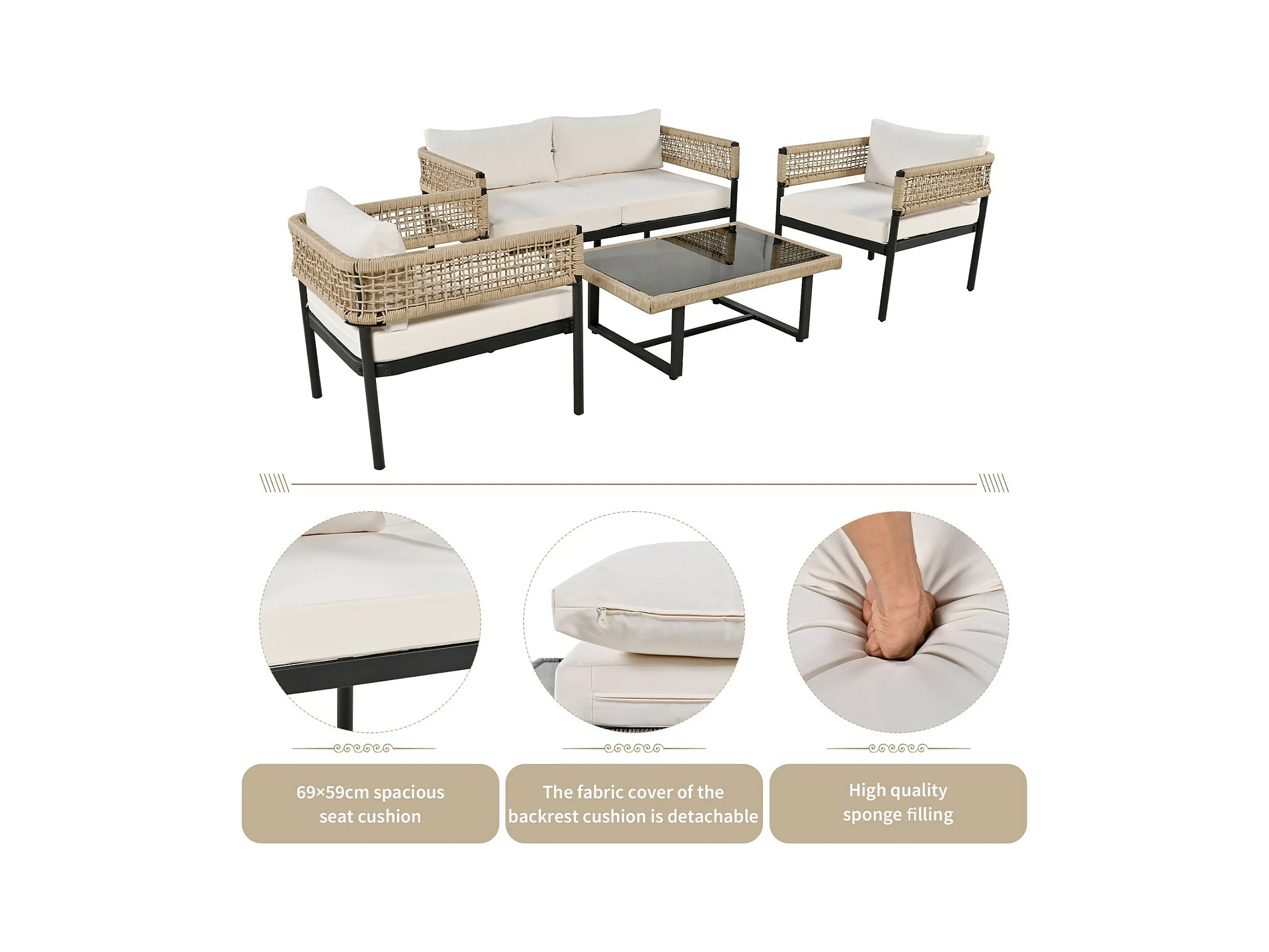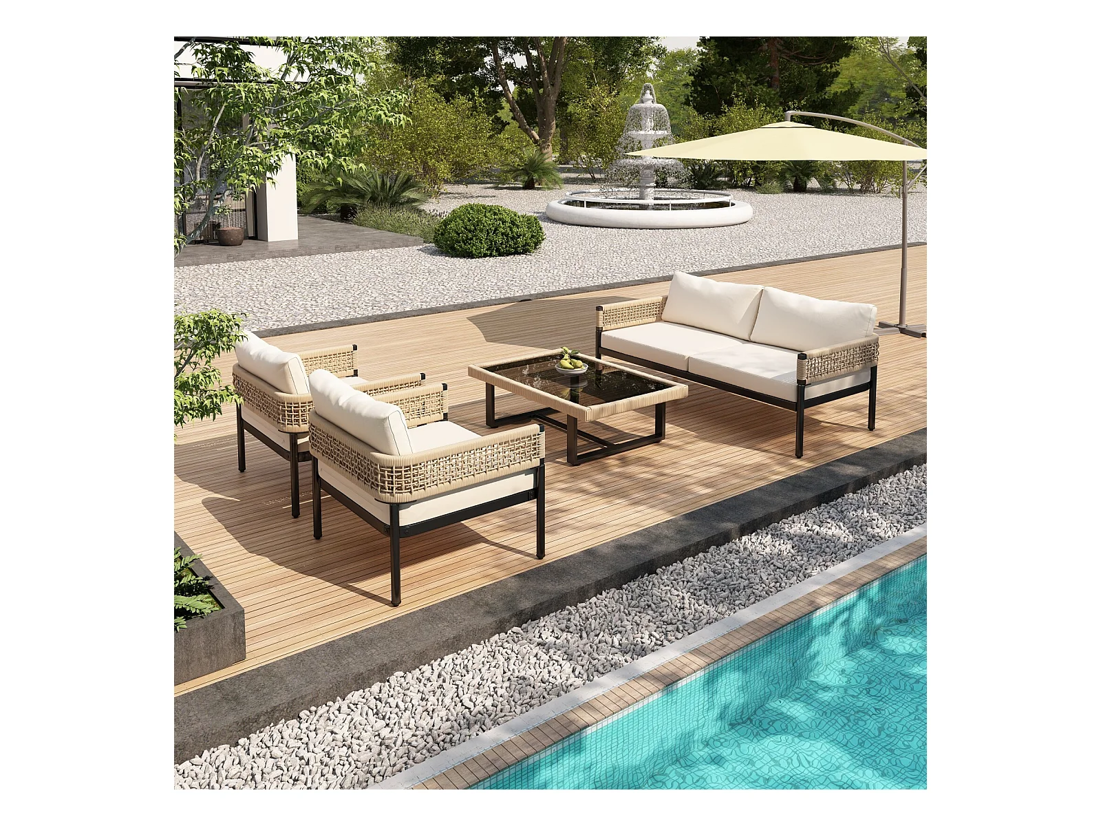 Gegalvaniseerd ijzeren tuinmeubilair: 2 -senter bank + 2 fauteuils + glazen salontafel, beige kussens, verstelbare voeten