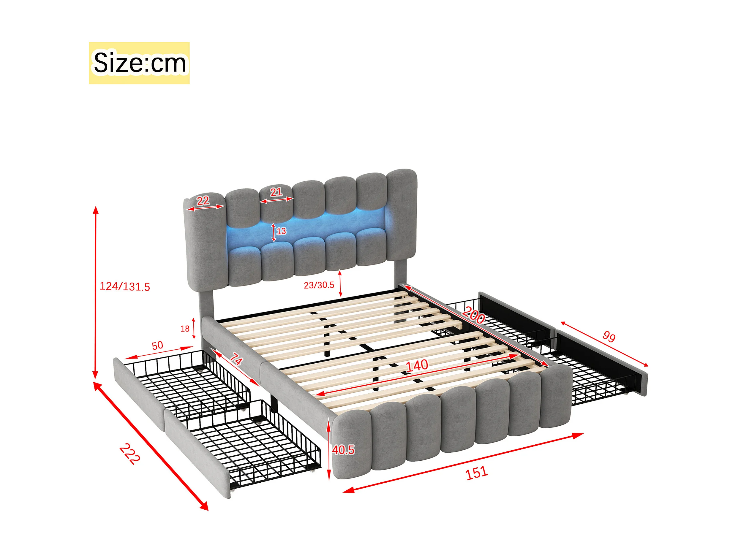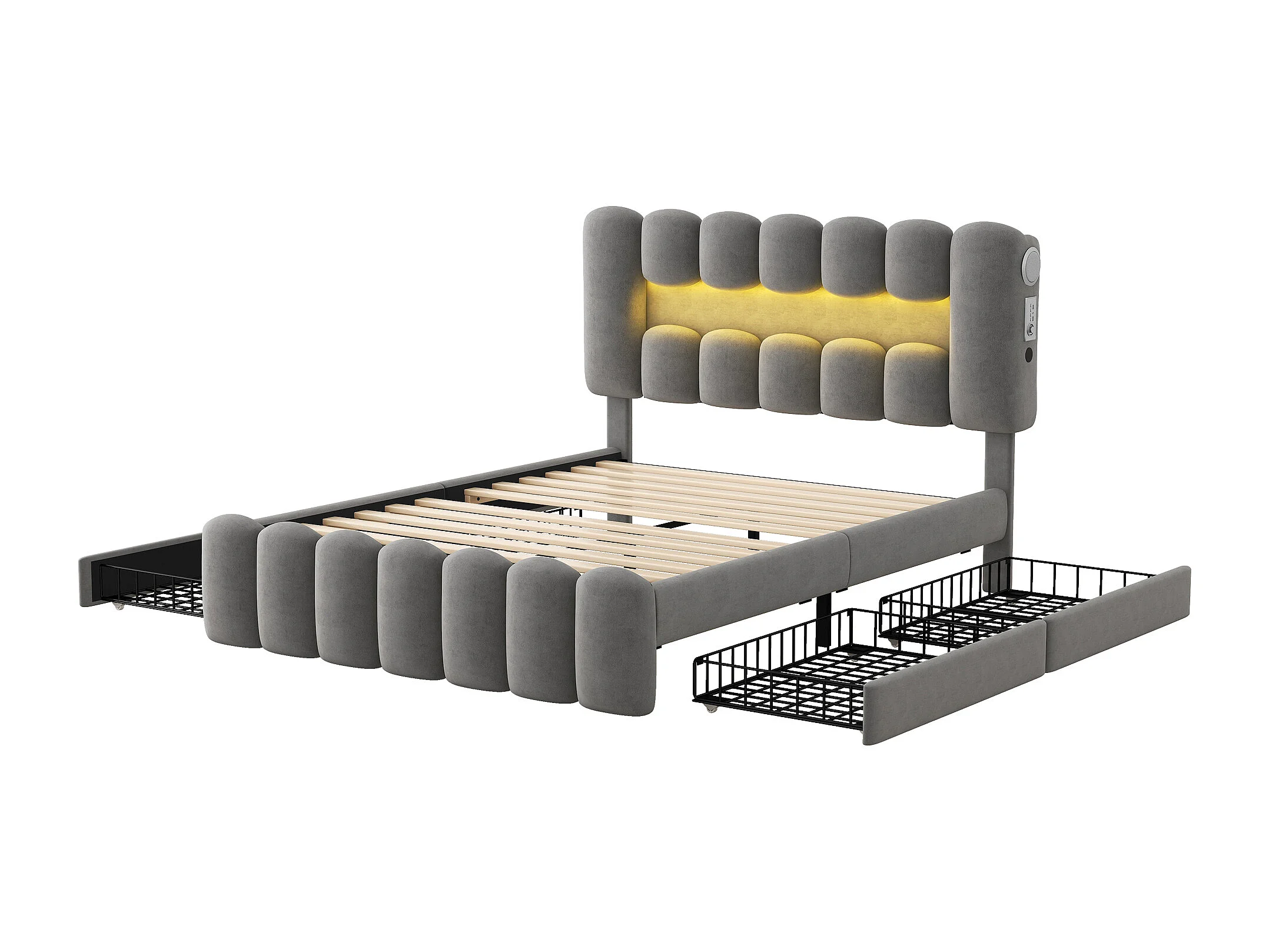 Gepolsterd bed in grijs fluweel - 140x200cm - 4 lades + LED + USB + Speakers - verstelbare hoofdeinde