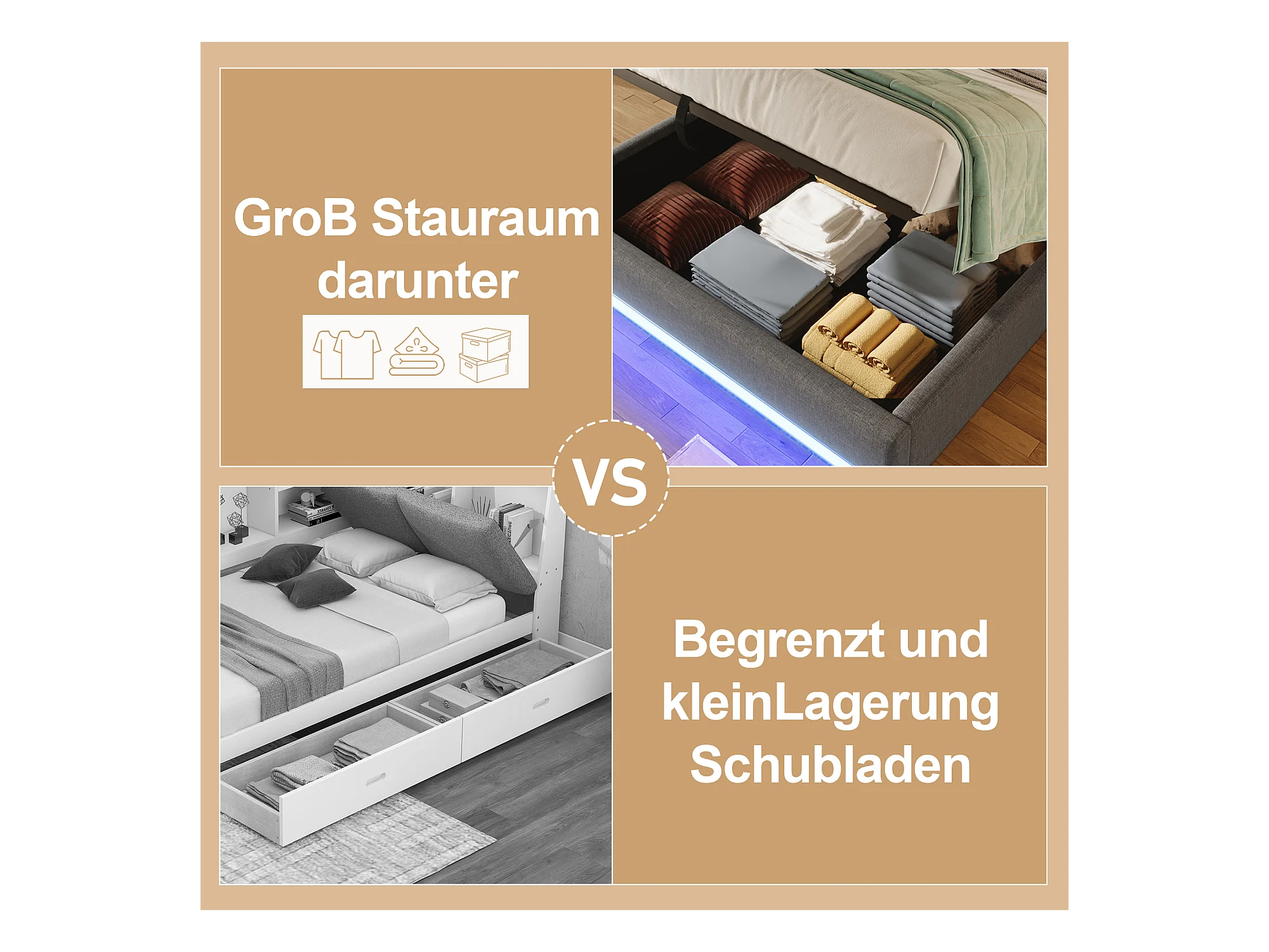 Gestoffeerd bed 140 x 200 cm, met afstandsbediening LED, USB en Type-C, kleine opbergvakken, zonder hoofdeinde, hydraulische opbergfunctie (203x141,5x32 cm)