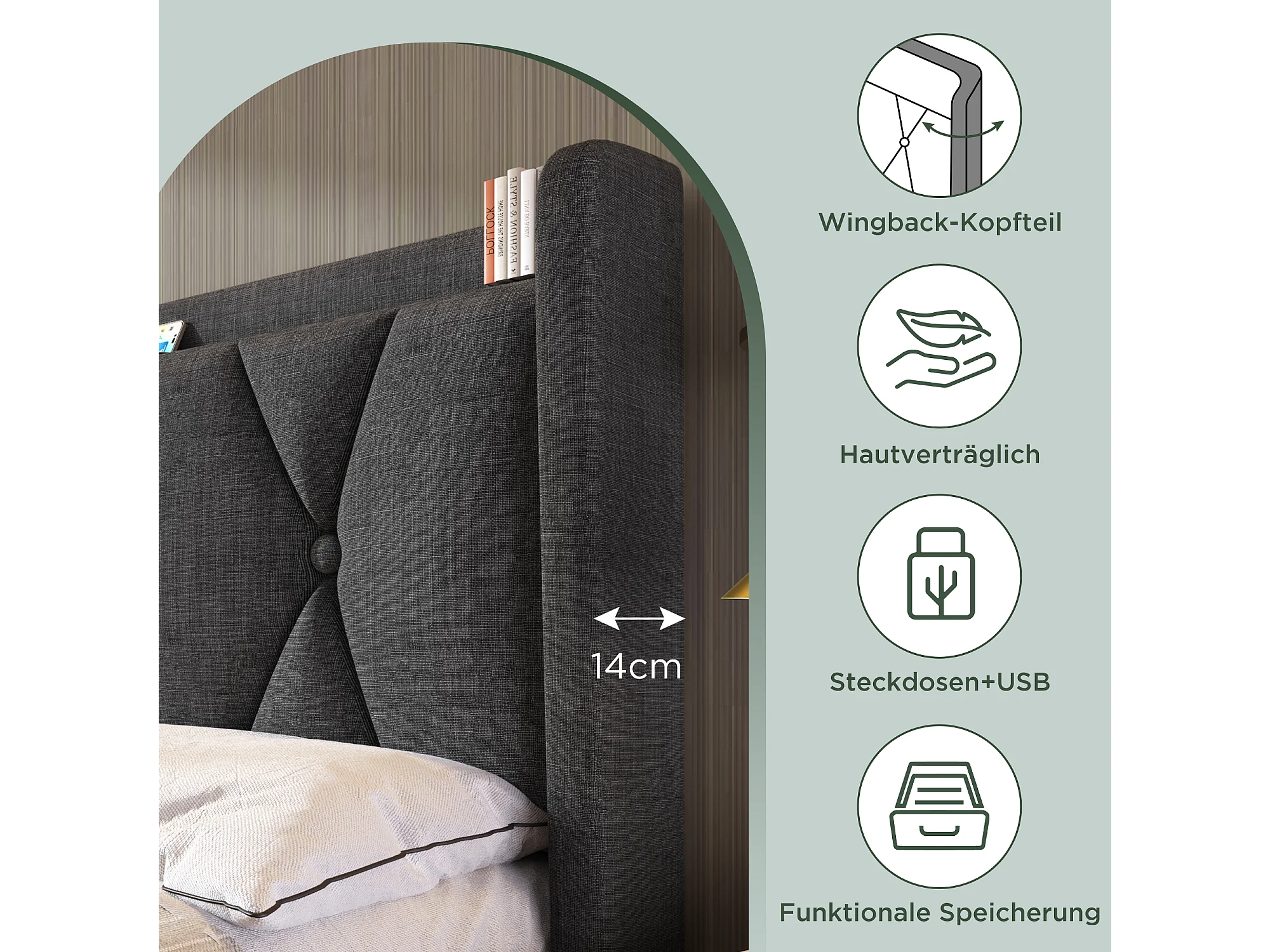 Gestoffeerd bed 140 x 200 cm met hoofdeinde en 4 lades - USB - linnen stof - grijs + Matras