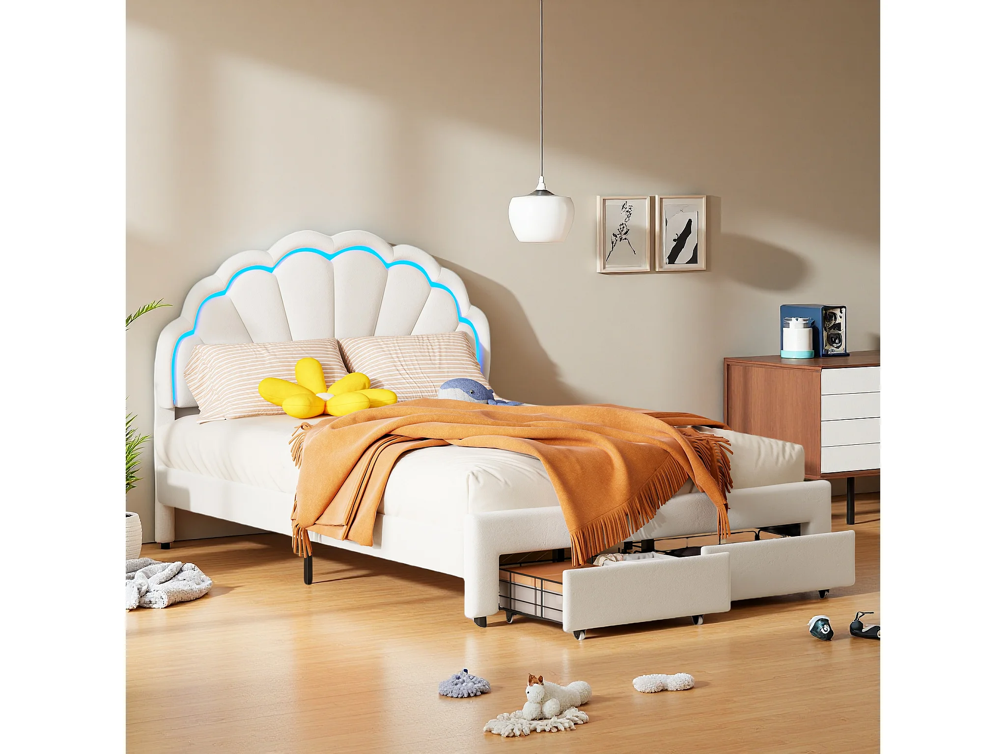 Gestoffeerd bed voor volwassenen met LED en USB, 4 lades, lattenbodem, fluweel, 140x200cm, beige