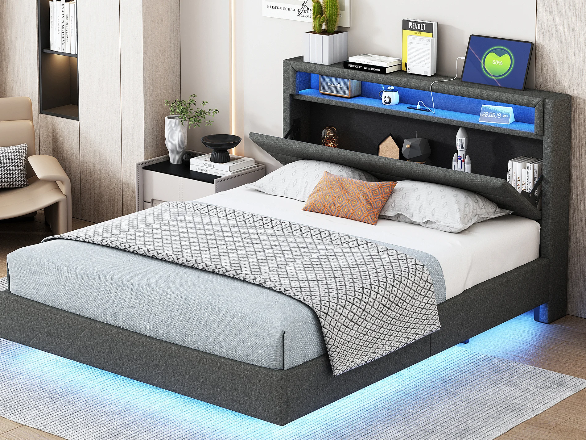 Gestoffeerd bed 140 x 200 cm - USB-aansluiting + LED's - omkeerbaar hoofdeinde - linnen stof - grijs