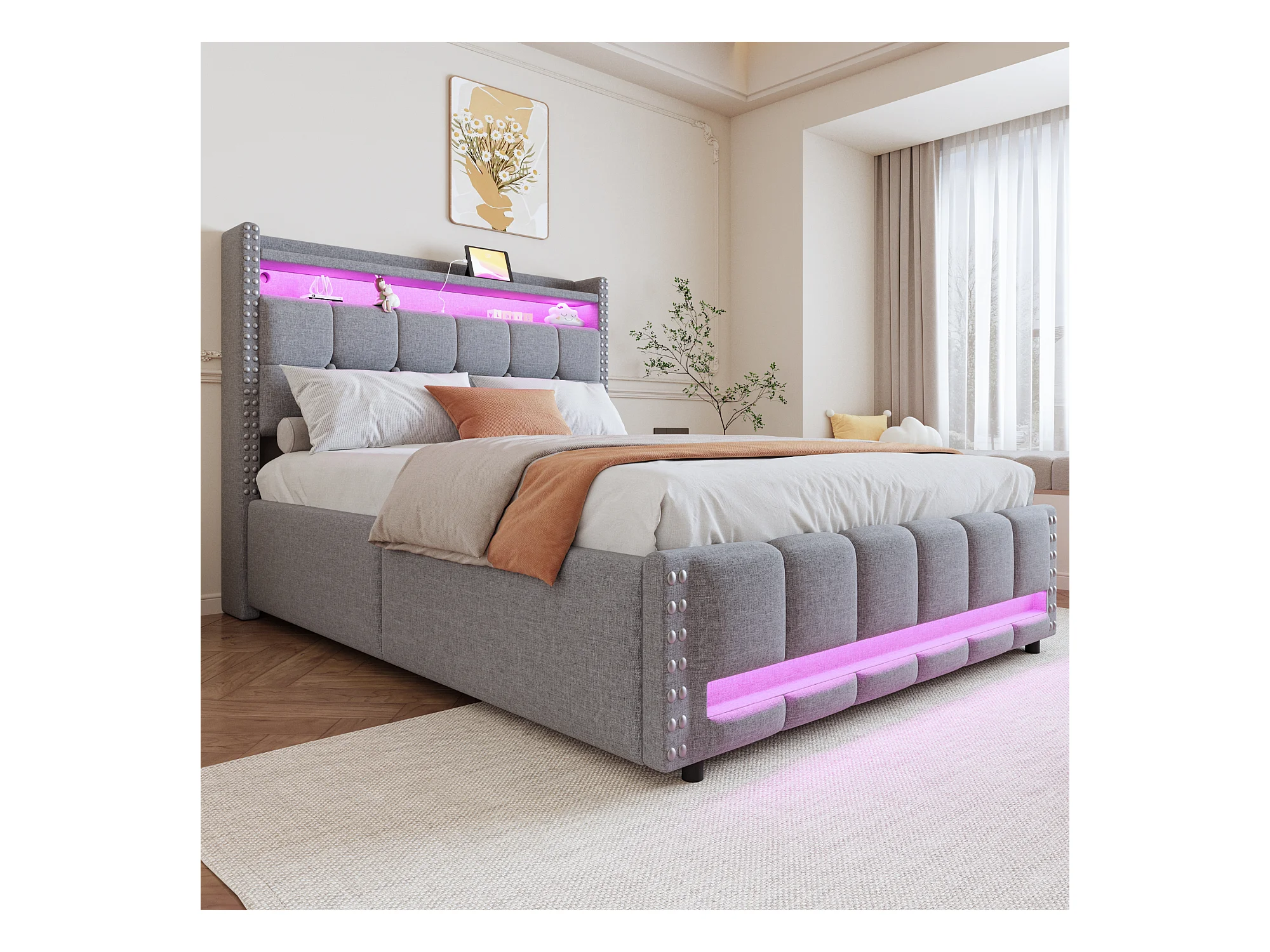 Tweepersoonsbed met opbergvak, hoofdeinde met USB Type-C-oplaadfunctie, grijs linnen (166x208x107 cm)