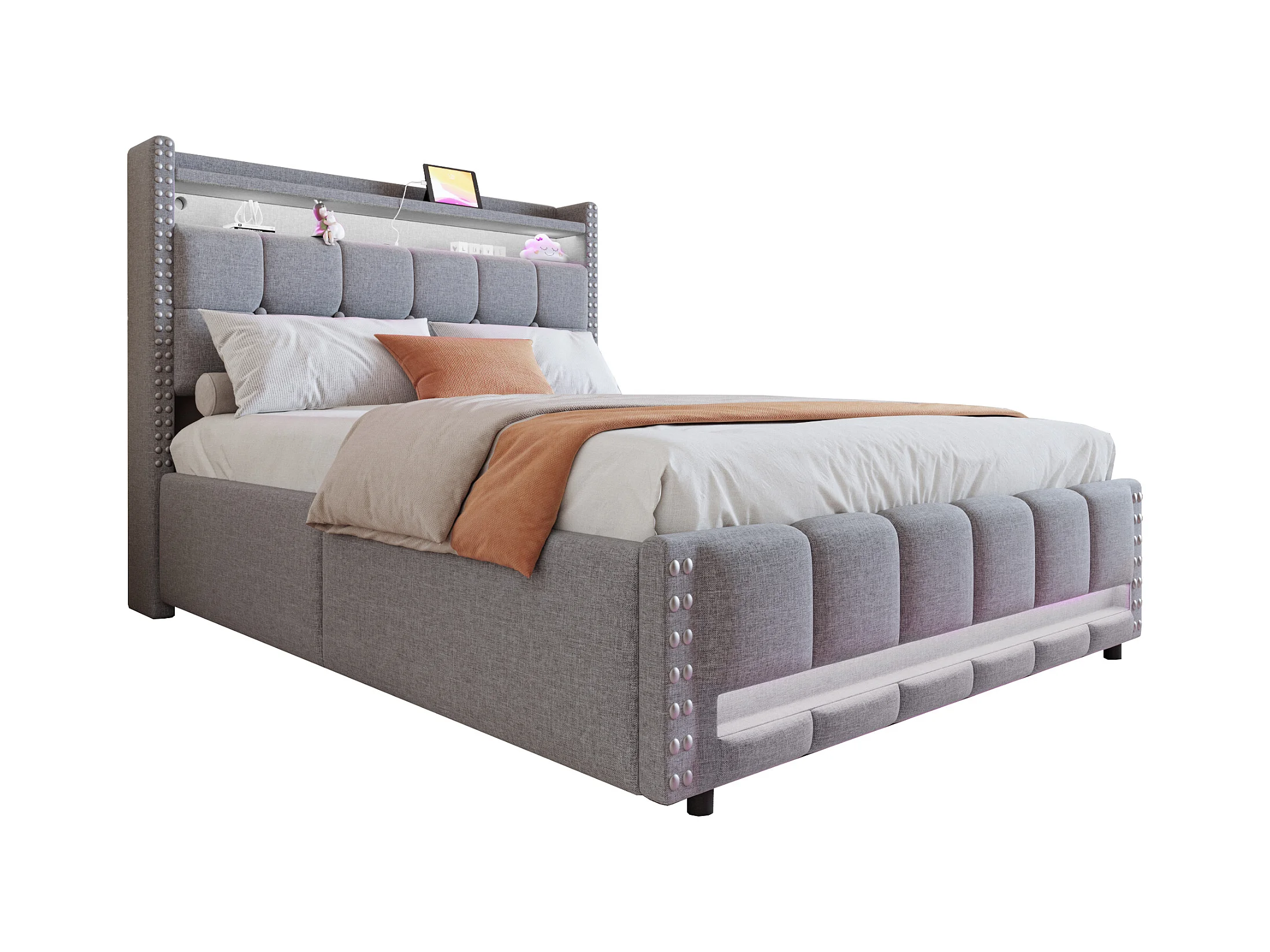 Bed 140 x 200 cm met LED en USB, hoofdbord met opbergruimte en 4 lades, grijze linnen stof (221 x 150 x 115 cm)