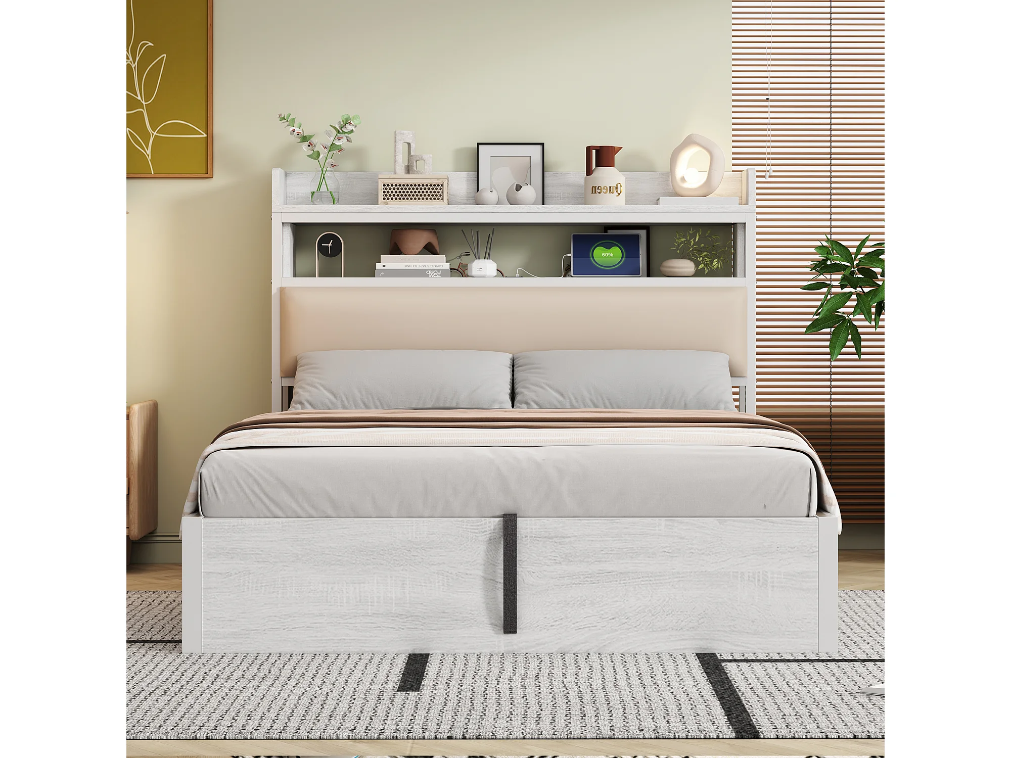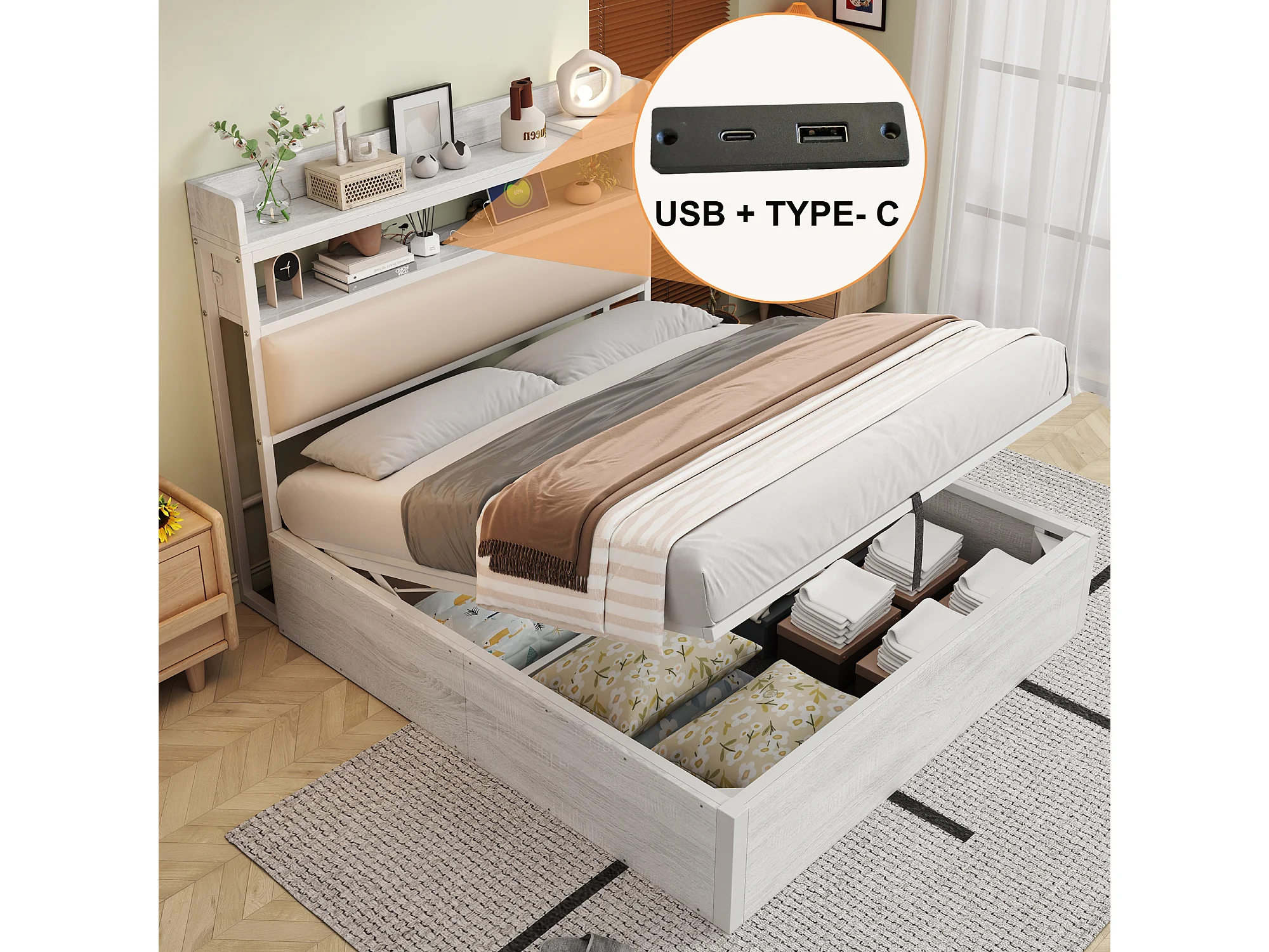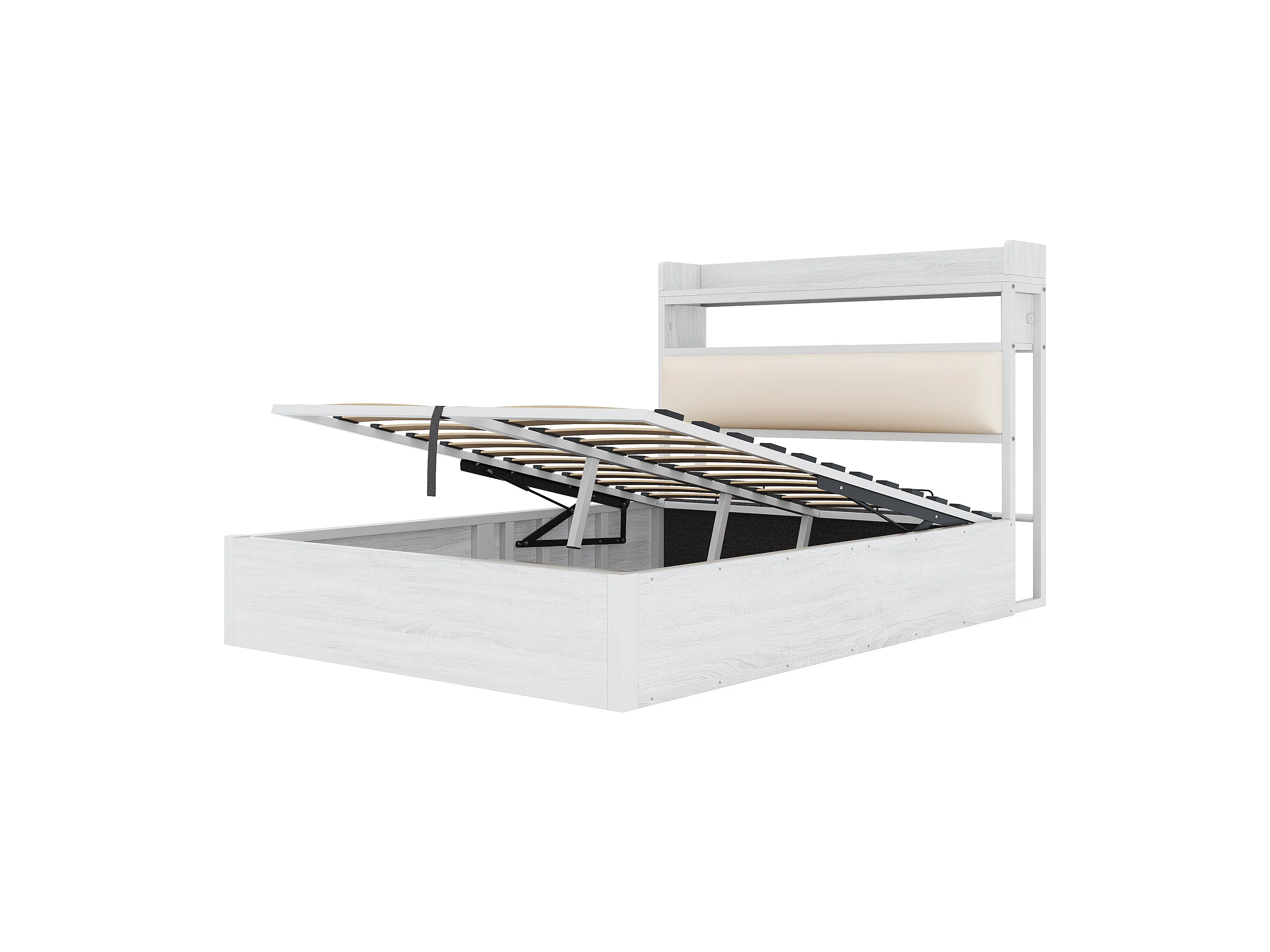 Gestoffeerd Bed 140x200cm - Hydraulisch Opbergbed Met USB - Met Verdekte Opbergruimte - Metaal;Hout - Wit - Zonder matras