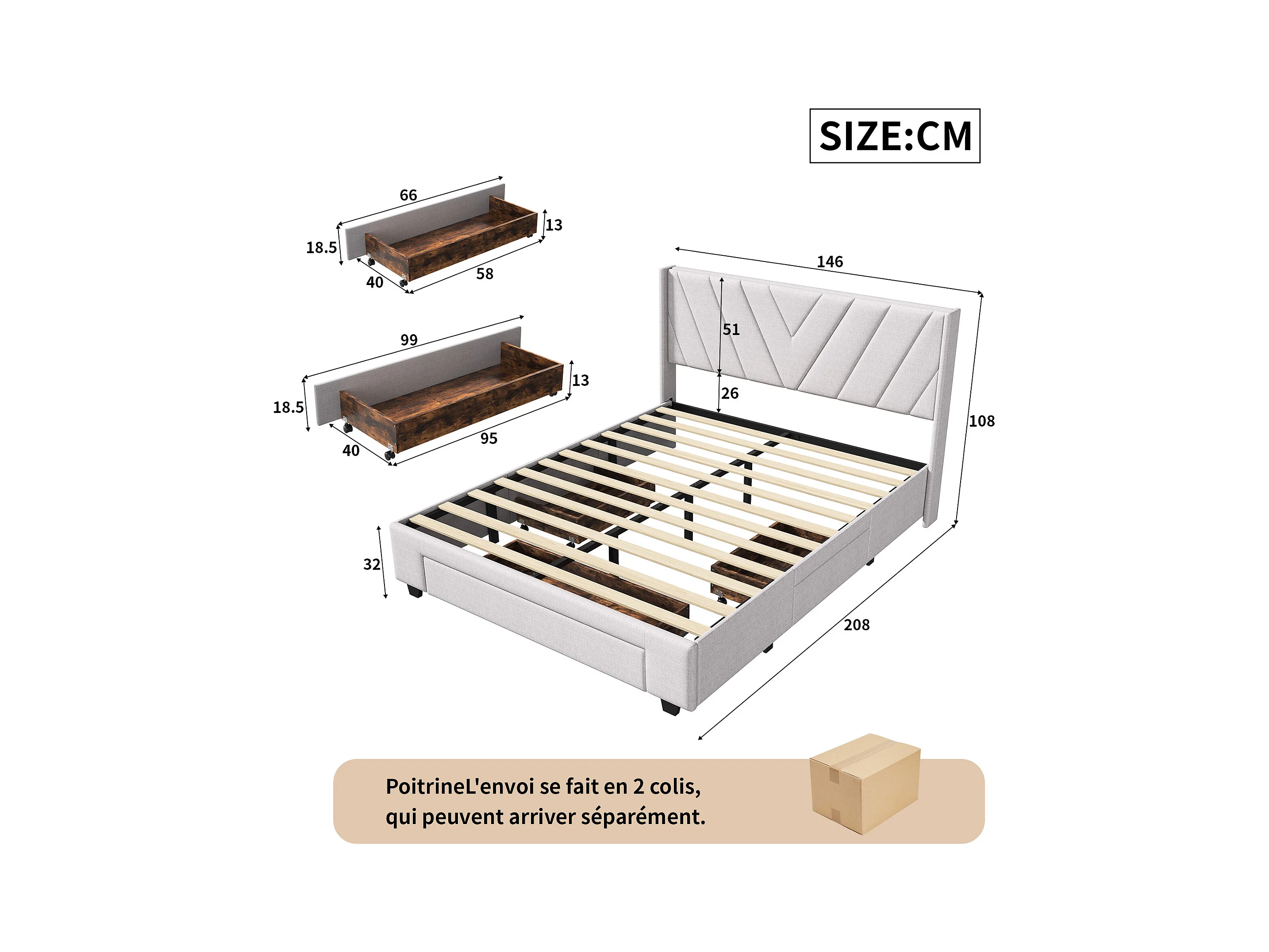Gestoffeerd bed 140x200cm in linnen met 3 lades + lattenbodem - Beige