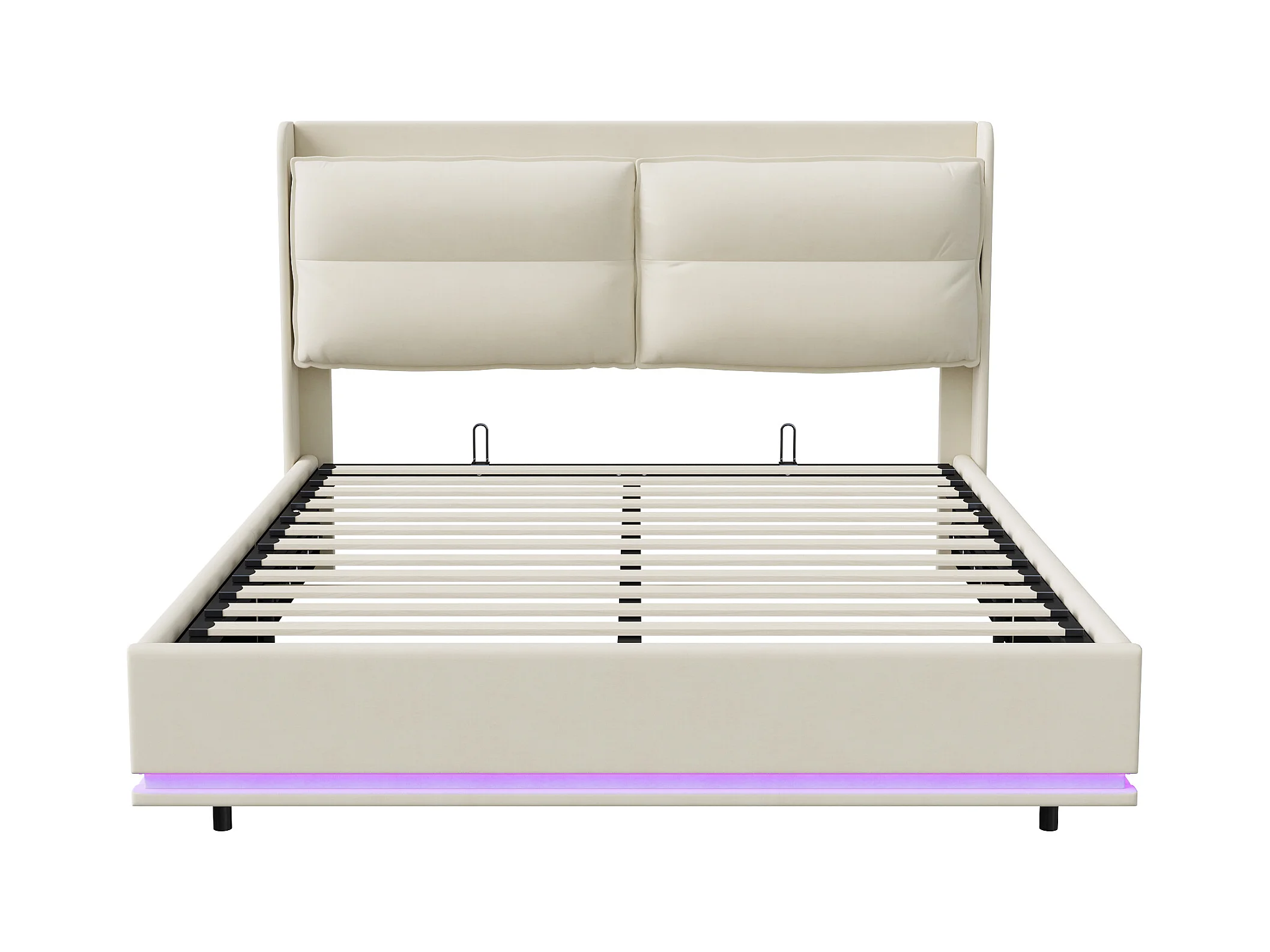 Gestoffeerd bed 140x200 met LED en opbergruimte, Gestoffeerde bedden met lattenbodem, Fluweel, Beige