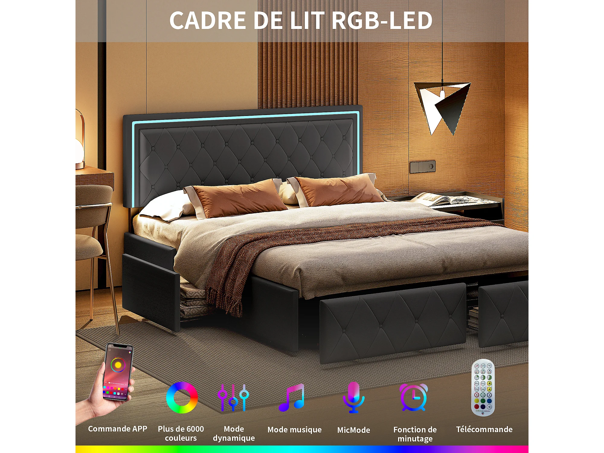 Gestoffeerd bed 140x200cm met LED, met 4 opbergladen, met lattenbodem, PU, grijs