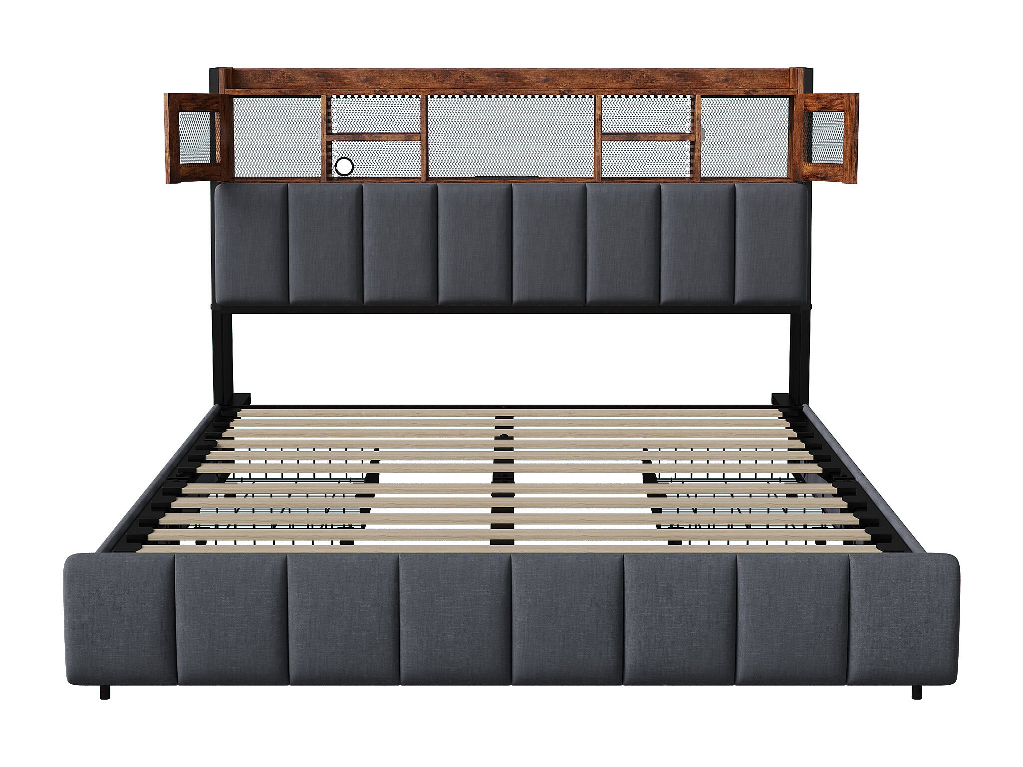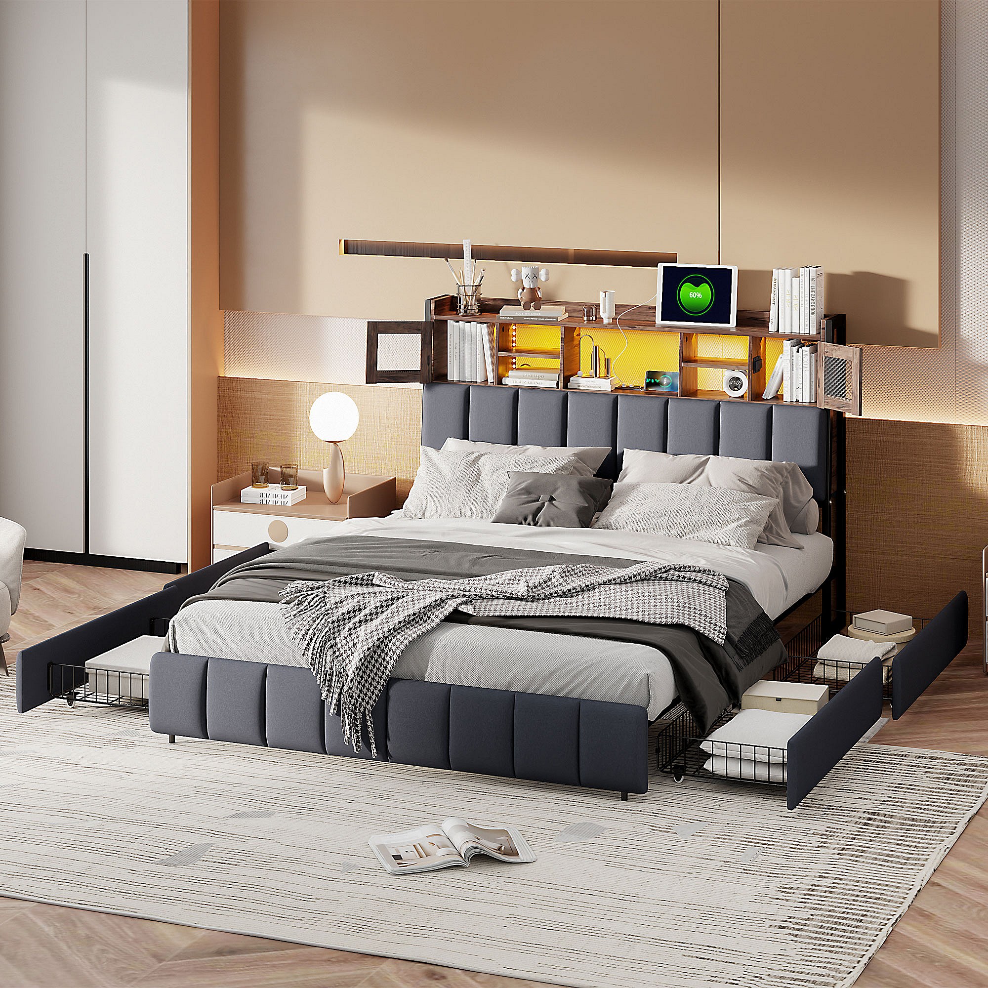Gestoffeerd bed 140x200cm met USB en stopcontacten, tweepersoonsbed met 4 lades, opbergbed met LED, linnen, zwart