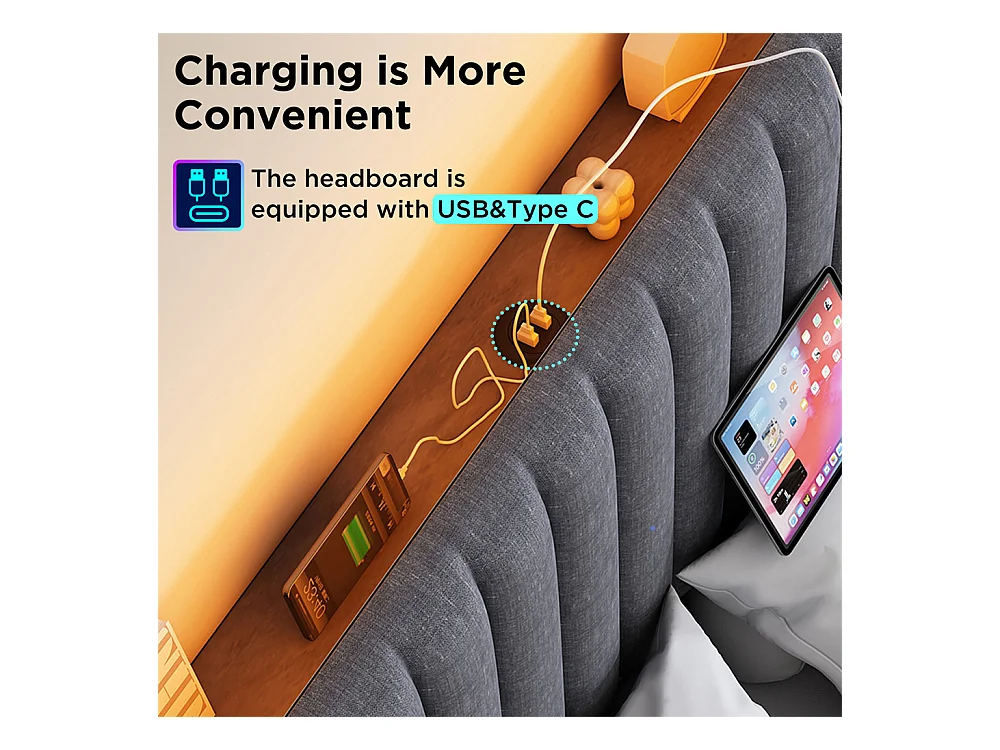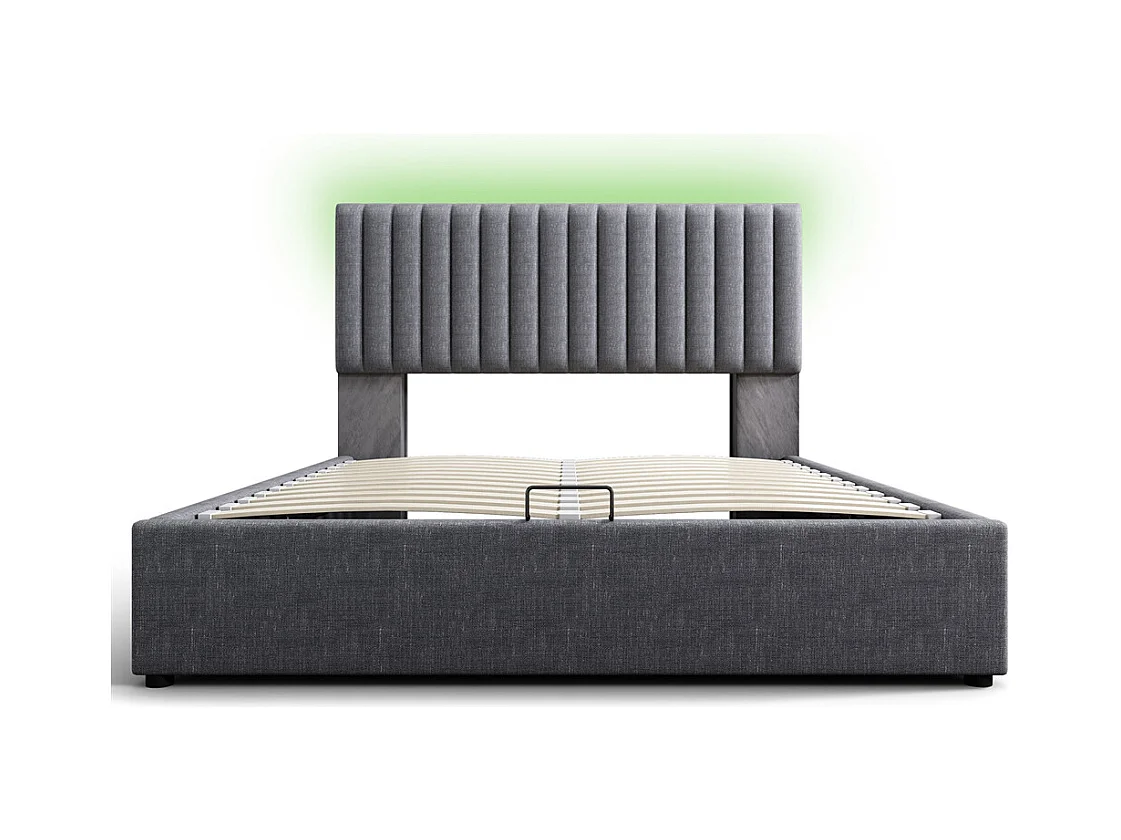 Tweepersoonsbed met USB Type-C, app-gestuurde LED, opbergruimte aan het hoofdeinde, linnen, grijs (161x213x106cm)